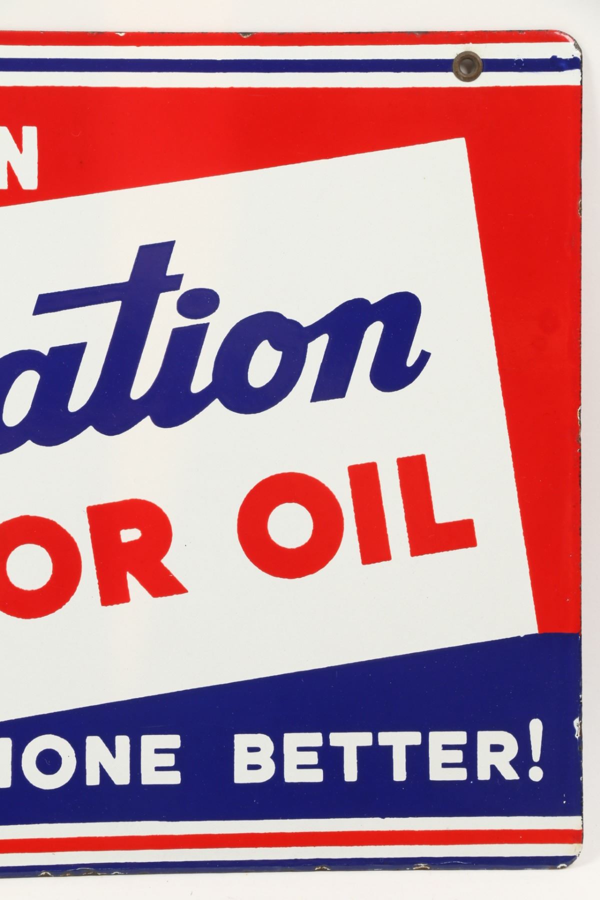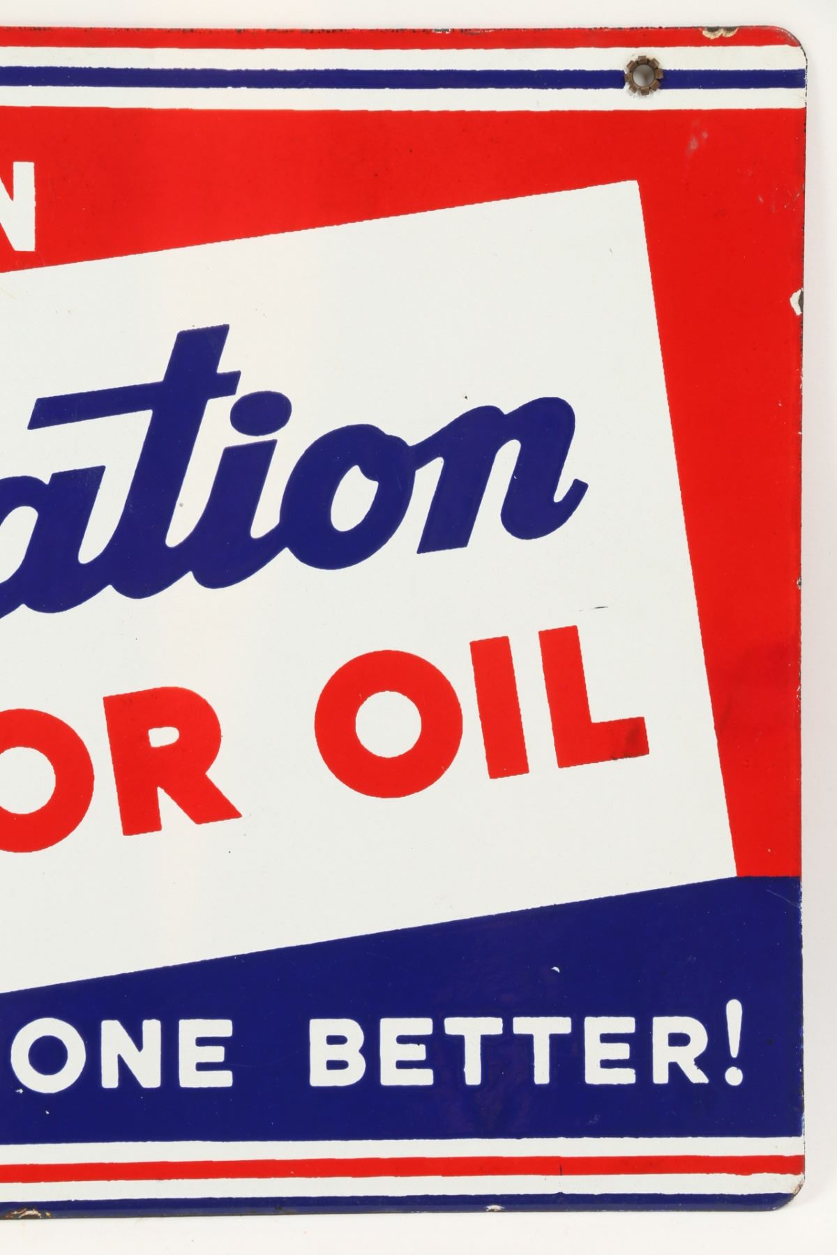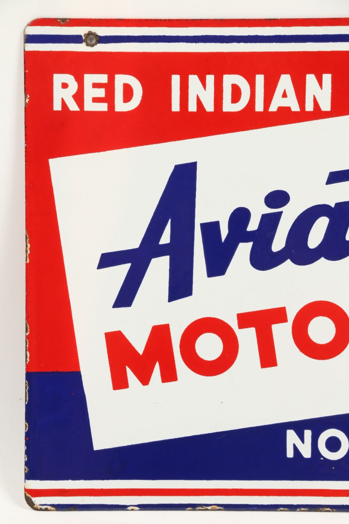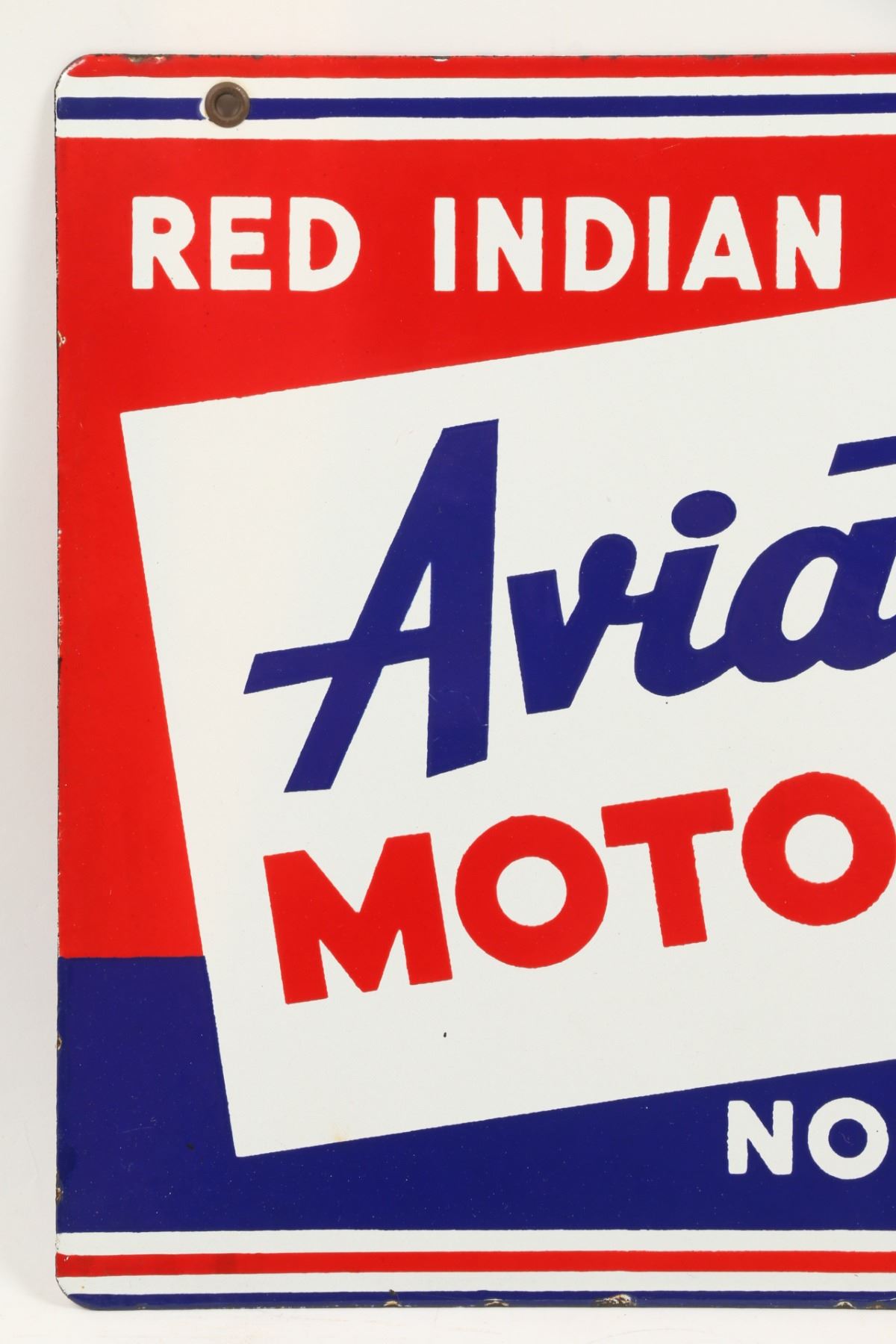 Canadian. Circa 1930. Two-sided. Red Indian "Aviation" Motor Oil. 14" x 11". Minor edge chips. $2000-2500.