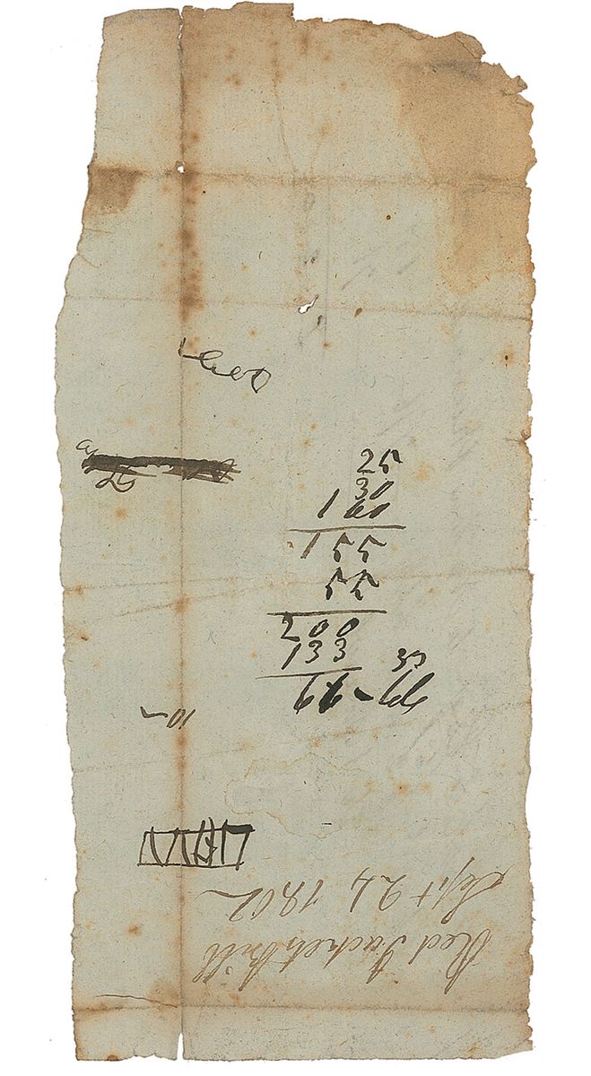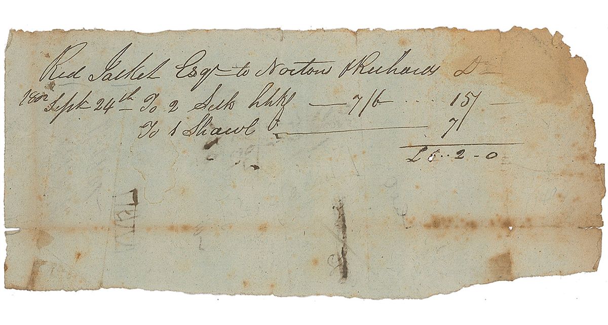 Native American Seneca orator and chief of the Wolf clan whose Indian name was Sagoyewatha (c.1758–1830). An unsigned manuscript receipt, one page, 7.5 x 3.5, dated September 24, 1802. An invoice from Canandaigua merchants Norton and Richards for two silk handkerchiefs and "1 Shawl" for the sum of £6-2-0. Intersecting folds, scattered toning, soiling, and foxing, light overall creasing and wrinkling, a few small spots of ink erosion, and light show-through from notations on reverse, otherwise very good condition.