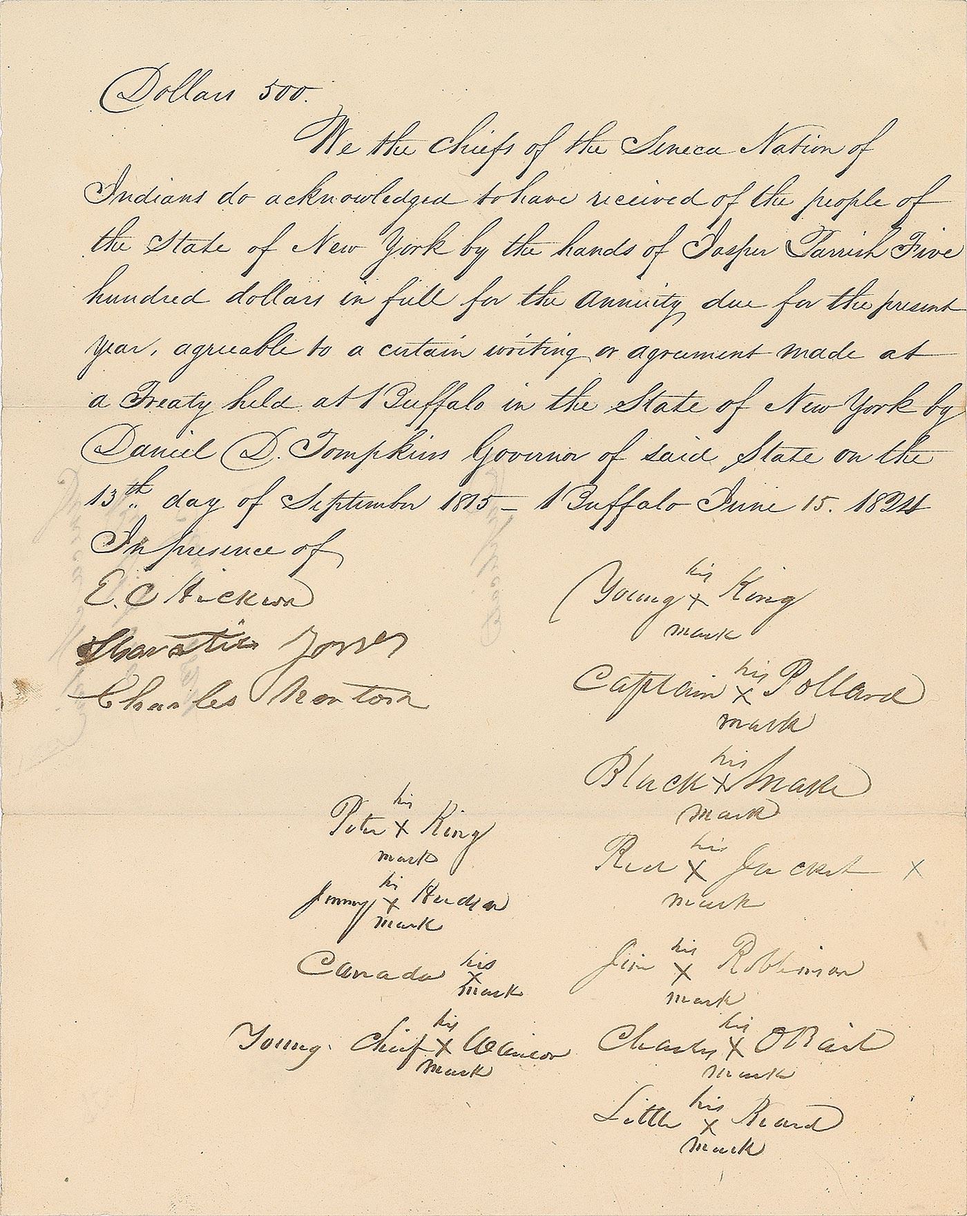 Native American Seneca orator and chief of the Wolf clan (c.1758–1830) whose Indian name was Sagoyewatha. Very rare manuscript DS, one page, 8 x 10, June 15, 1824. Annuity receipt issued by the chiefs of the Seneca Nation, in full: "We the chiefs of the Seneca Nation of Indians do acknowledge to have received of the people of the State of New York by the hands of Jasper Parrish Five hundred dollars in full for the annuity due for the present year, agreeable to a certain writing or agreement made at a Treaty held at Buffalo in the State of New York by Daniel D. Tompkins Governor of said State on the 13th day of September 1815." Red Jacket signs with his "X" mark below his printed name, as do ten other Seneca chiefs, including: Young King, Captain Pollard, Black Snake, Jim Robinson, Charles O’Bail, Little Beard, Peter King, Jimmy Hudson, Canada, and Young Chief Welincor. Three witnesses have signed the document on the left side: E. C. Hickson, Charles Norton, and former Indian captive and interpreter Horatio Jones. In fine condition.