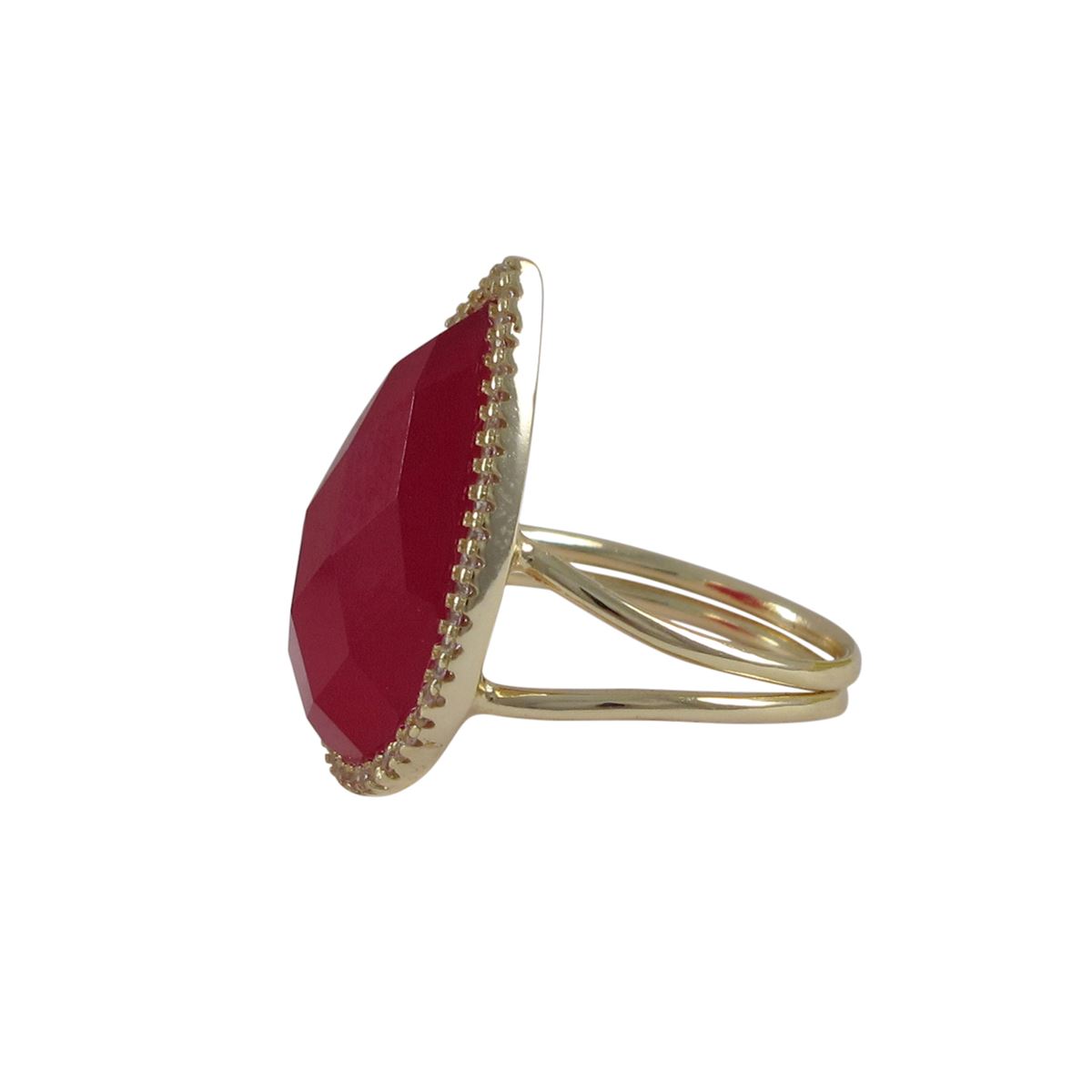 Red Jade Semi Precious 13X20 Faceted Teardrop Stone, Gold Plated Sterling Silver CZ Adjustable Ring, Size 5-9