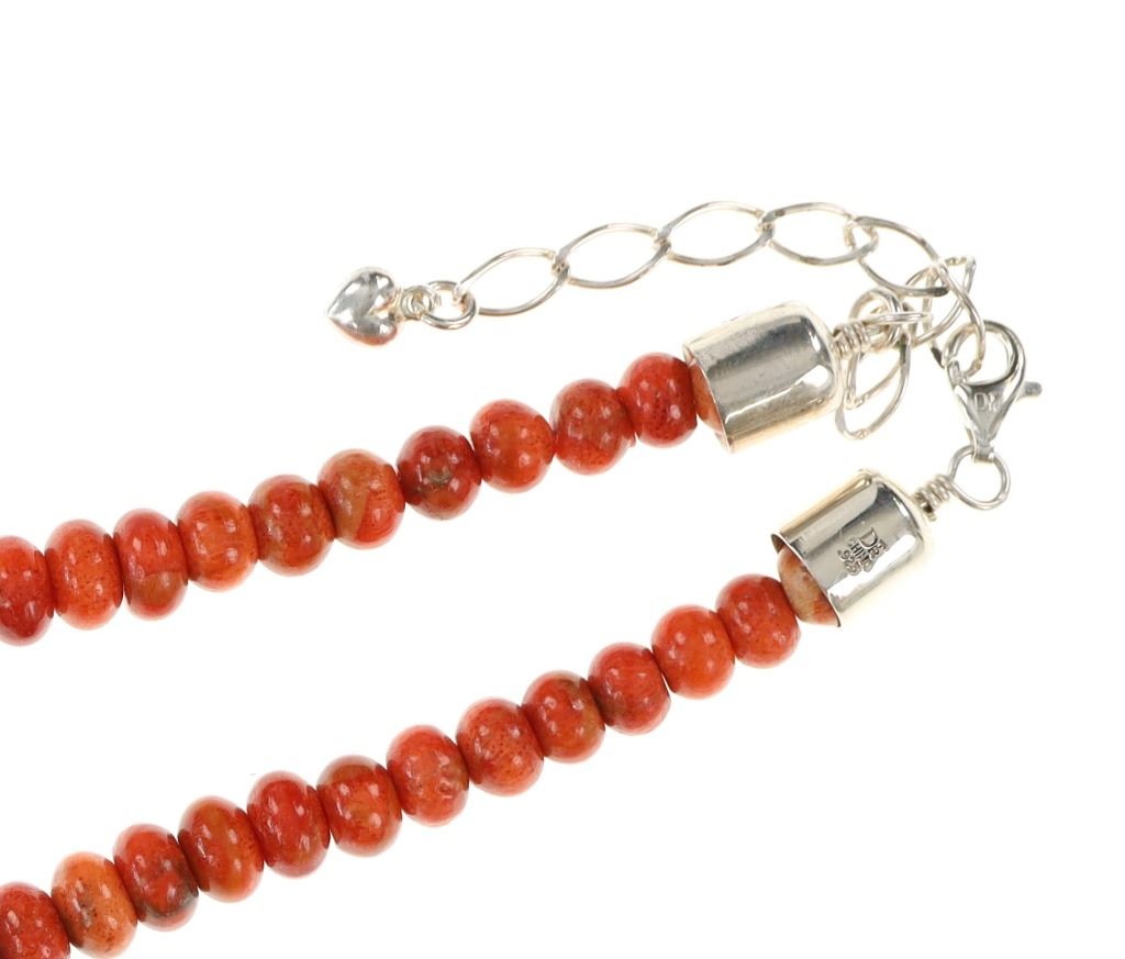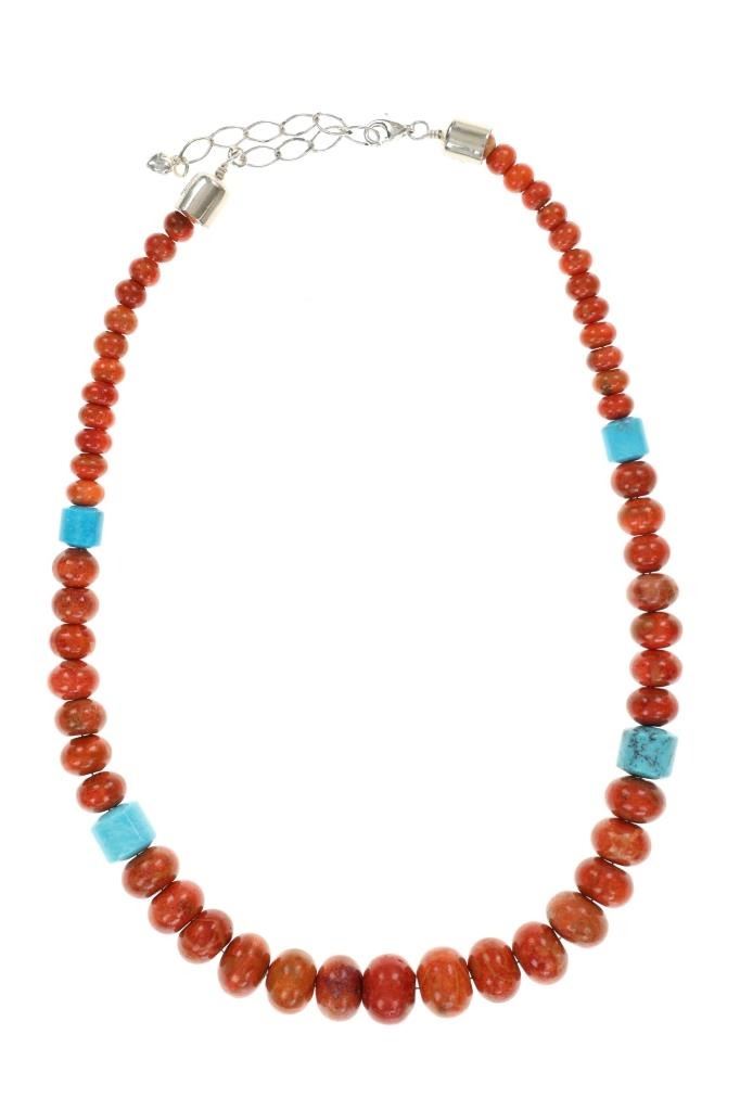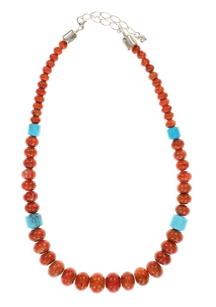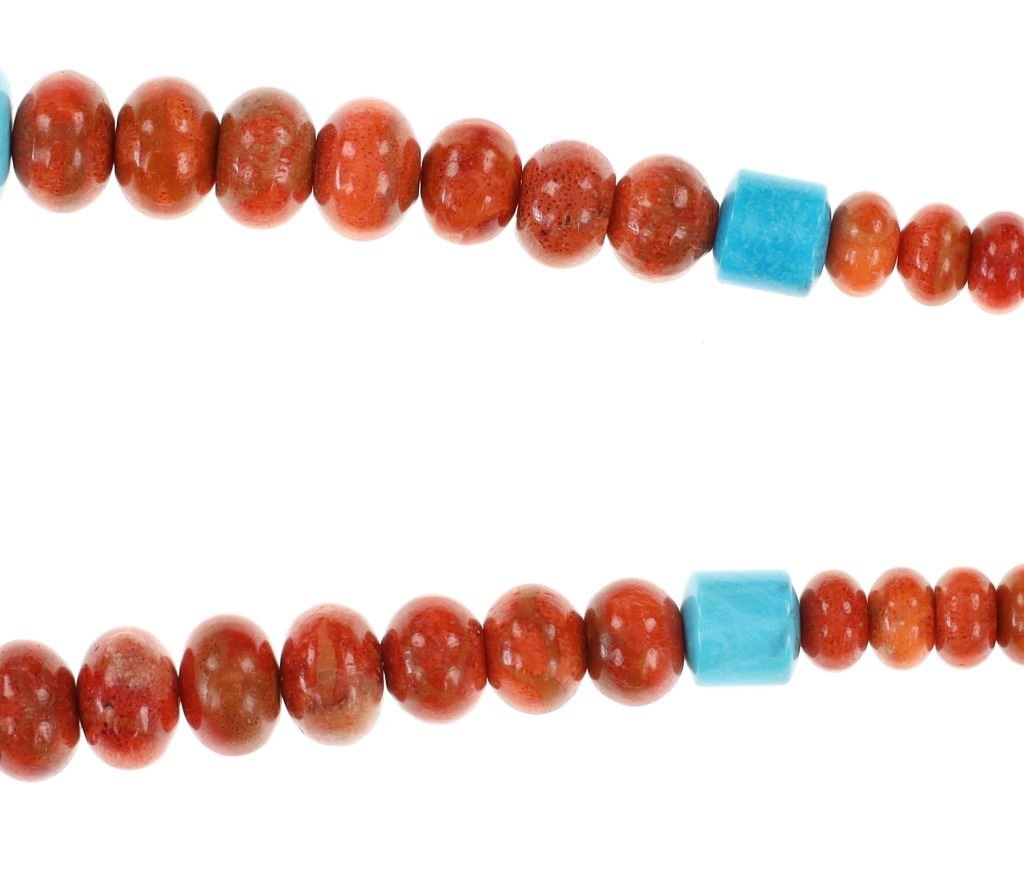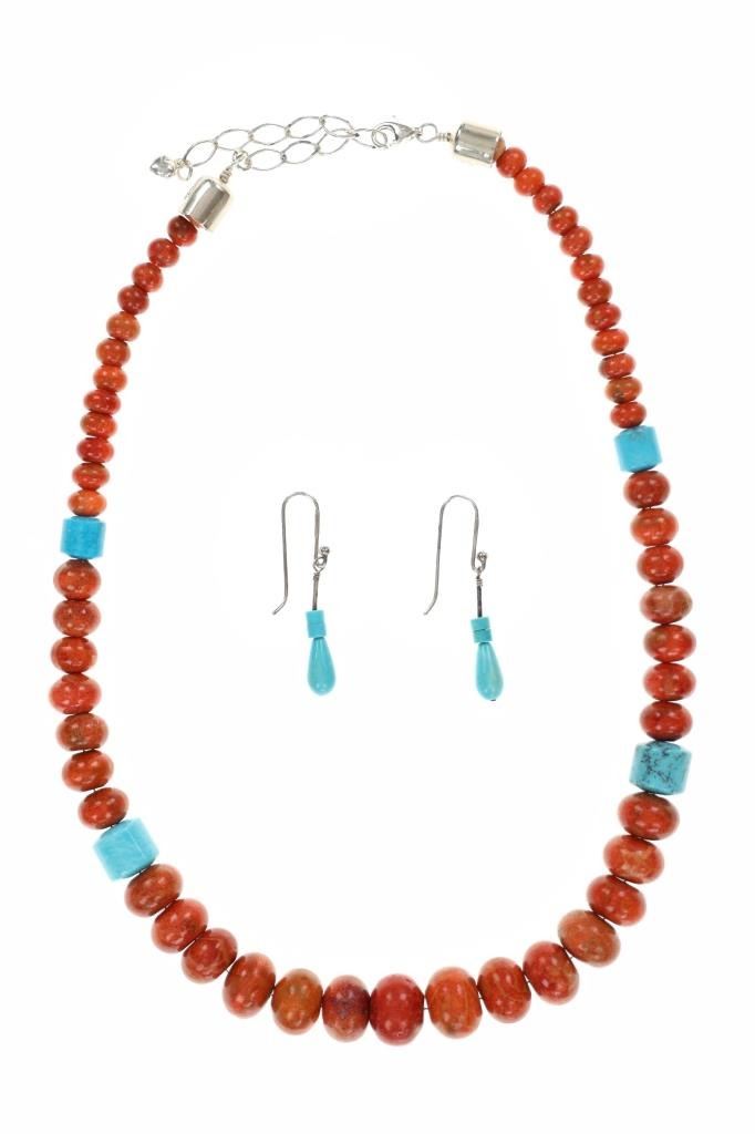 Featured in this lot is this red jasper and turquoise graduated necklace earrings. There is a necklace and pair of earrings in this collection. The necklace shows spherical graduated red jasper and cylindrical beads with a clasp and a chain made from sterling silver and is marked as follows: .925. The earrings shows tear drop turquoise beads with cylindrical turquoise beads above it and shows a sterling silver hook clasp and is marked as follows: .925. The condition of this necklace and earring collection is good with no obvious signs of damage and shows good overall condition. The measurements of this necklace is 21 1/4" x 5/8" and the earrings measure 1 3/4" x 5/8". The collective weight of these jewelry is 65.4g.