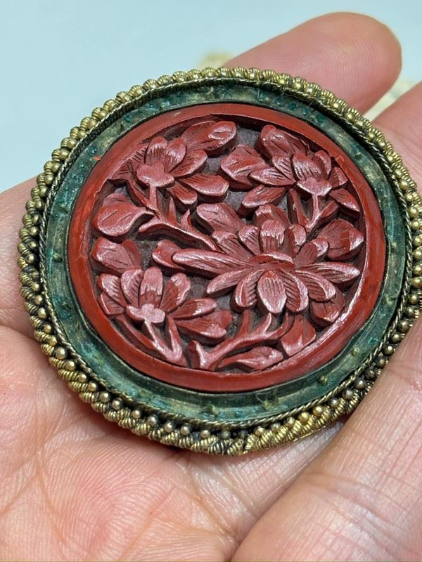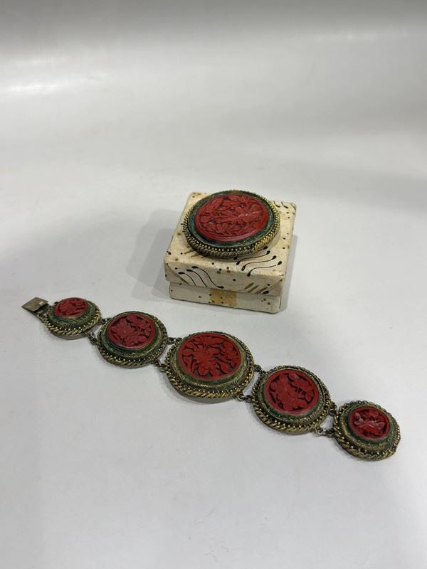 This red lacquer carved bracelet and brooch set demonstrates exquisite traditional craftsmanship. Each piece is made from intricately carved red lacquer, with delicate patterns that enhance the artistic appeal. Whether worn as accessories or kept as a collector's item, this set is captivating.