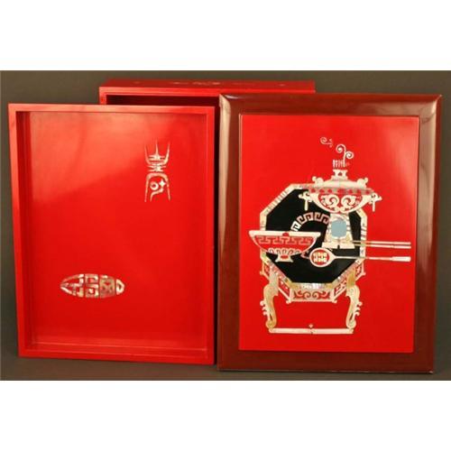 great Korean Masterpiece with mother of pearl inlays creating auspicious symbols. 15x12x4.5 inches, 38x30.5x11.5 cm. Excellent Condition. From a prominent and widely exhibited collection.