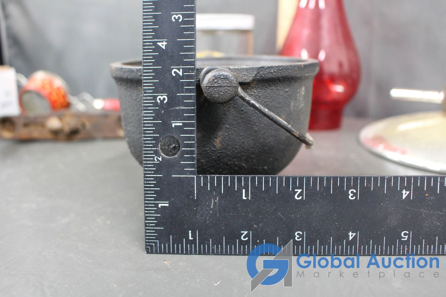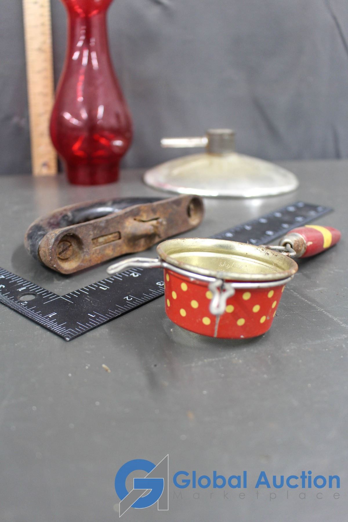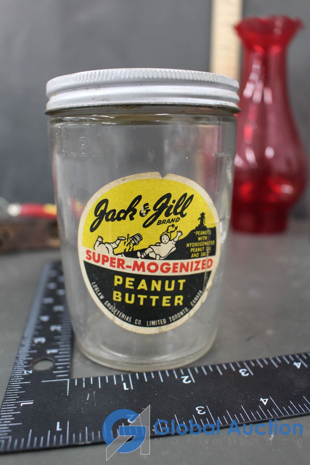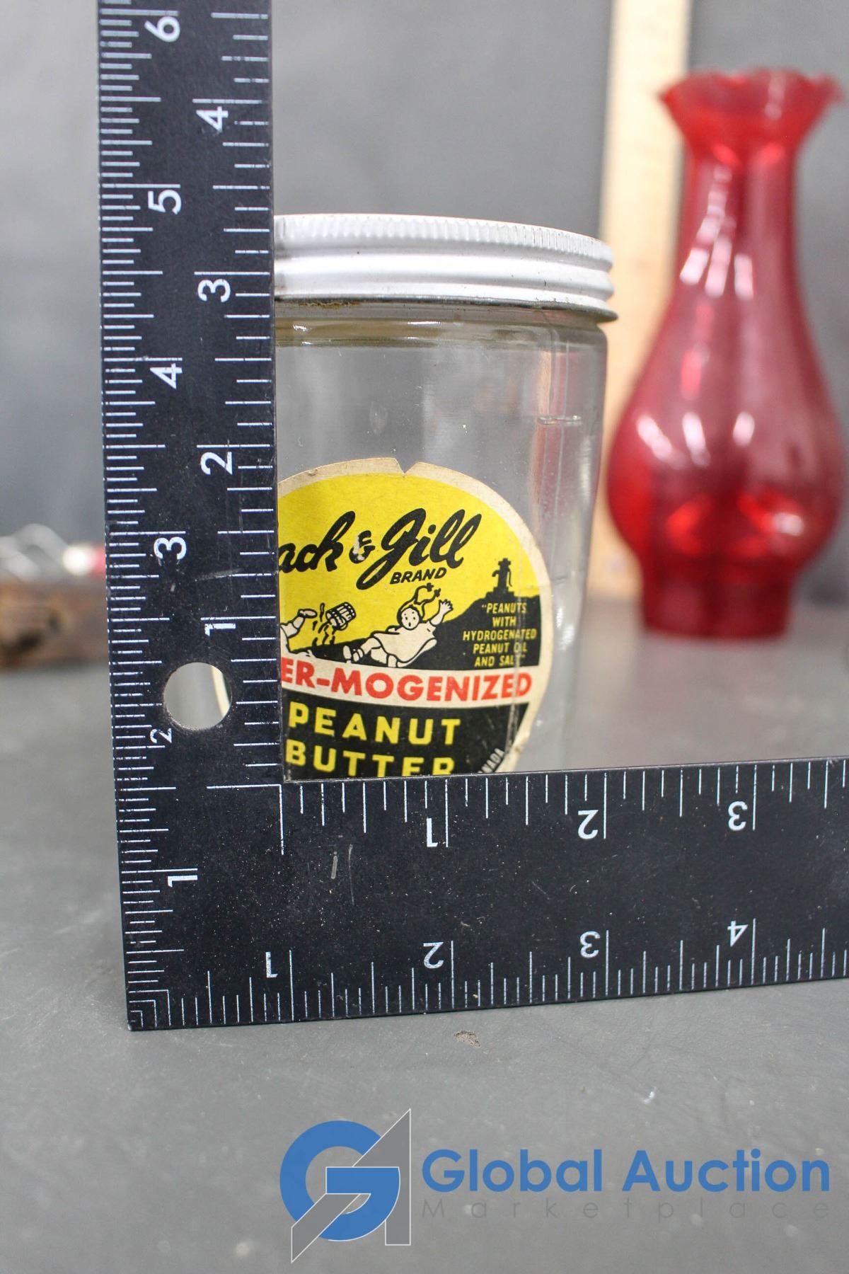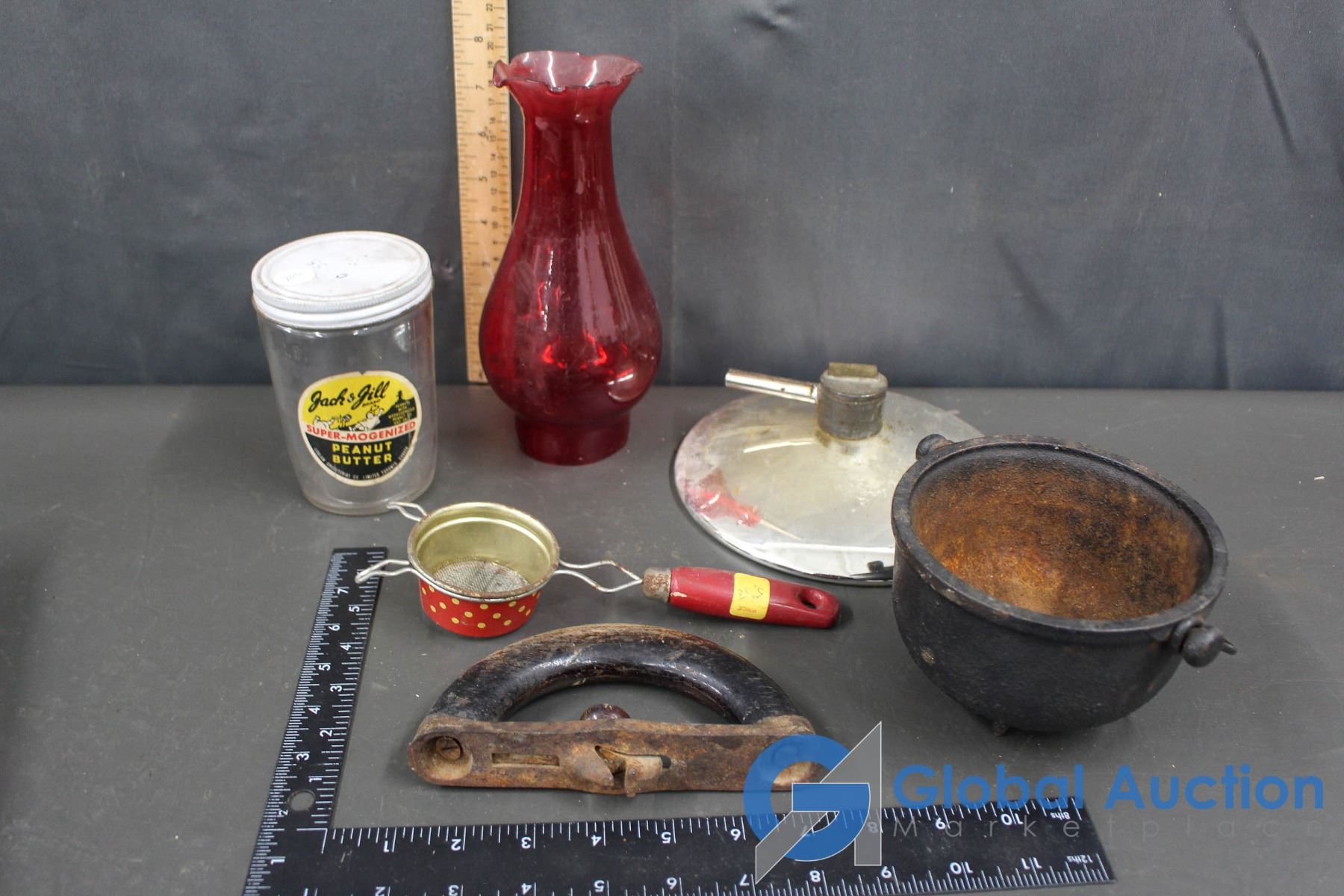 Red Lamp Chimney, Cast Iron Salesman Sample Kettle, & Jack & Jill Peanut Butter Jar
