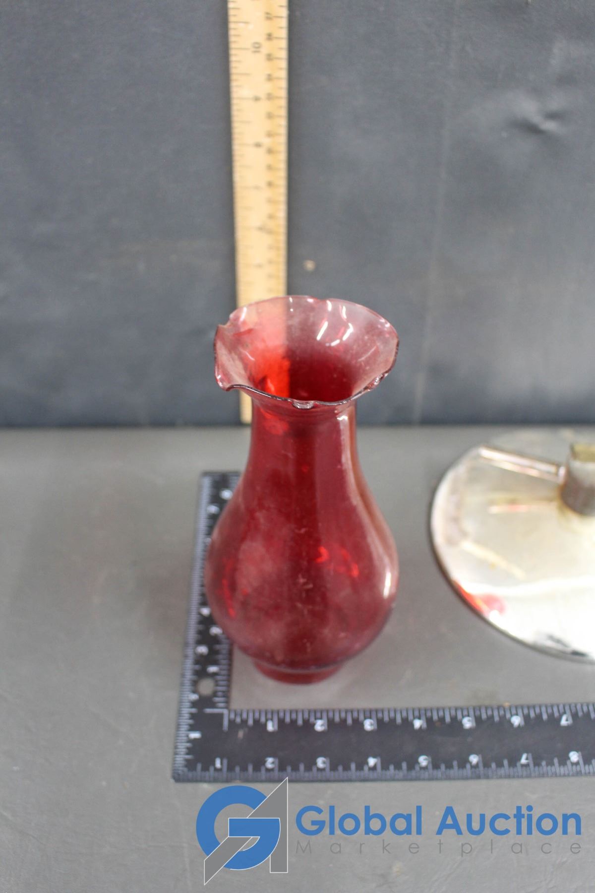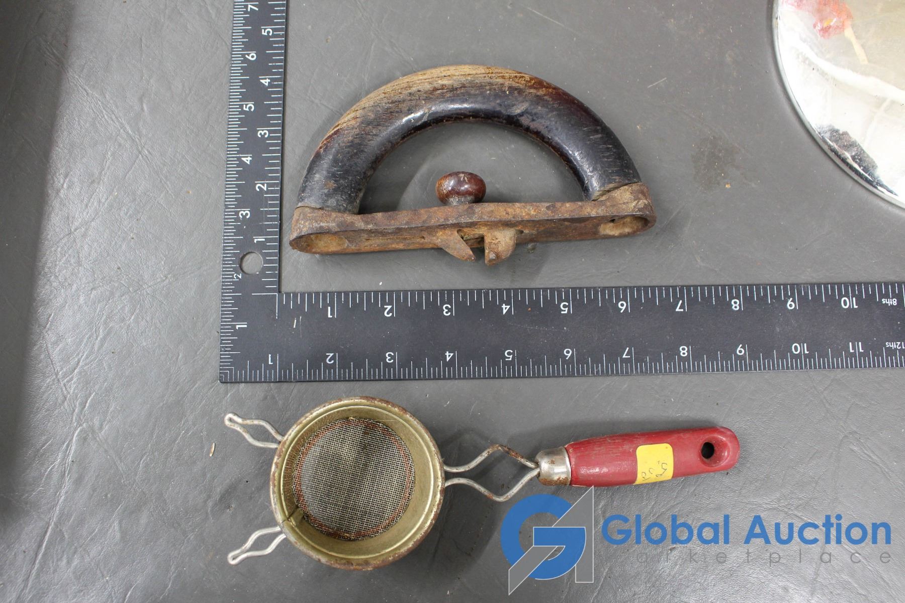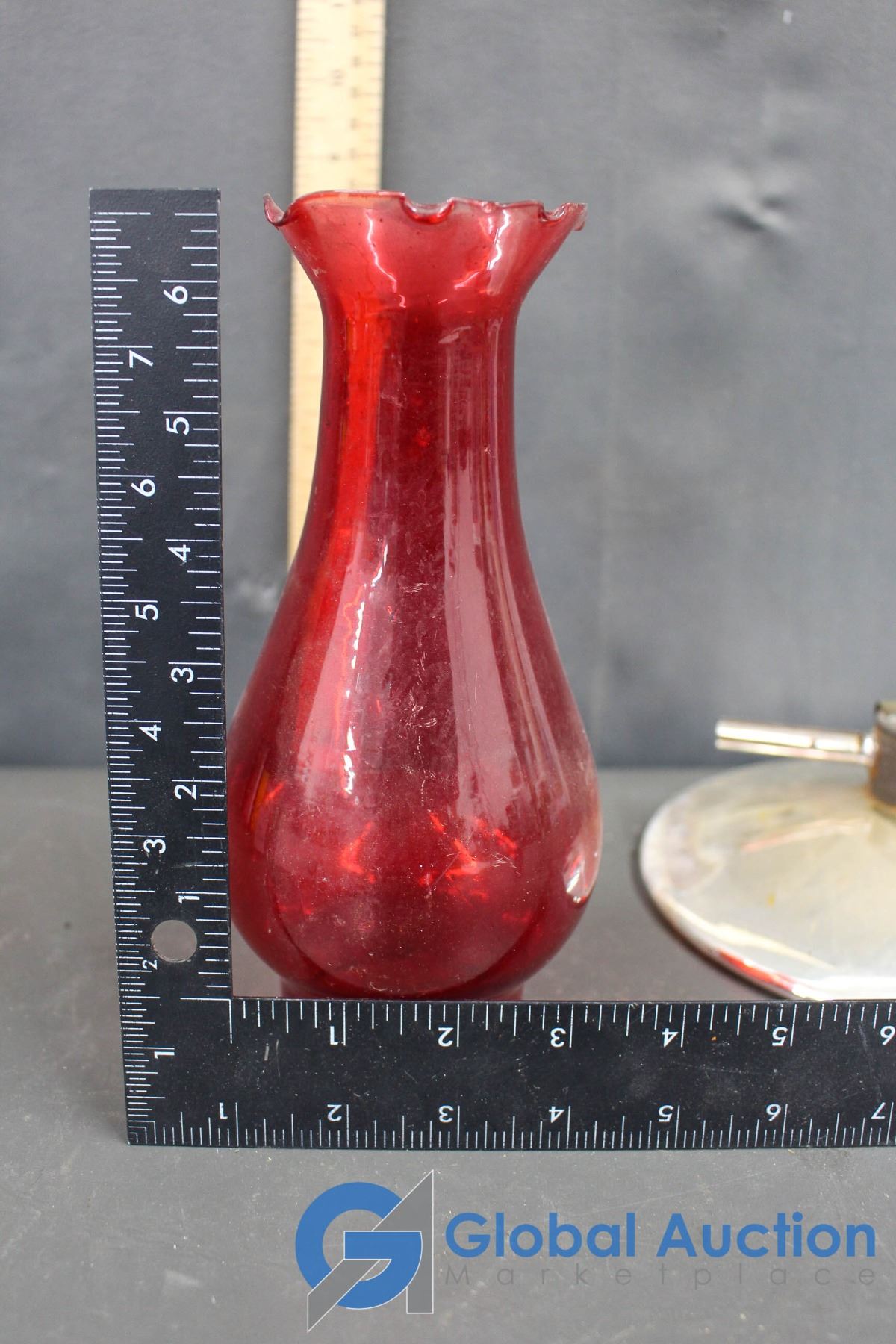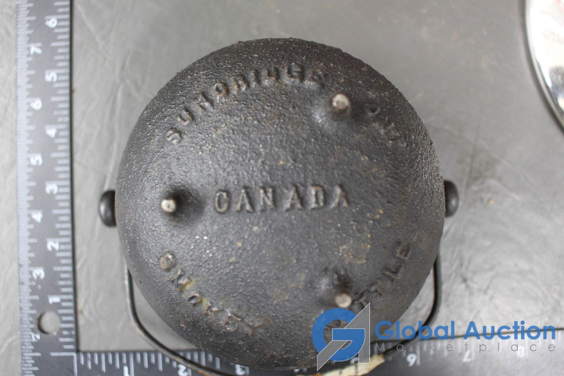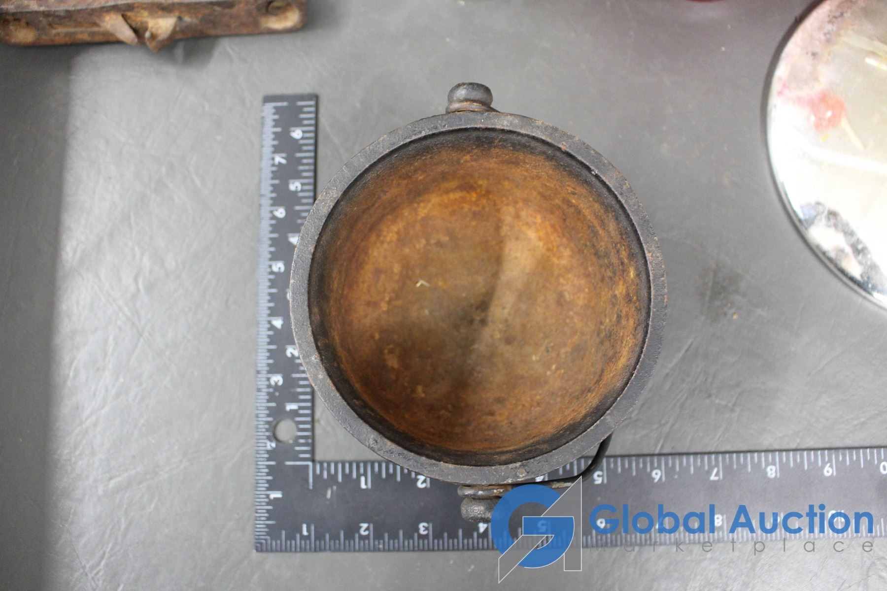 Red Lamp Chimney, Cast Iron Salesman Sample Kettle, & Jack & Jill Peanut Butter Jar