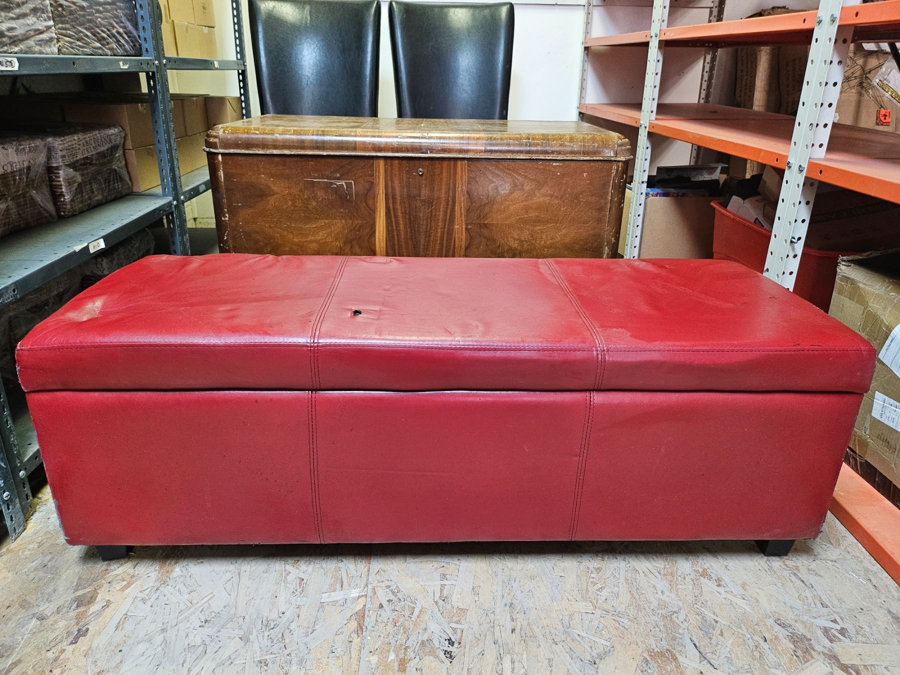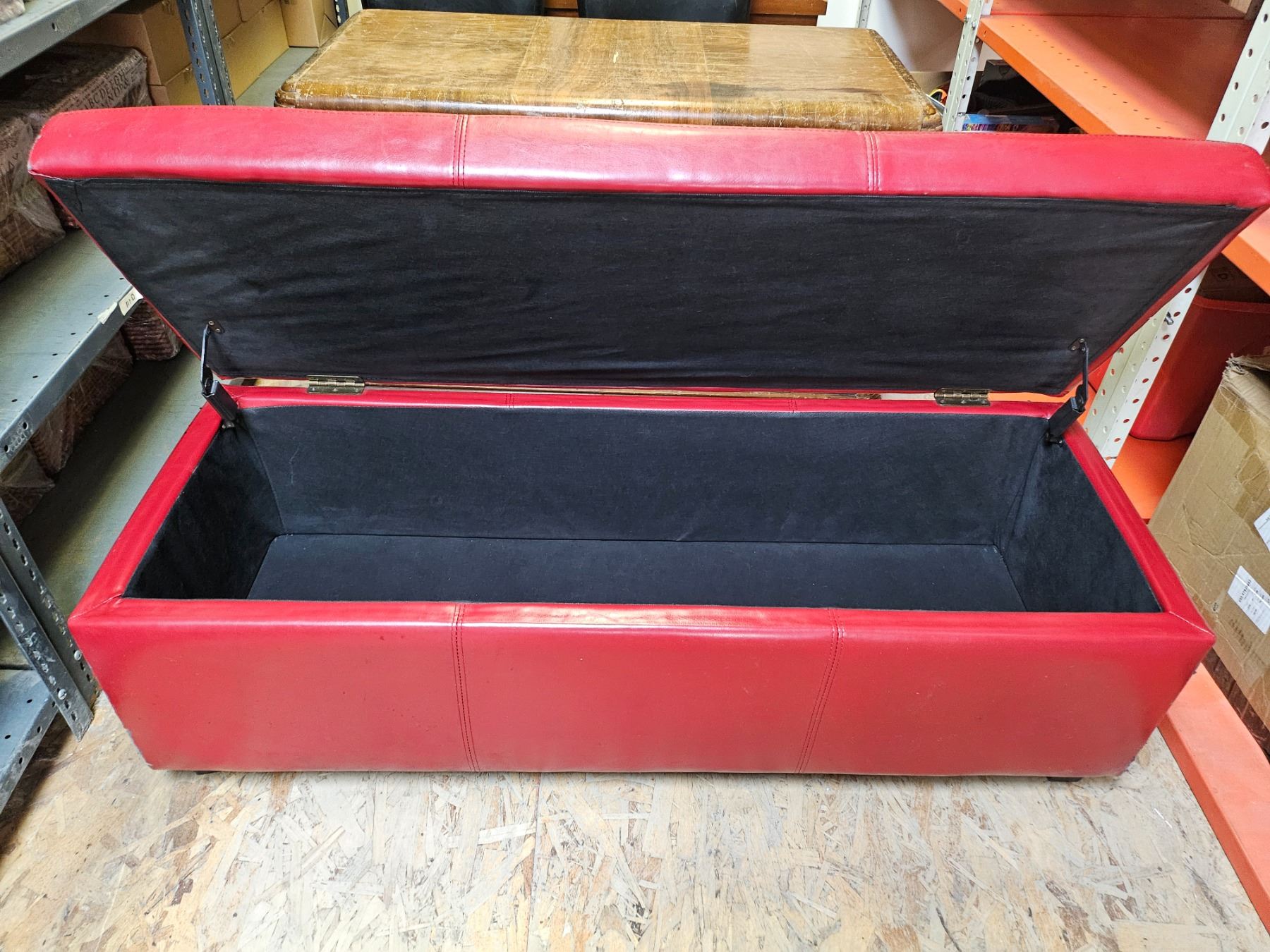 red leather Hutch. perfect for blanket or toy storage. one small bearing hole maybe the size of a quarter on the top no other rips