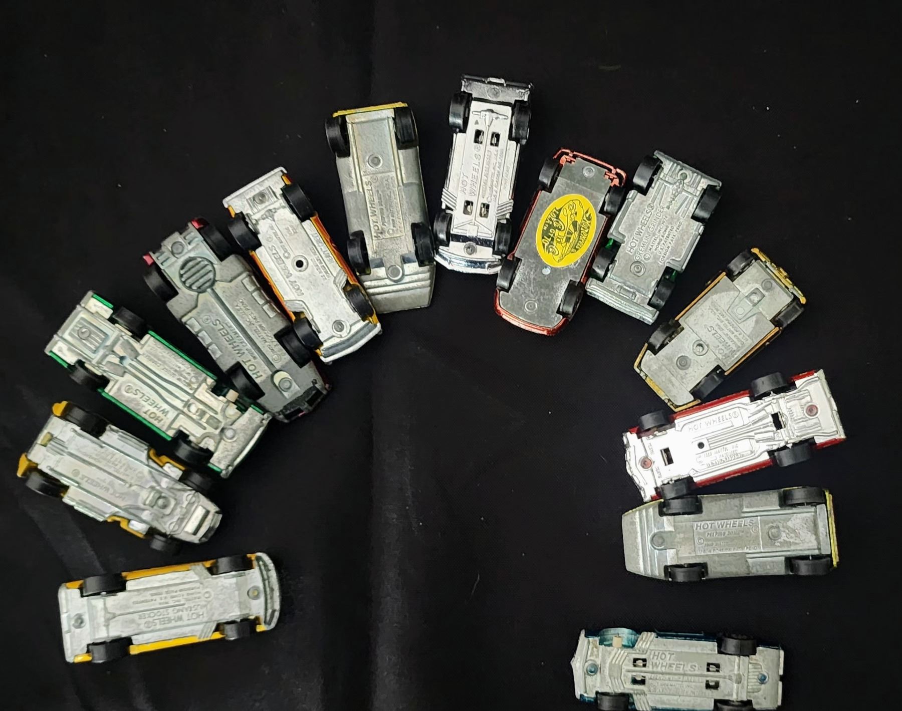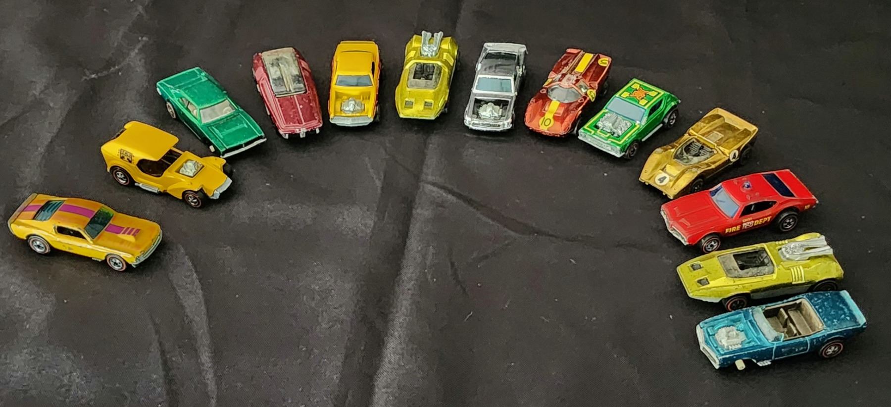 13 - Red Line Hot wheel metal cars, includes a Mustang Stocker, Ice "T", Custom Double Charger, Whip Creamer, Heavy Chevy, Peeping Bomb, Custom Boss Hoss, Lola GT 70, Gremlin Grinder, McLaren MBA, Fire Chief, Peeping Bomb and a Light My Firebird. Various conditions.