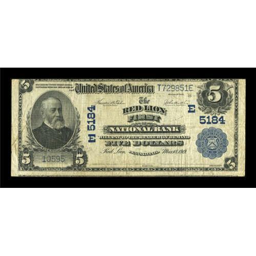 <B>Red Lion, PA</B></I> - $5 1902 Plain Back Fr. 606 <B>The Red Lion First NB</B></I> Ch. # (E)5184<BR> A scarce York County bank with about fifteen large examples recorded from here in the new Kelly census. This is easily one of the nicer ones. <B>Fine</B></I>.<BR><I>From The Kansas City Collection.</B></I><BR><BR><b>Shipping:</b> Coins & Currency (<a target="_blank" href="http://www.heritageauctions.com/common/shipping.php">view shipping information</a>)