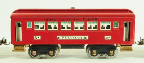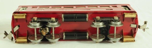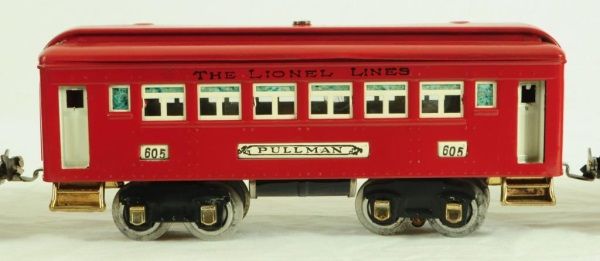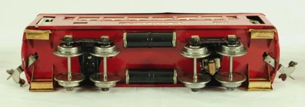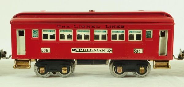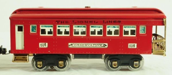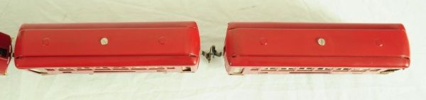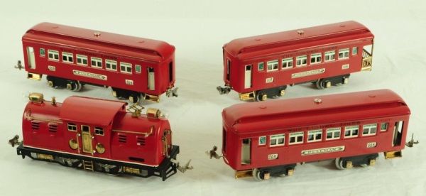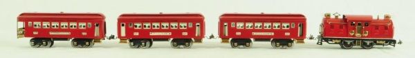 Engine (8-1/2" L) and 2 Pullman and 1 Observation Cars (10-1/2" L). Engine marked "Lionel O Gauge Motor.