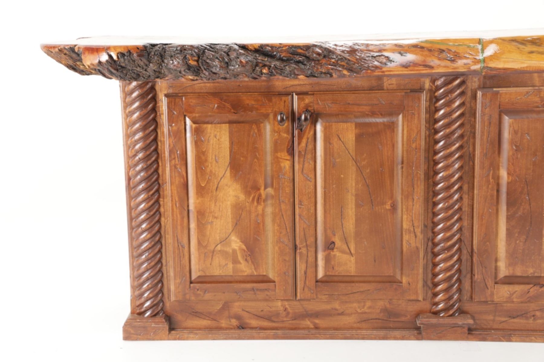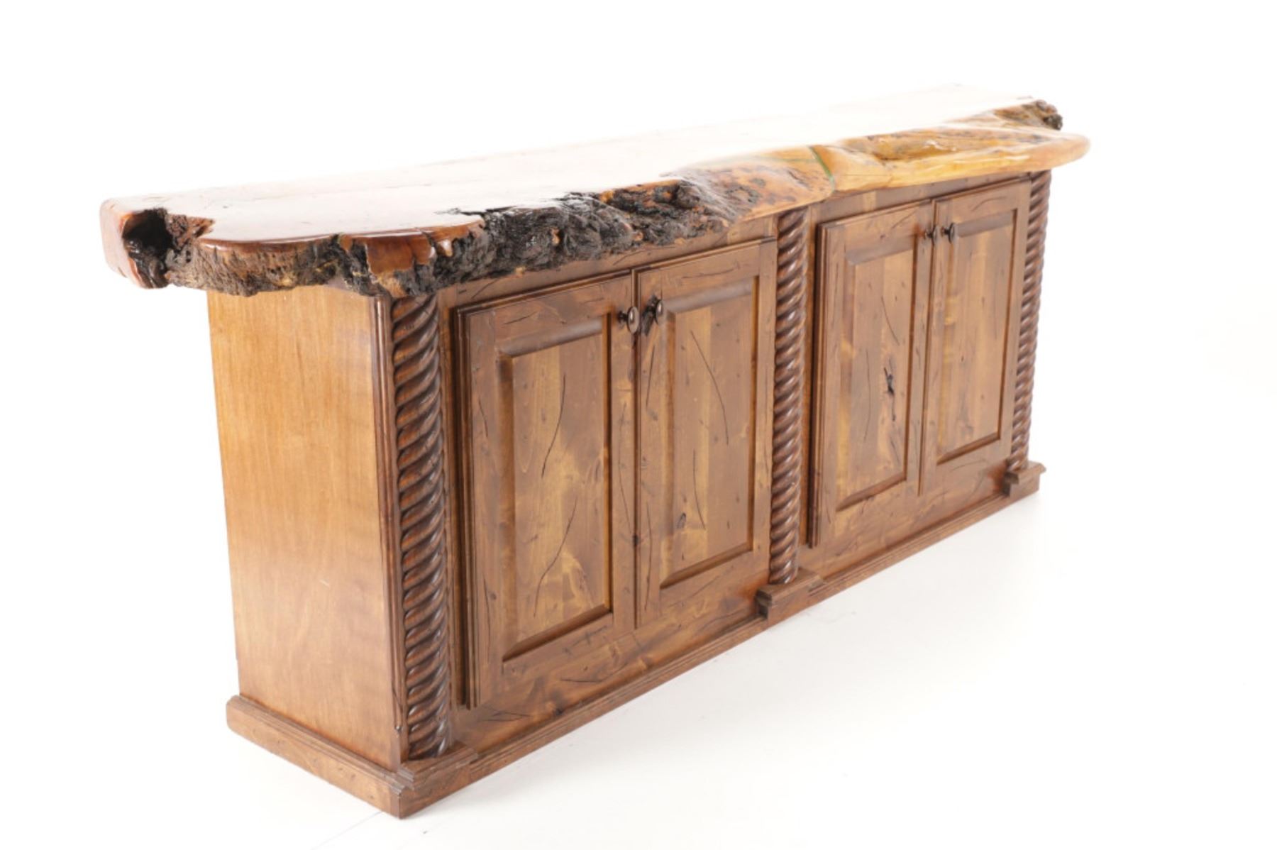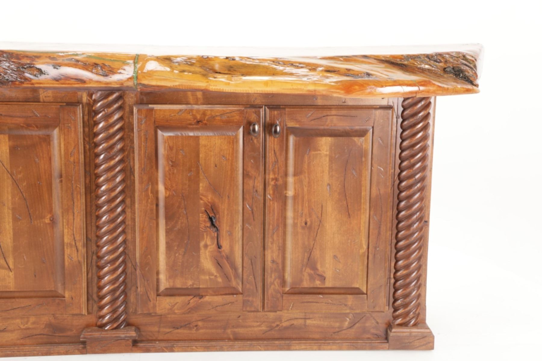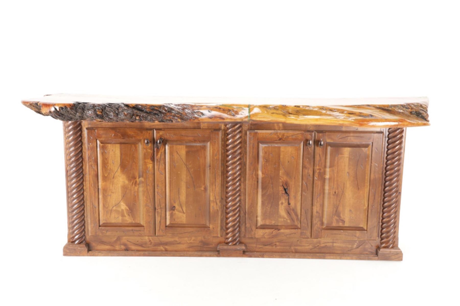 Featured in this lot is this Red Lodge, Montana Live Edge hallway counter top. The counter top features a wonderfully and professionally crafted live edge red cedar and commercial cabinet made construction that shows pillars for the outside the cabinet frame with open cabinet doors with two larger basins and a large single slab to the top of the counter with a live edge style that is sanded, polished, and treated red cedar. The condition of this of this hallway counter top is good with no obvious signs of damage and shows good overall condition. The measurements of this hallway counter top is 30 1/2" x 79 1/2" x 17 3/4".