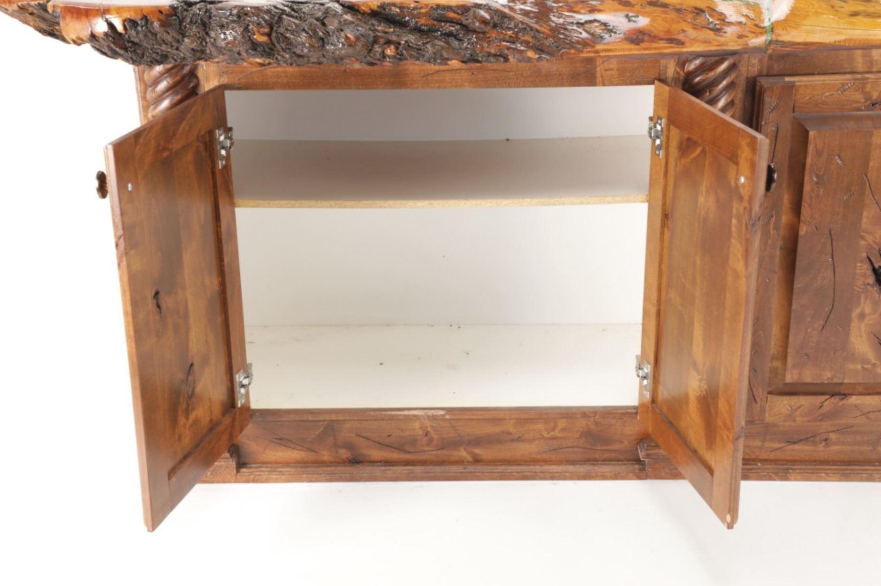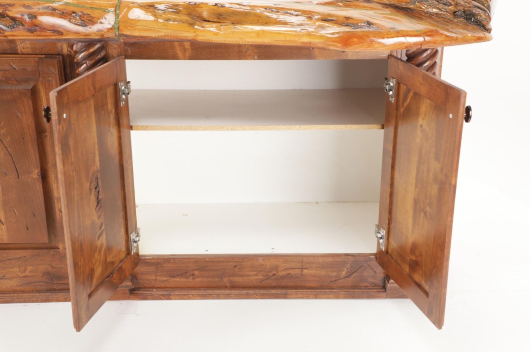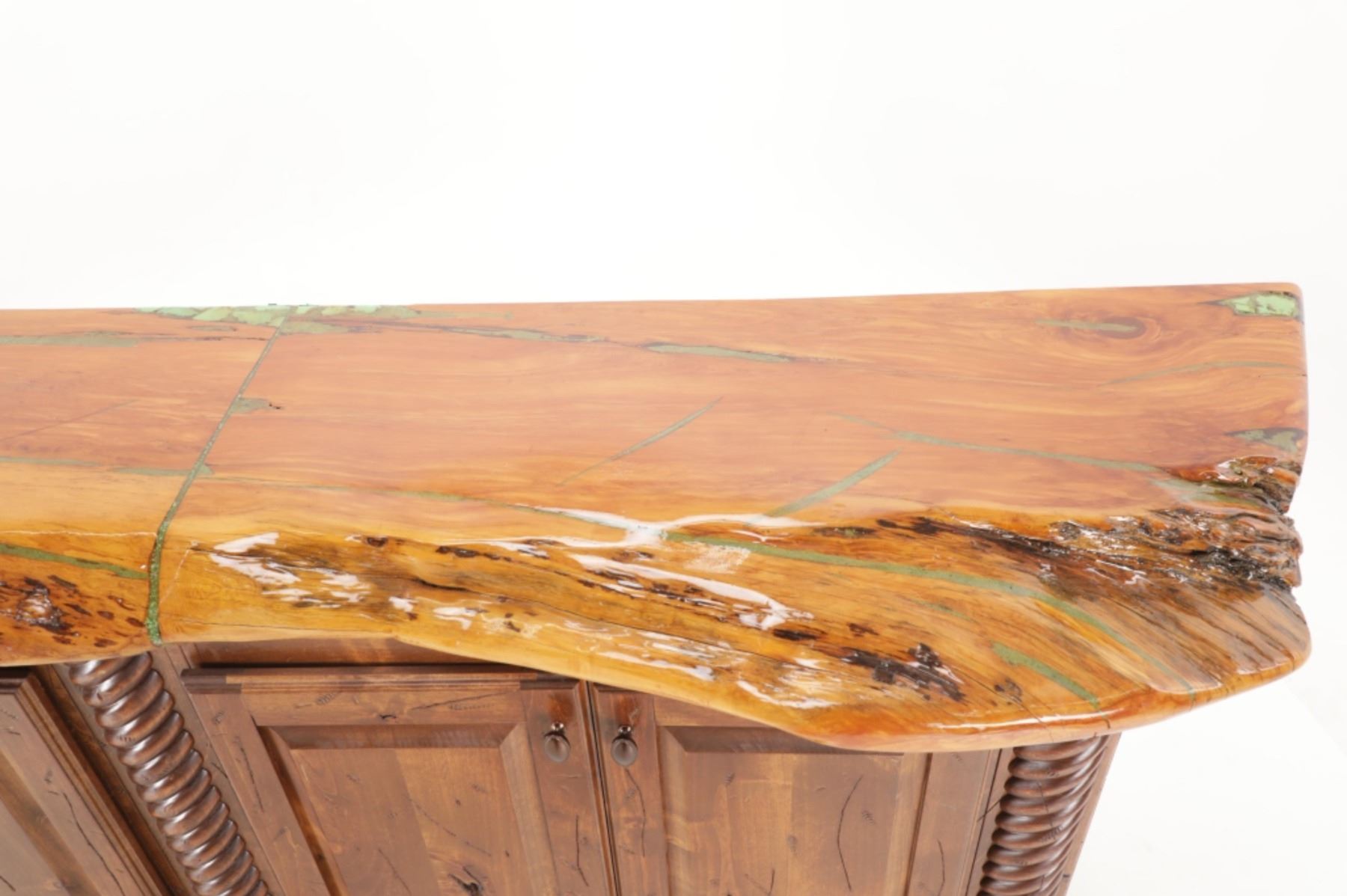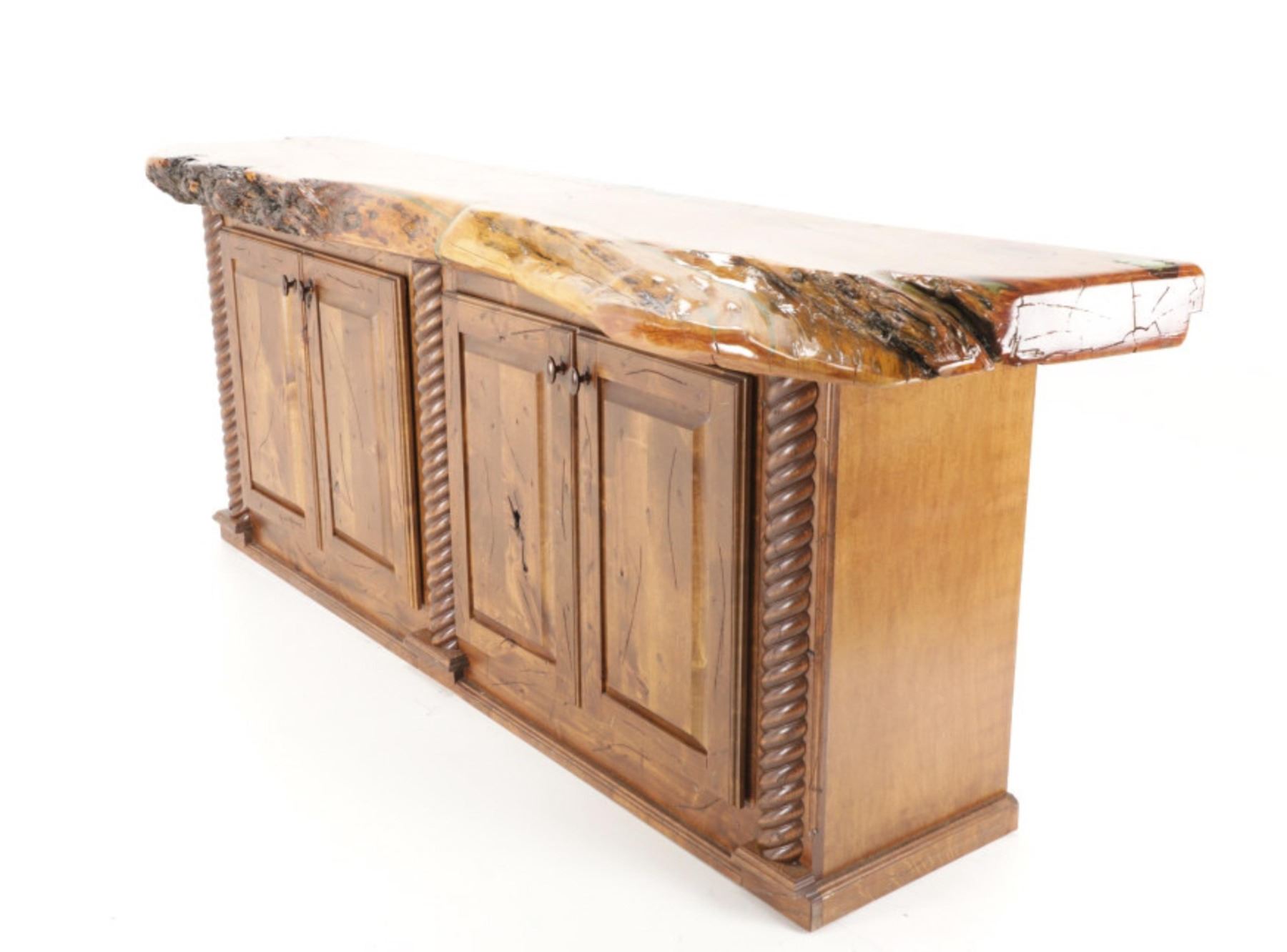 Featured in this lot is this Red Lodge, Montana Live Edge hallway counter top. The counter top features a wonderfully and professionally crafted live edge red cedar and commercial cabinet made construction that shows pillars for the outside the cabinet frame with open cabinet doors with two larger basins and a large single slab to the top of the counter with a live edge style that is sanded, polished, and treated red cedar. The condition of this of this hallway counter top is good with no obvious signs of damage and shows good overall condition. The measurements of this hallway counter top is 30 1/2" x 79 1/2" x 17 3/4".