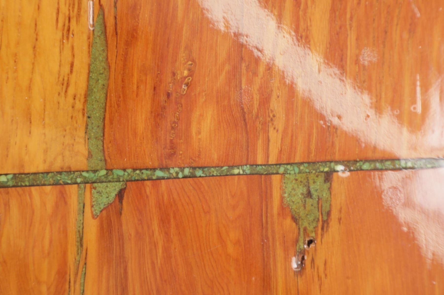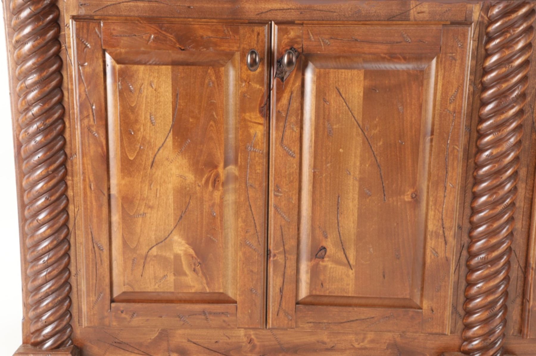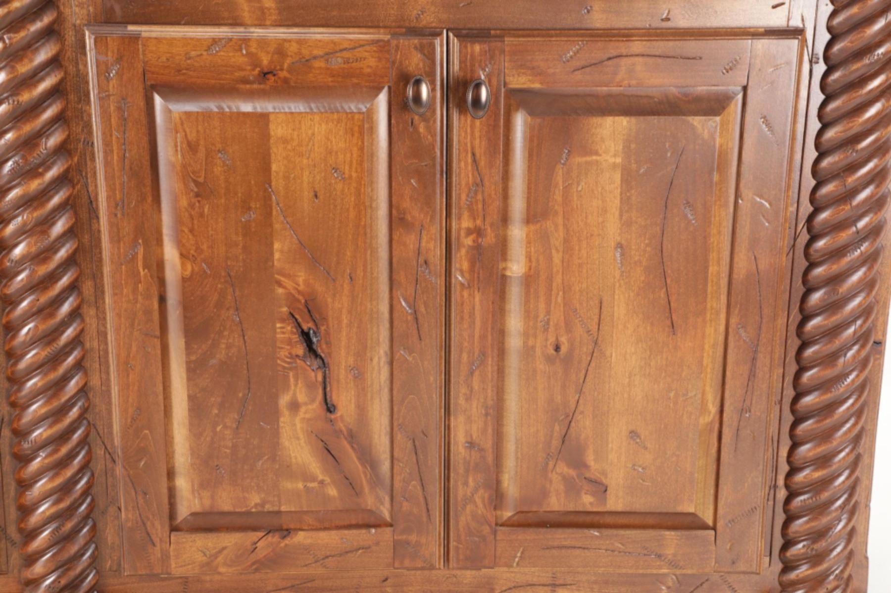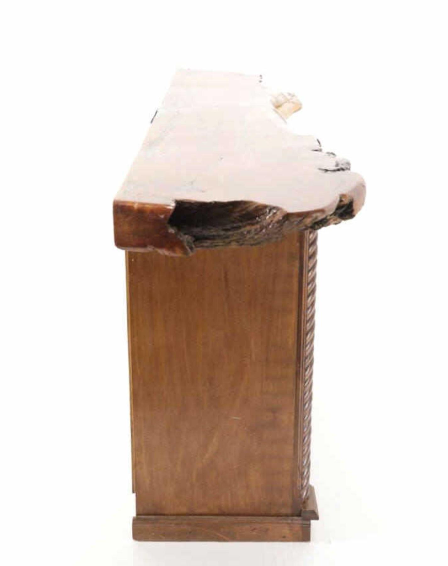 Featured in this lot is this Red Lodge, Montana Live Edge hallway counter top. The counter top features a wonderfully and professionally crafted live edge red cedar and commercial cabinet made construction that shows pillars for the outside the cabinet frame with open cabinet doors with two larger basins and a large single slab to the top of the counter with a live edge style that is sanded, polished, and treated red cedar. The condition of this of this hallway counter top is good with no obvious signs of damage and shows good overall condition. The measurements of this hallway counter top is 30 1/2" x 79 1/2" x 17 3/4".
