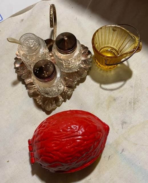 Red Nut Cracker with a set of Salt & Pepper Shakers & Glass Coal Pail