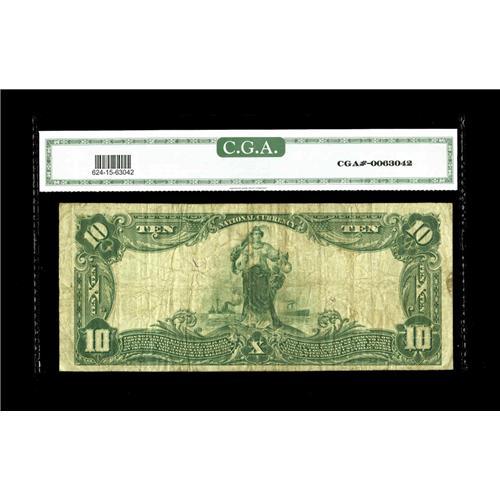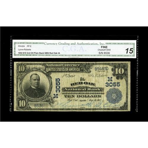 <B>Red Oak, IA</B></I> - $10 1902 Plain Back Fr. 624 <B>Red Oak NB</B></I> Ch. # (M)3055<BR>This example has light blue ink signatures, and is a new note to the census. <B>CGA Fine-15.</B></I>