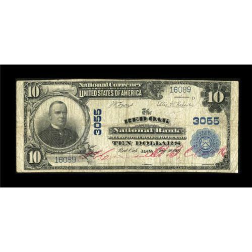<B>Red Oak, IA</B></I> - $10 1902 Plain Back Fr. 624 <B>Red Oak NB</B></I> Ch. # 3055<BR> Red stamped signatures are seen on this Red Oak note. <B>Very Good</B></I>.<BR><BR><b>Shipping:</b> Coins & Currency (<a target="_blank" href="http://www.heritageauctions.com/common/shipping.php">view shipping information</a>)
