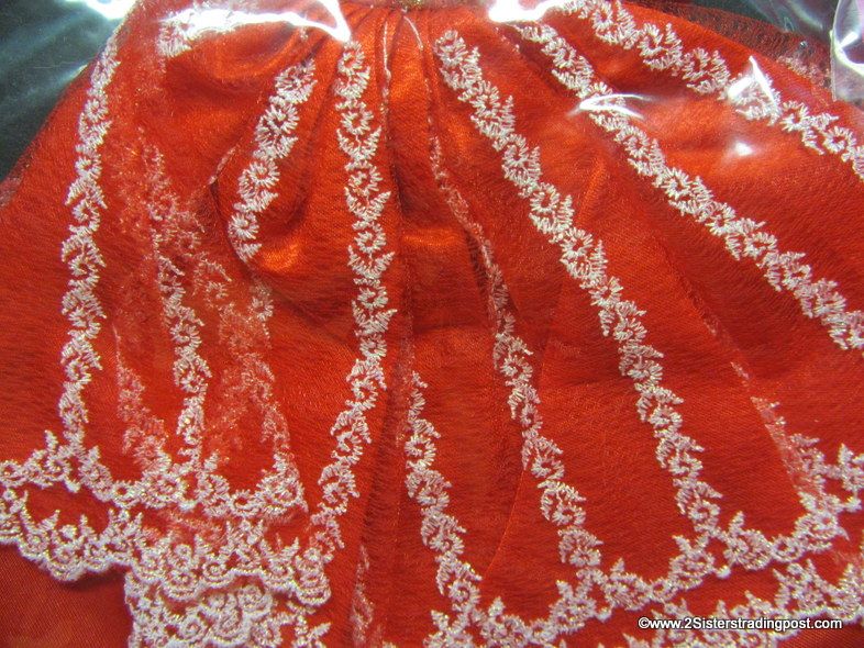 has a designed tulle overlay. Comes complete with matching shoes. Comes with clear plastic