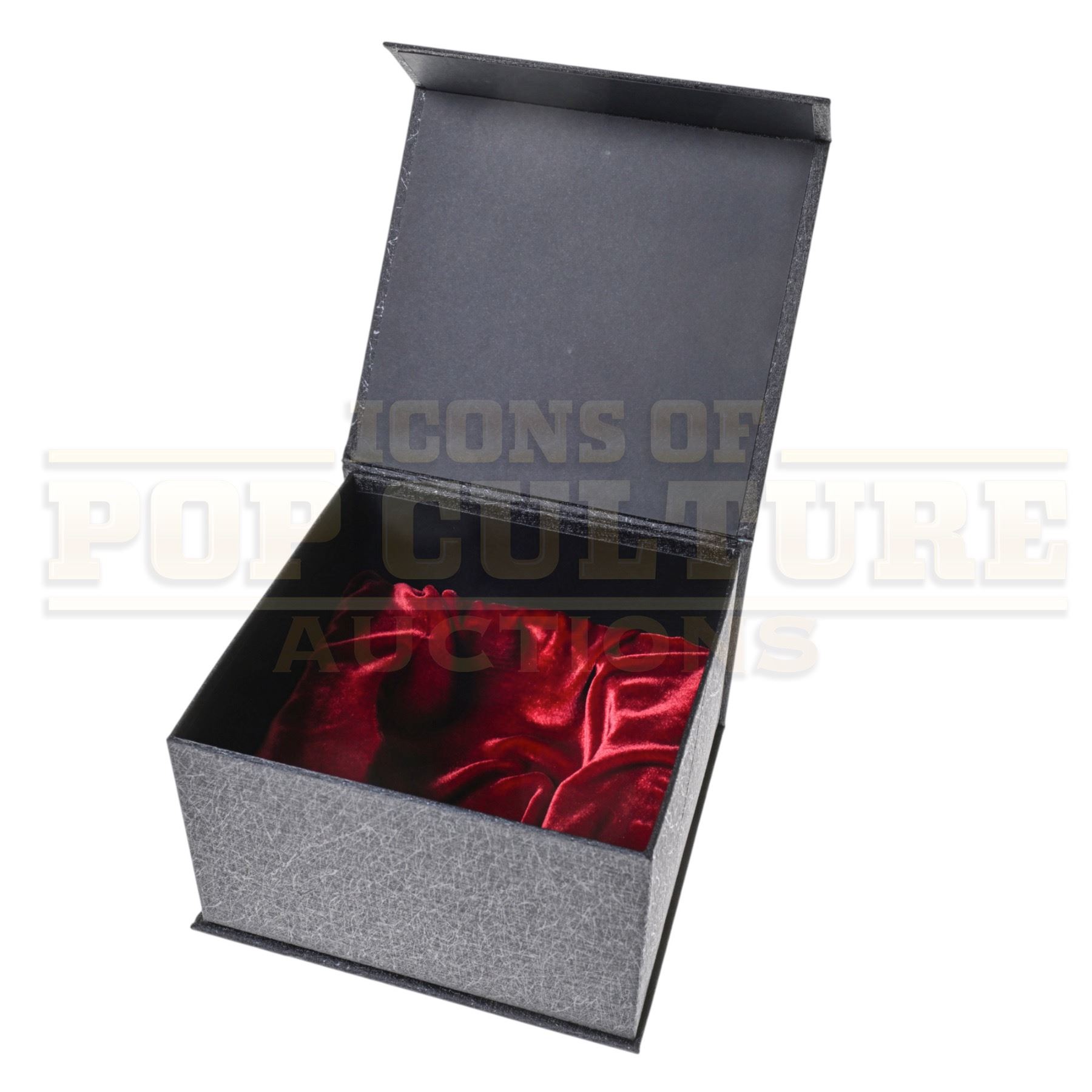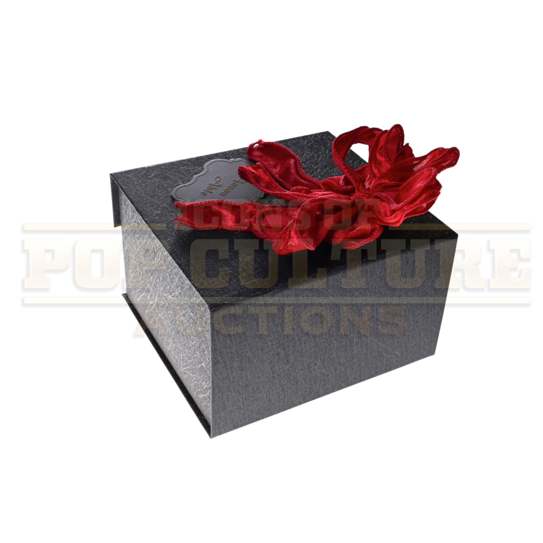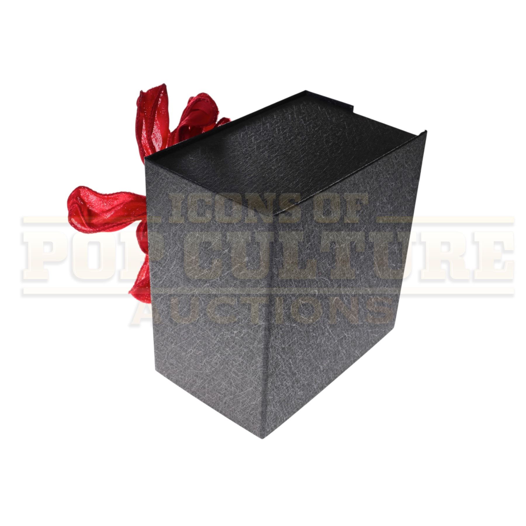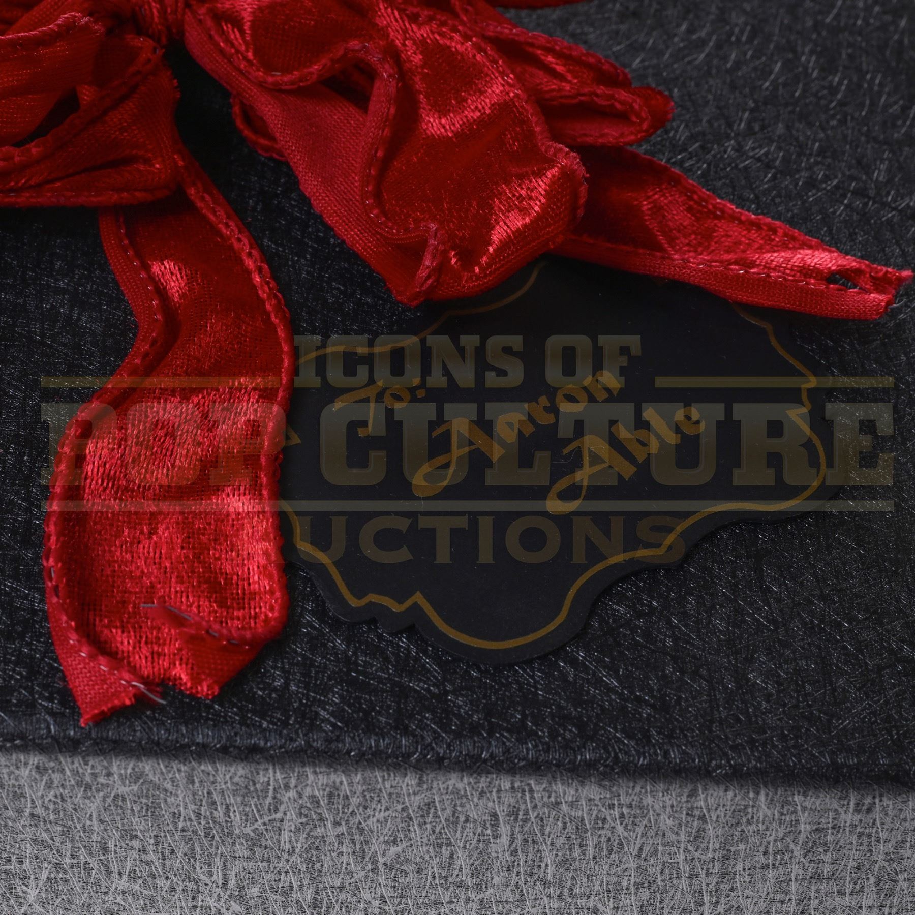 This elegant 8.25" x 7.75" x 5" gift box is wrapped with a luxurious red velvet bow and personalized with a gold-trimmed label reading “To: Aaron Able.” Used in the film Red One, this box was part of a trap set to capture Aaron Able (played by Matthew Cornwell) and originally held the snowglobe trap prop. A key prop from a pivotal scene, this box is a great example of the film’s holiday-meets-action production design.