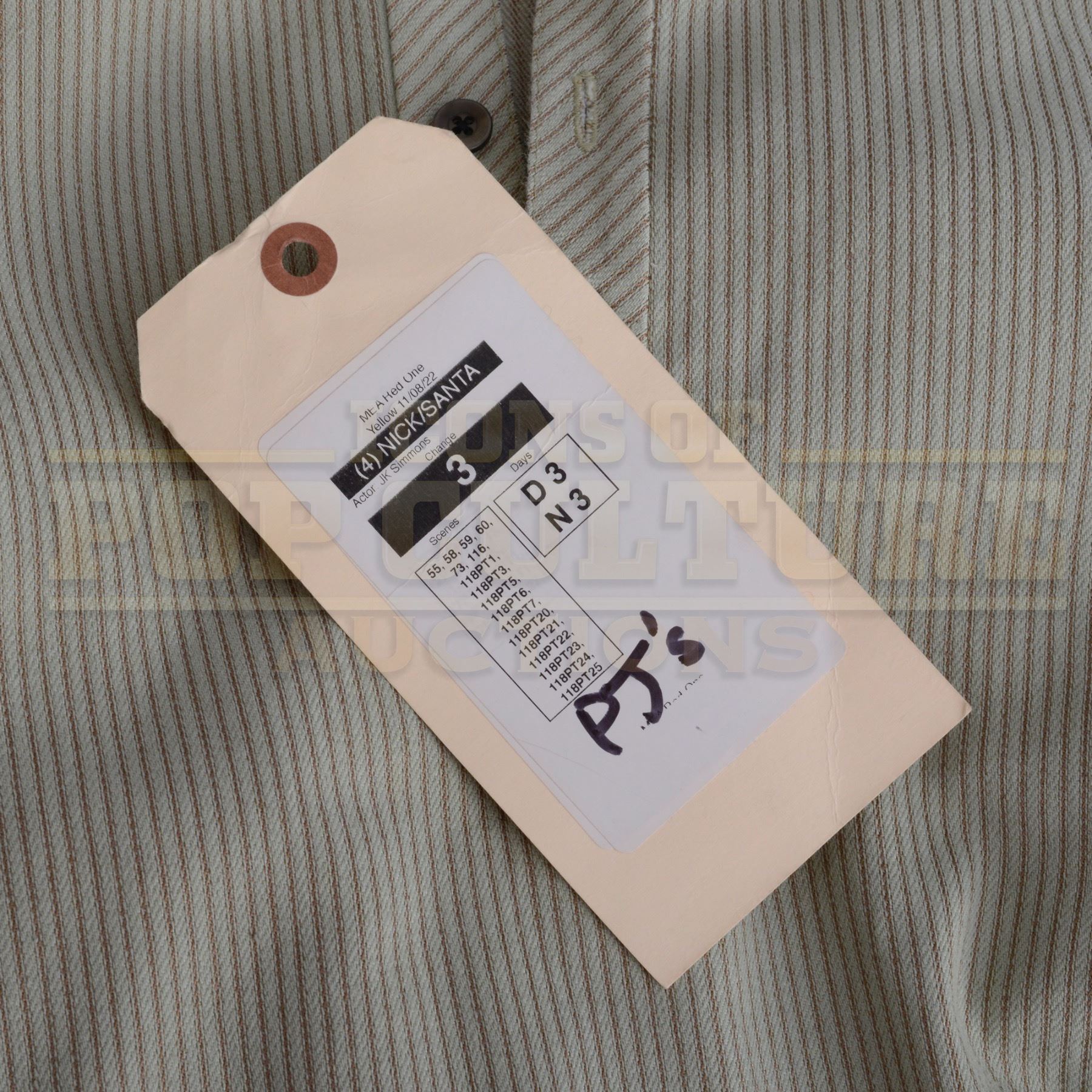 A production wardrobe tag reading “Nick/Santa – PJ’s” is included, confirming this costume’s on-screen use. Seen during Nick’s lowest point, this outfit plays a key role in visually contrasting his transformation back into the powerful holiday legend.