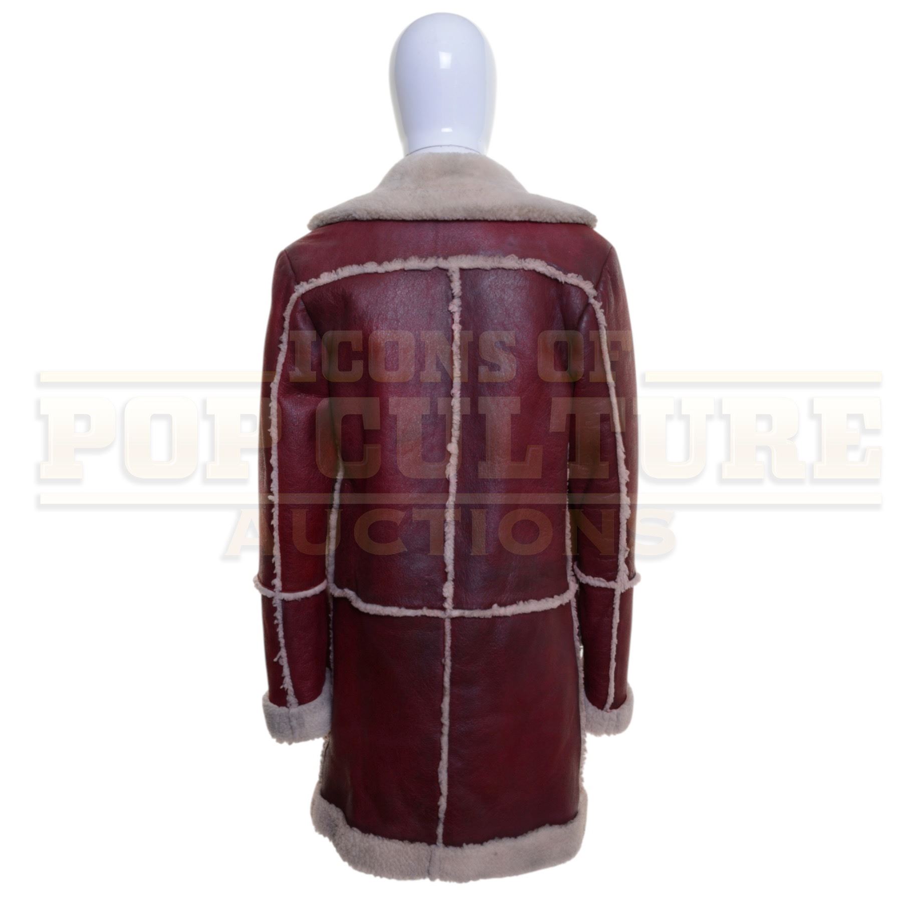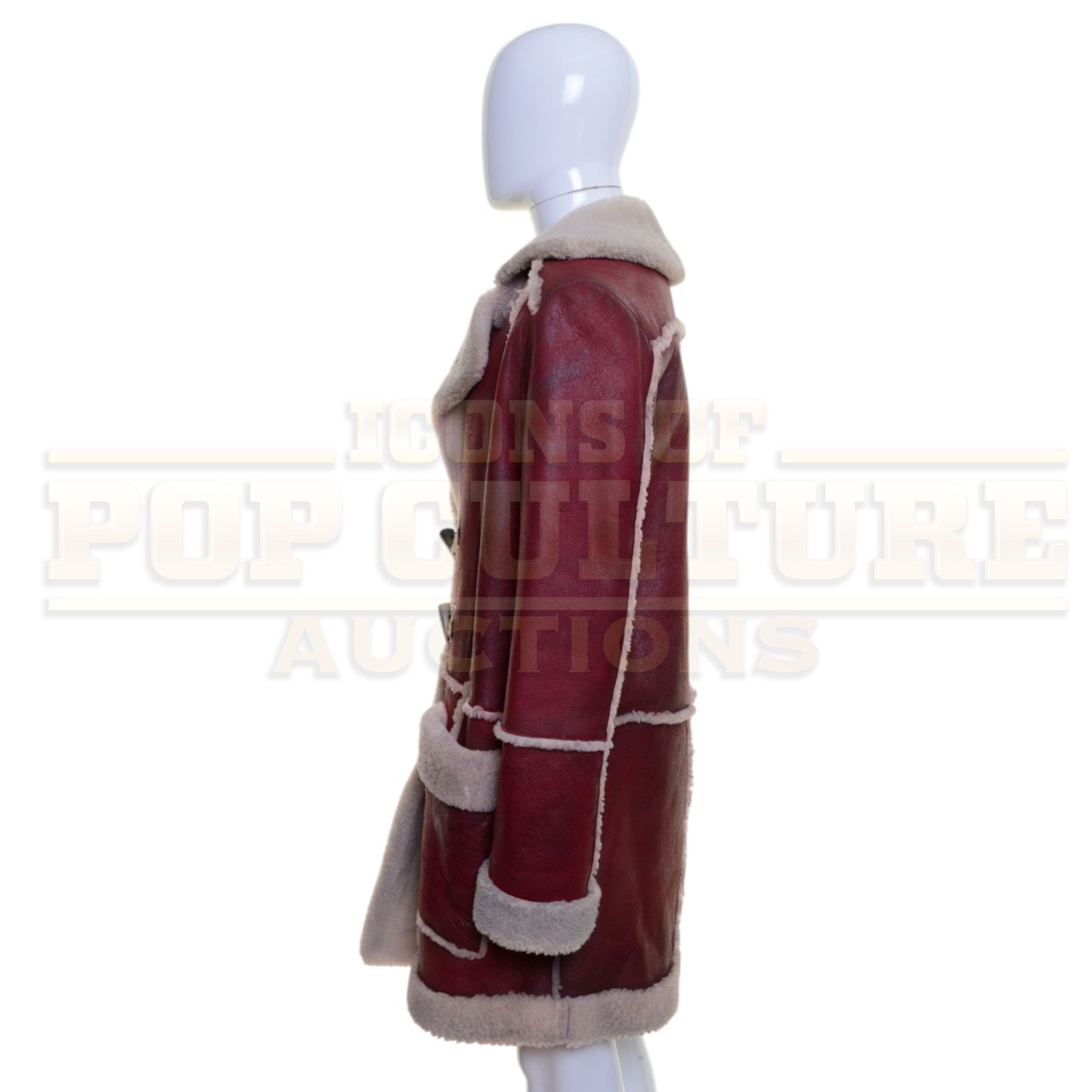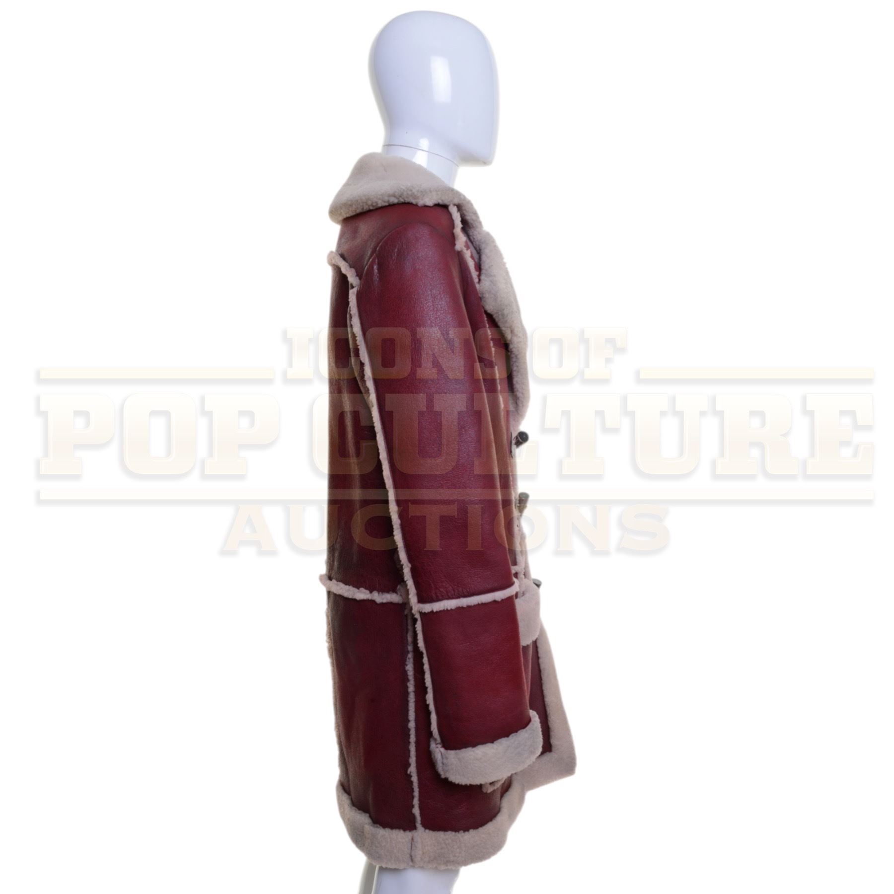 Crafted from genuine red leather with soft cream-colored shearling lining and trim, the coat features toggle closures with faux-antler-style fastenings and large front pockets. It is featured prominently in promotional material, including theatrical posters and trailers.
