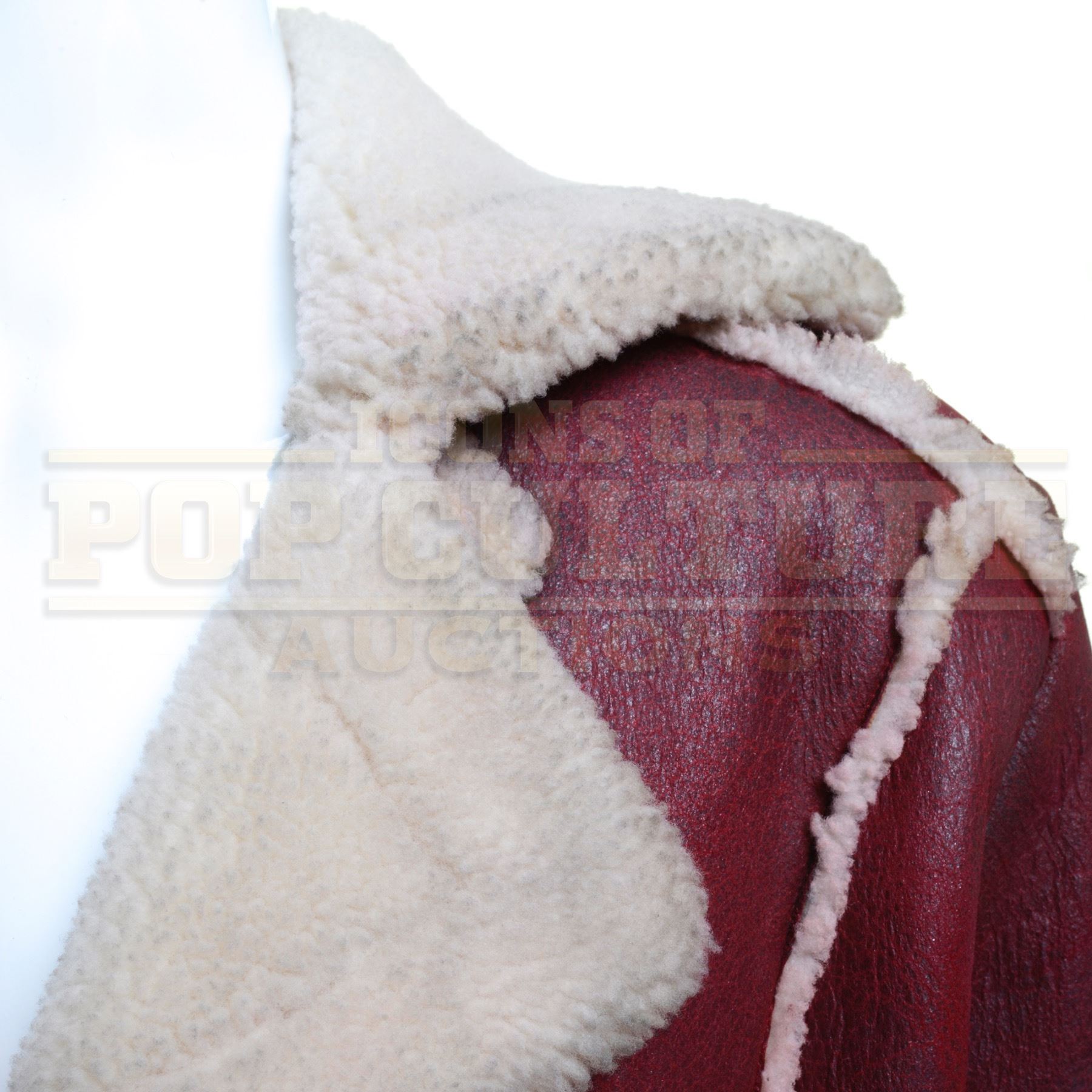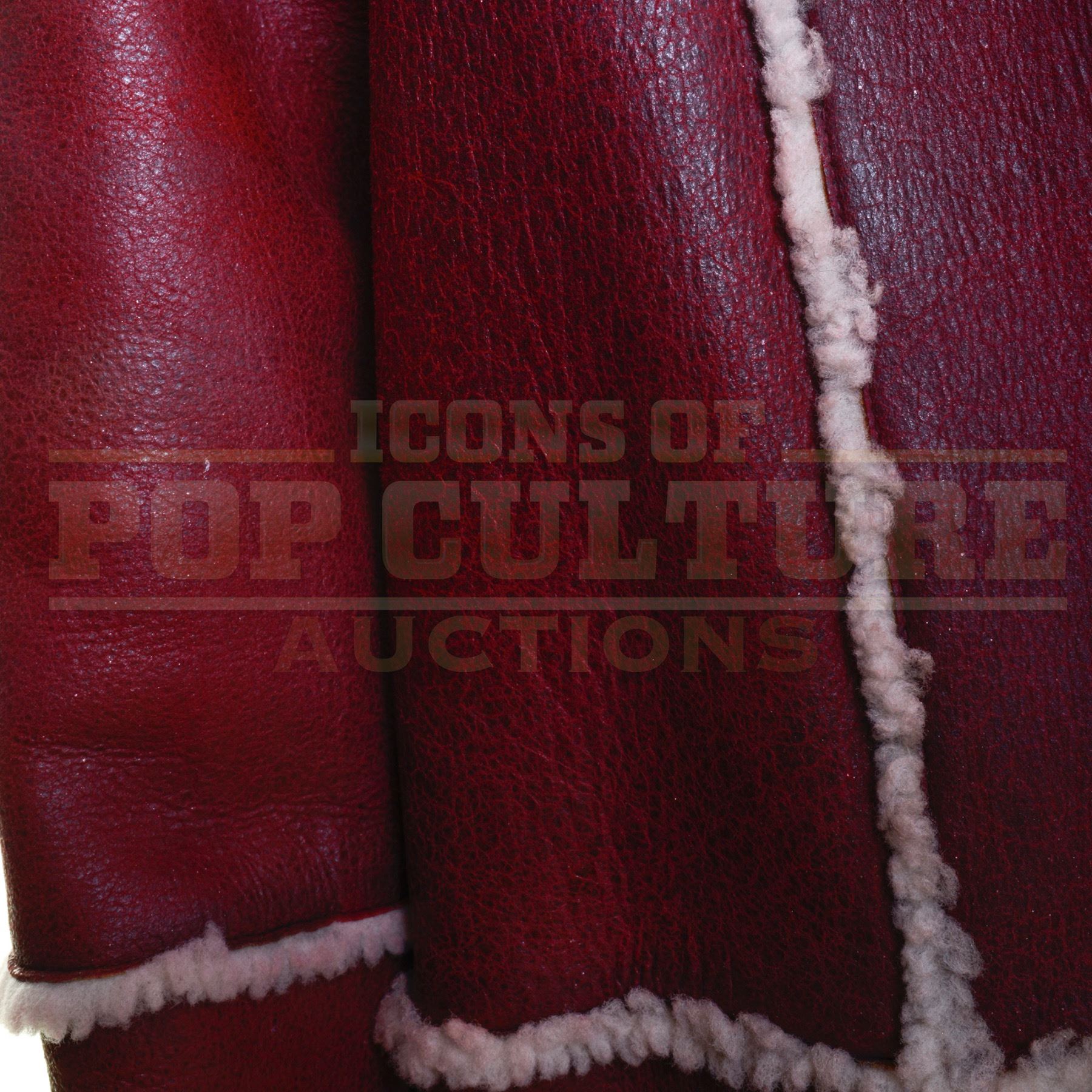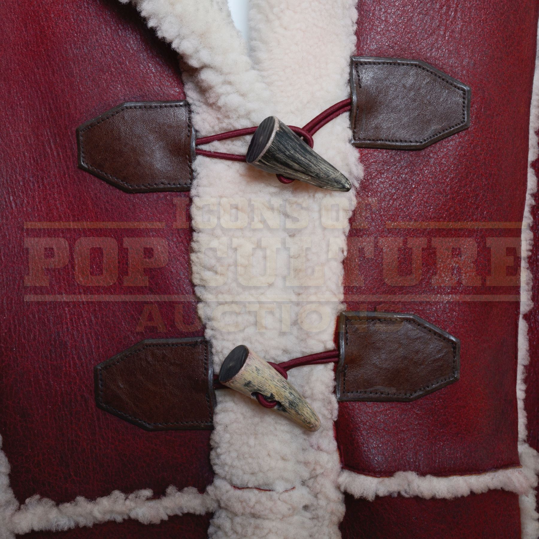Crafted from genuine red leather with soft cream-colored shearling lining and trim, the coat features toggle closures with faux-antler-style fastenings and large front pockets. It is featured prominently in promotional material, including theatrical posters and trailers.