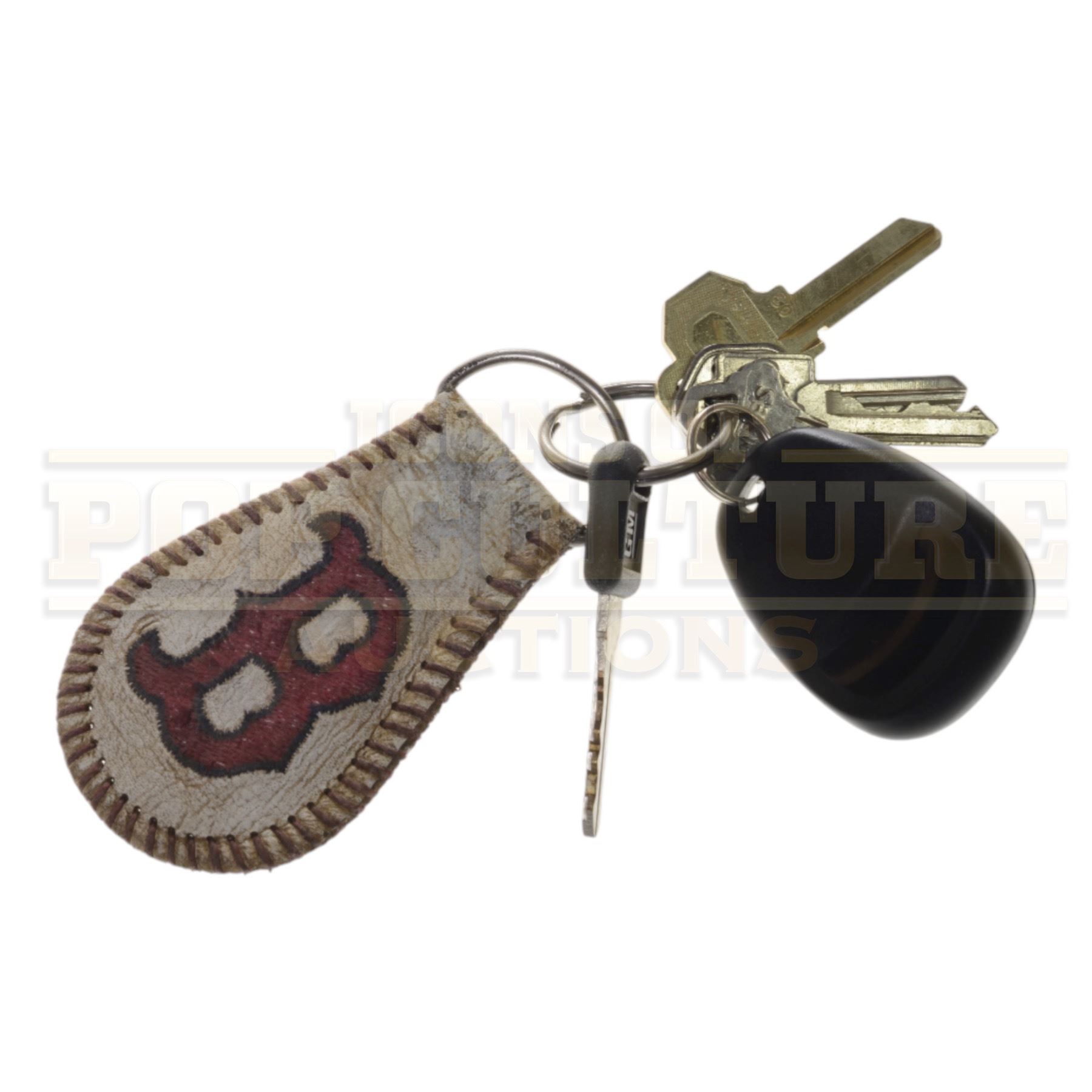 The keyring features several metal keys, a black remote key fob, and a distinctive worn leather keychain displaying the iconic Boston Red Sox “B” logo. Used during filming and as part of the character’s personal props, this set perfectly reflects O’Malley’s grounded personality amid the film’s fantastical North Pole setting and high-octane action.