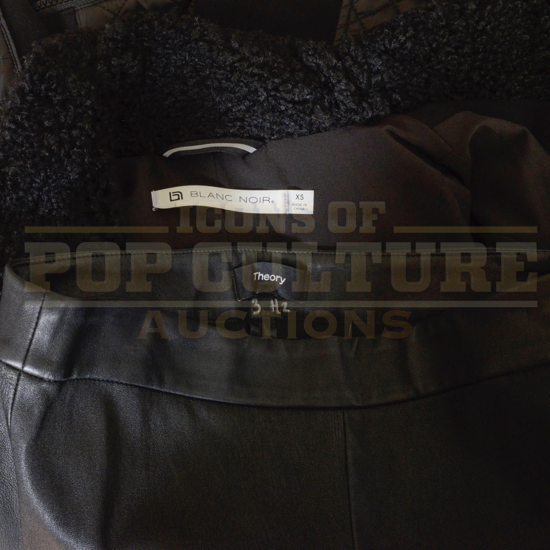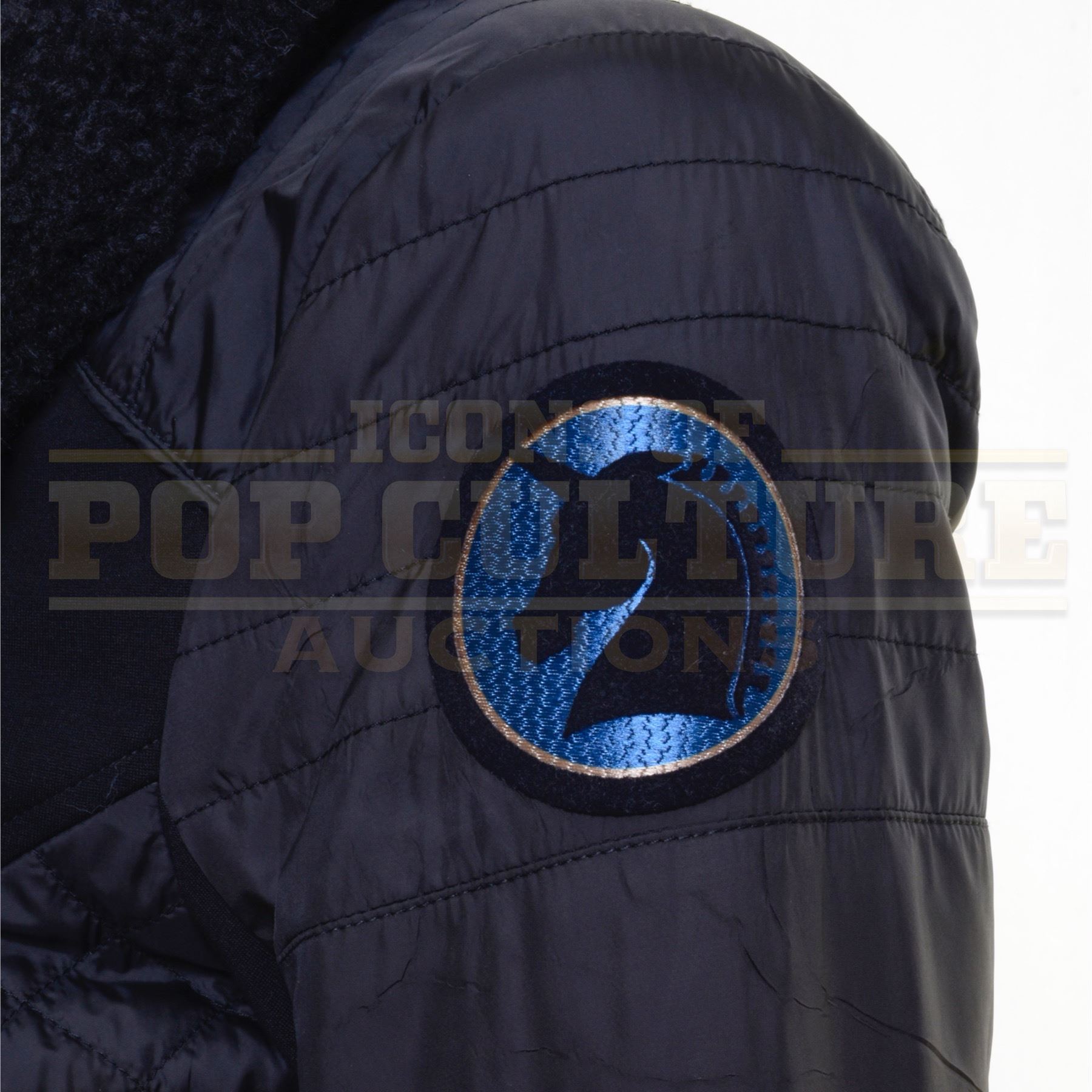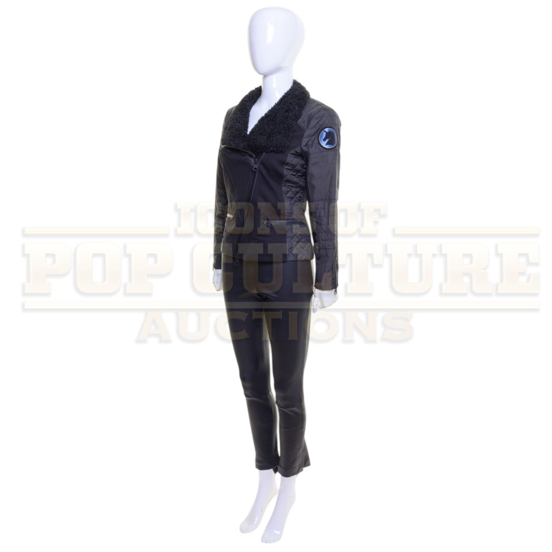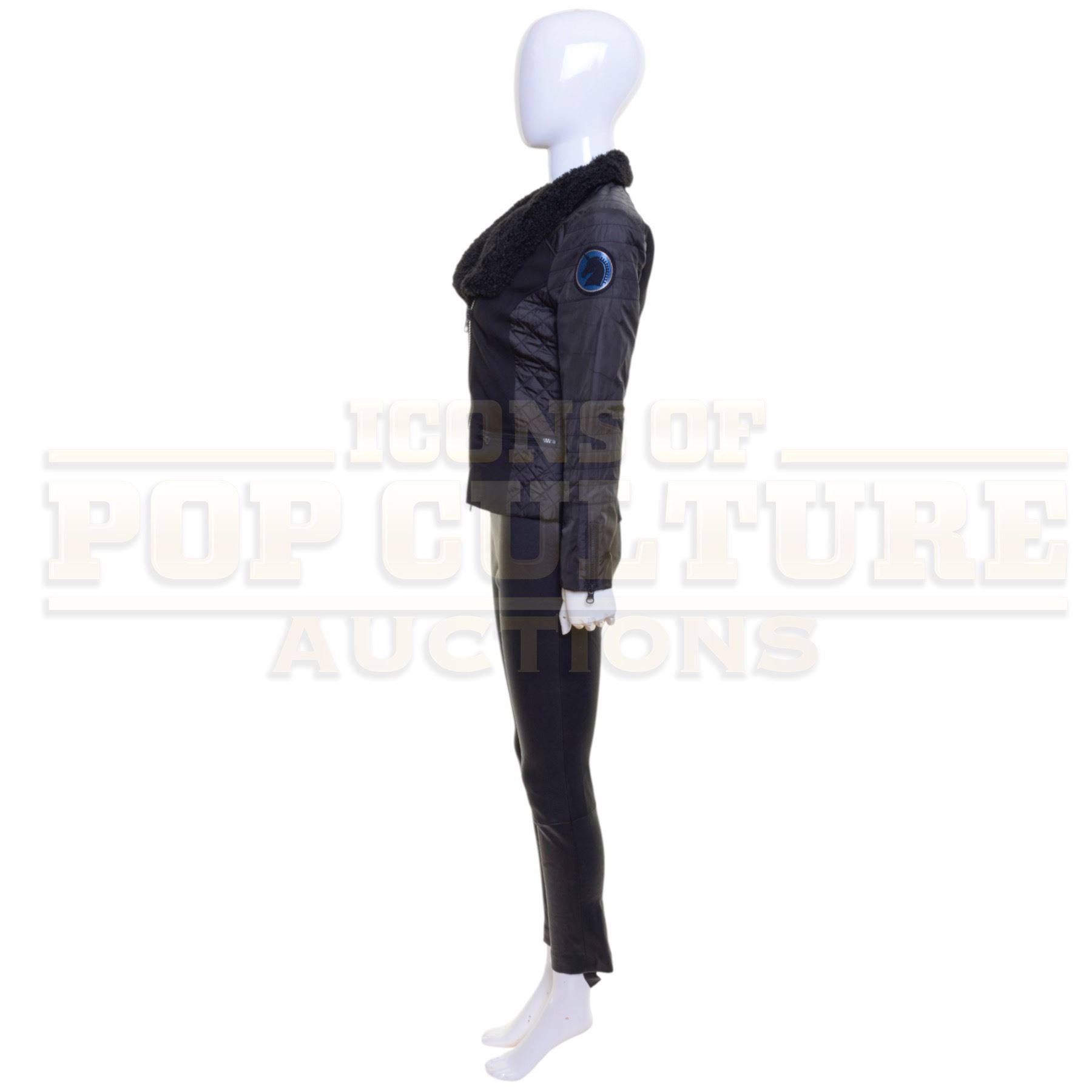 The fitted Blanc Noir jacket (size XS) features quilted panels, a black faux shearling collar, and an embroidered blue and black unicorn insignia patch on the left arm, representing Zoe Harlow’s team emblem. The accompanying Theory pants (marked “3 HZ”) complete the look, maintaining the tactical yet high-fashion aesthetic seen throughout the film’s blend of modern action and Christmas mythos.