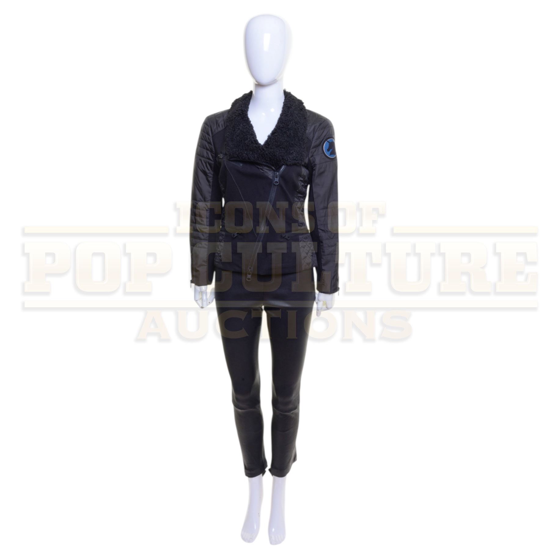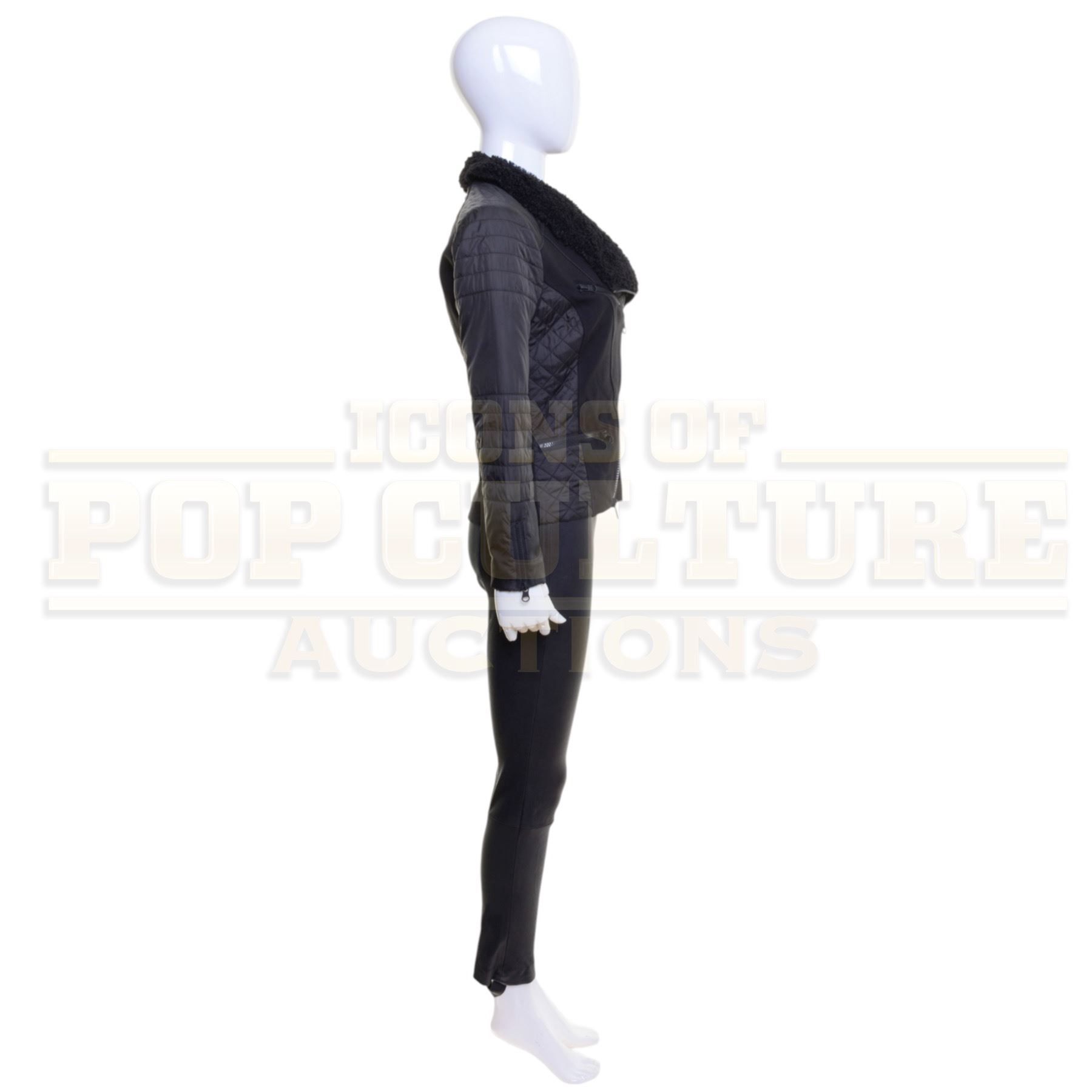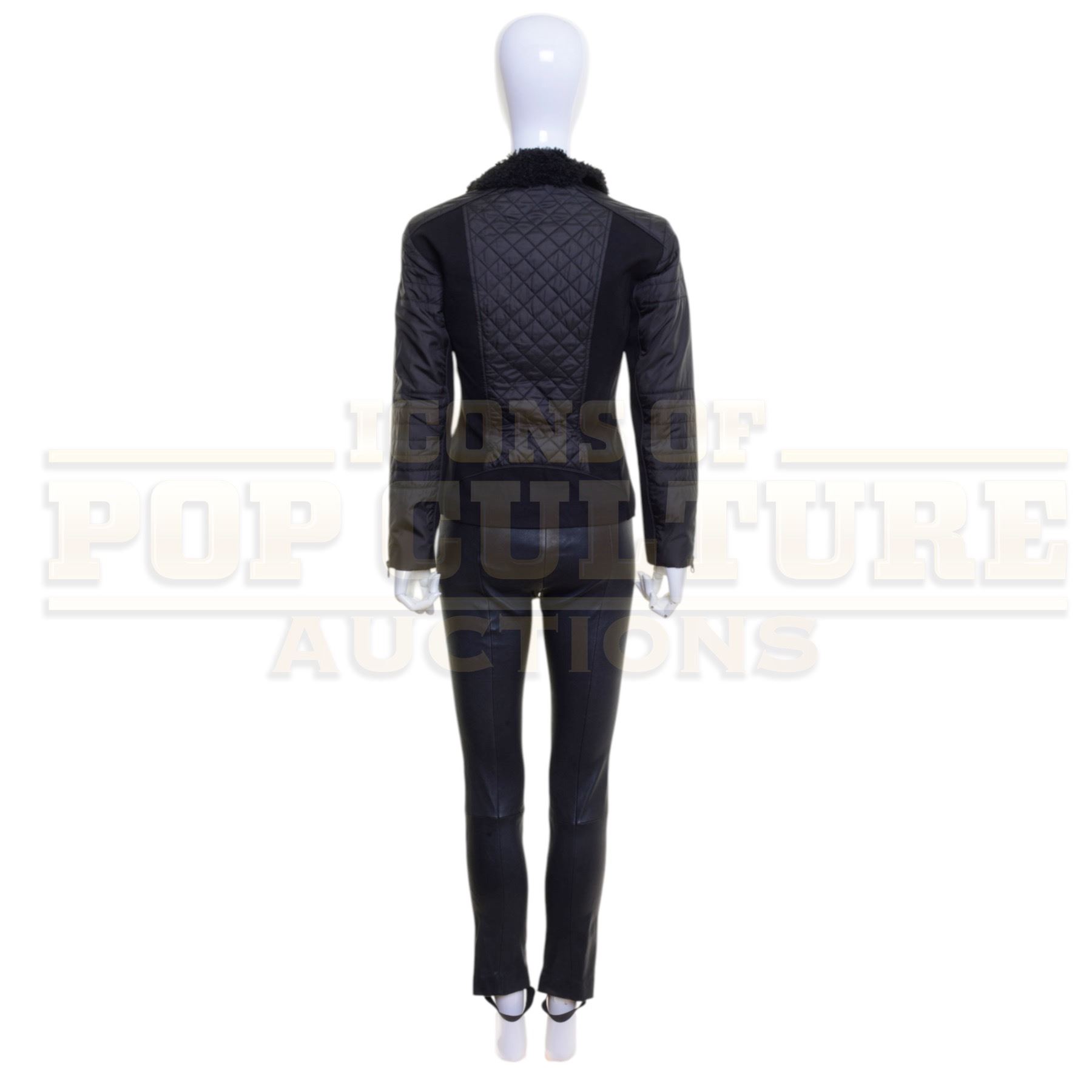 A sleek and stylish costume worn by Lucy Liu as Zoe Harlow in the 2024 action-fantasy holiday film Red One, directed by Jake Kasdan and starring Dwayne Johnson and Chris Evans. This costume consists of a black quilted jacket and matching leather-style pants, both custom-tailored for Liu’s character, the commander of the elite North Pole security unit known as “The E.L.F.”