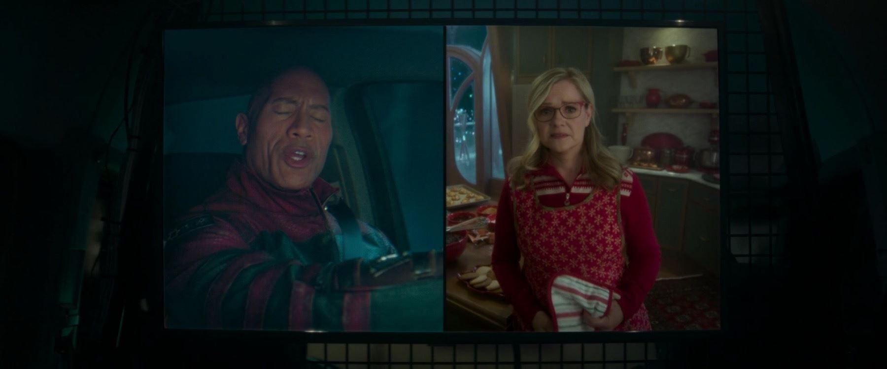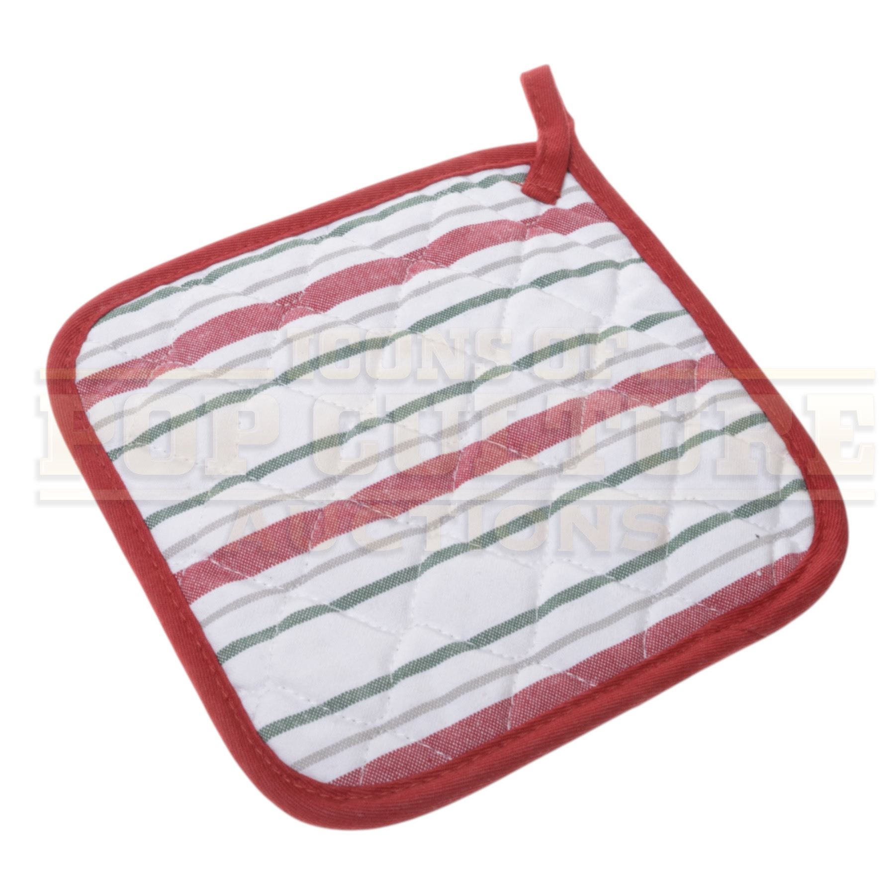 This festive red, white, and green striped pot holder was used on screen by Bonnie Hunt as Mrs. Claus in the 2024 Amazon Studios holiday action-comedy Red One, starring Dwayne Johnson and Chris Evans.