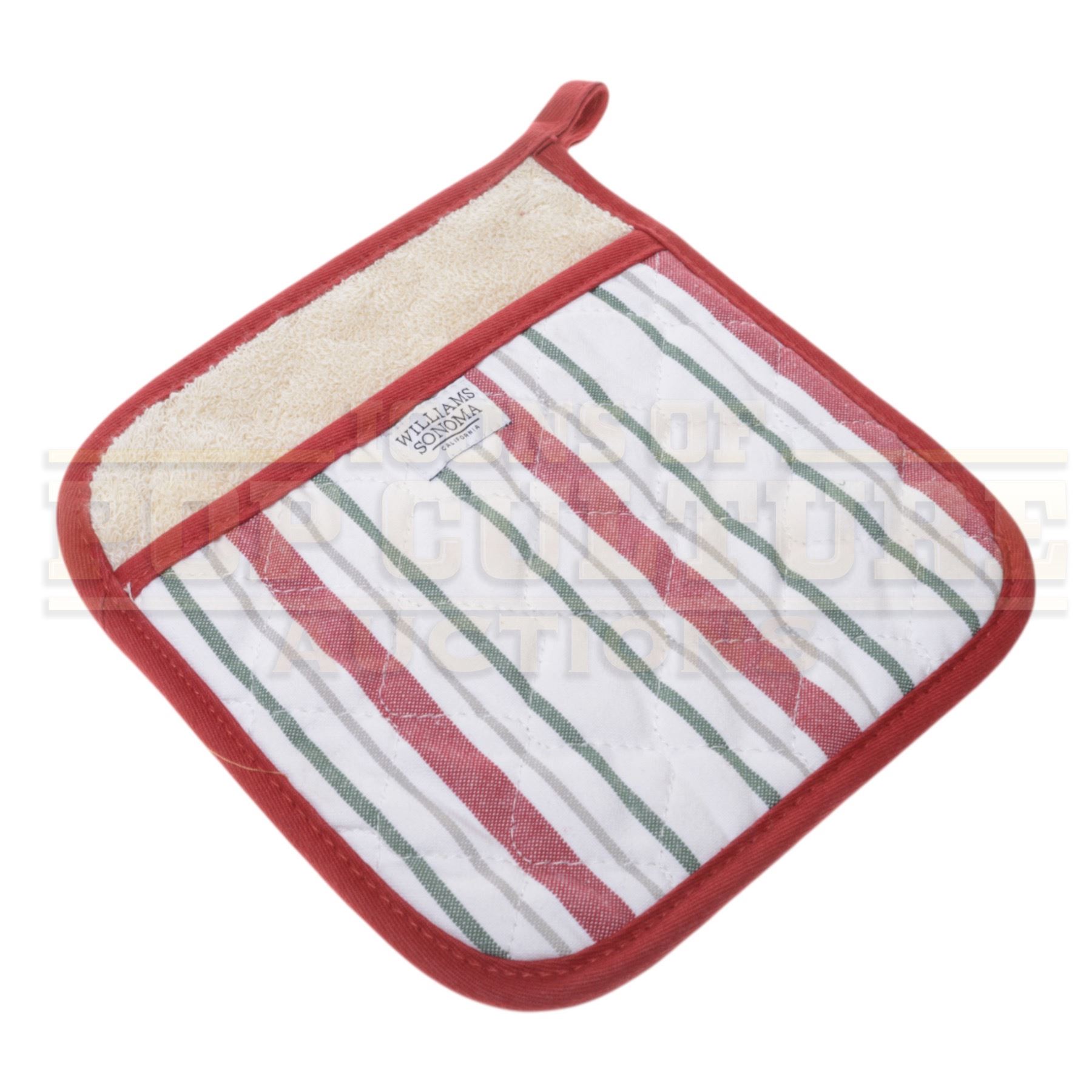 Measuring approximately 8.75” x 9”, this Williams Sonoma pot holder features quilted stitching with a cozy terry cloth backing and a red looped edge for hanging, perfectly matching the warm, classic Christmas aesthetic of Mrs. Claus’ North Pole kitchen.