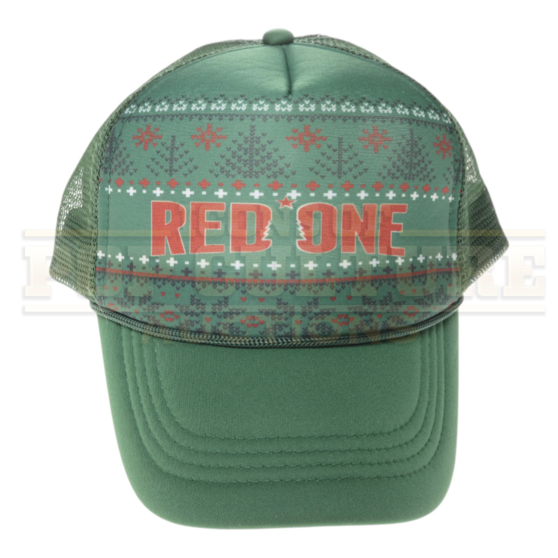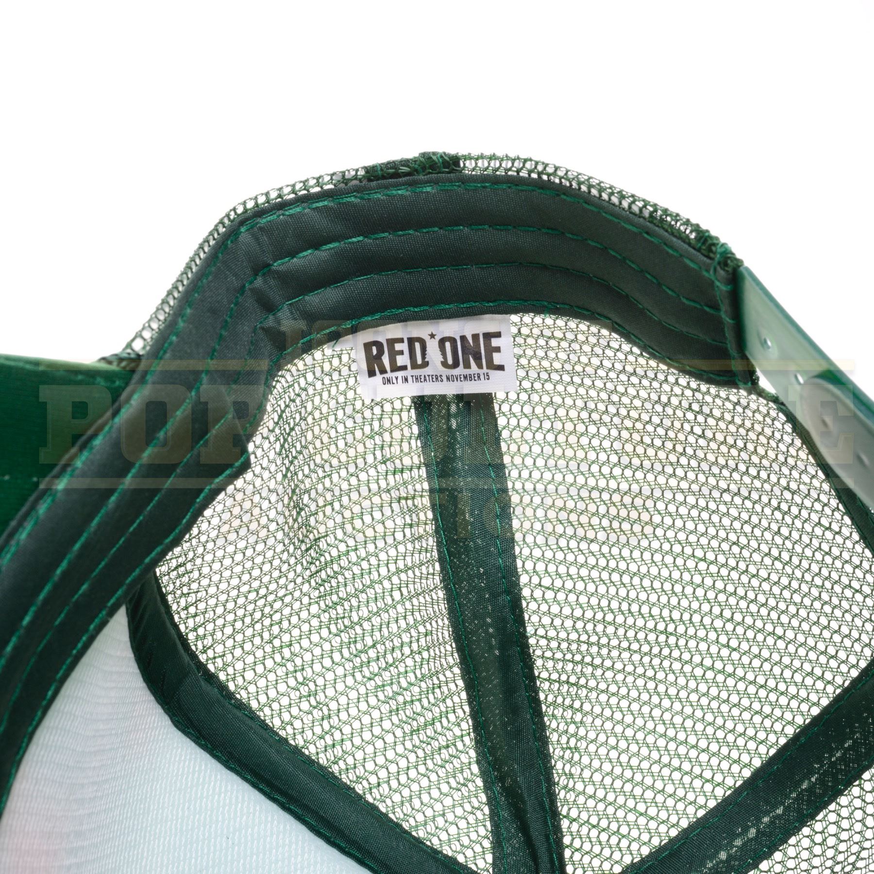 This green trucker-style cap features a holiday sweater–inspired design across the front, emblazoned with the film’s bold red title “RED ONE”. The mesh back includes an adjustable snap closure, and the interior bears an official studio production tag reading “RED ONE - Only in Theaters November 15.”