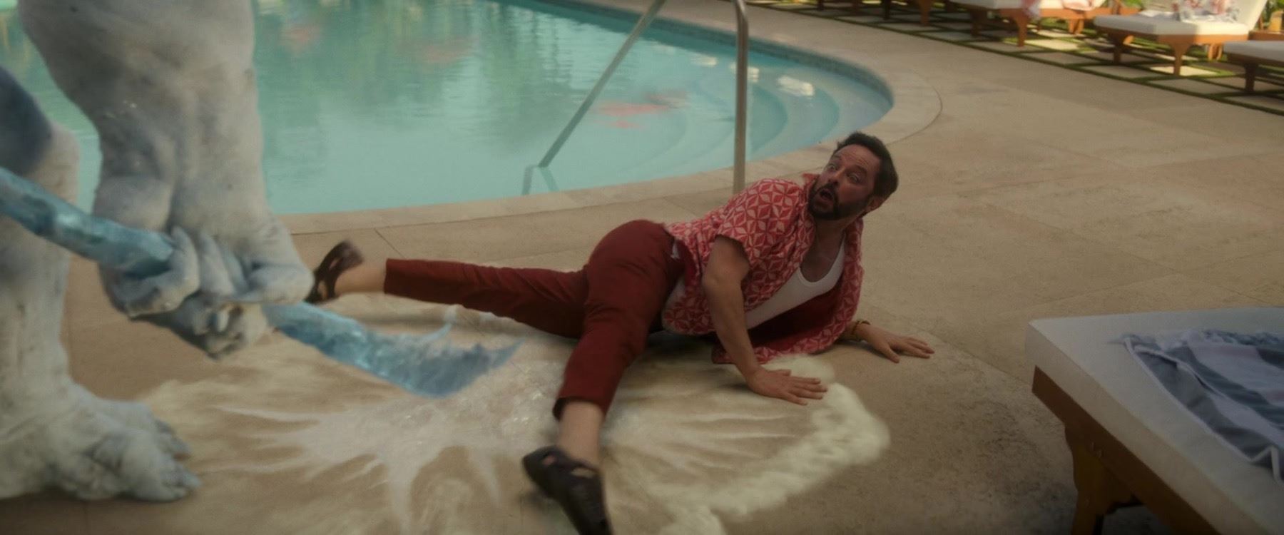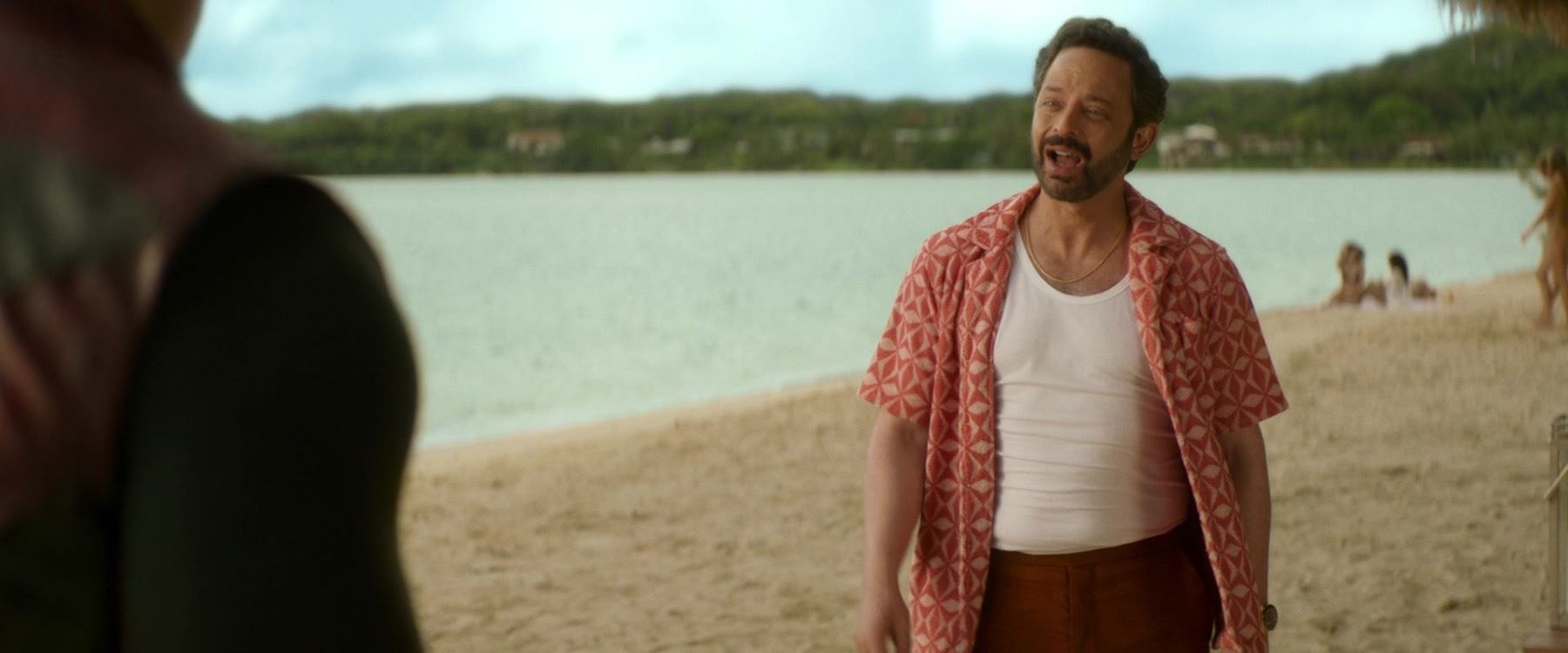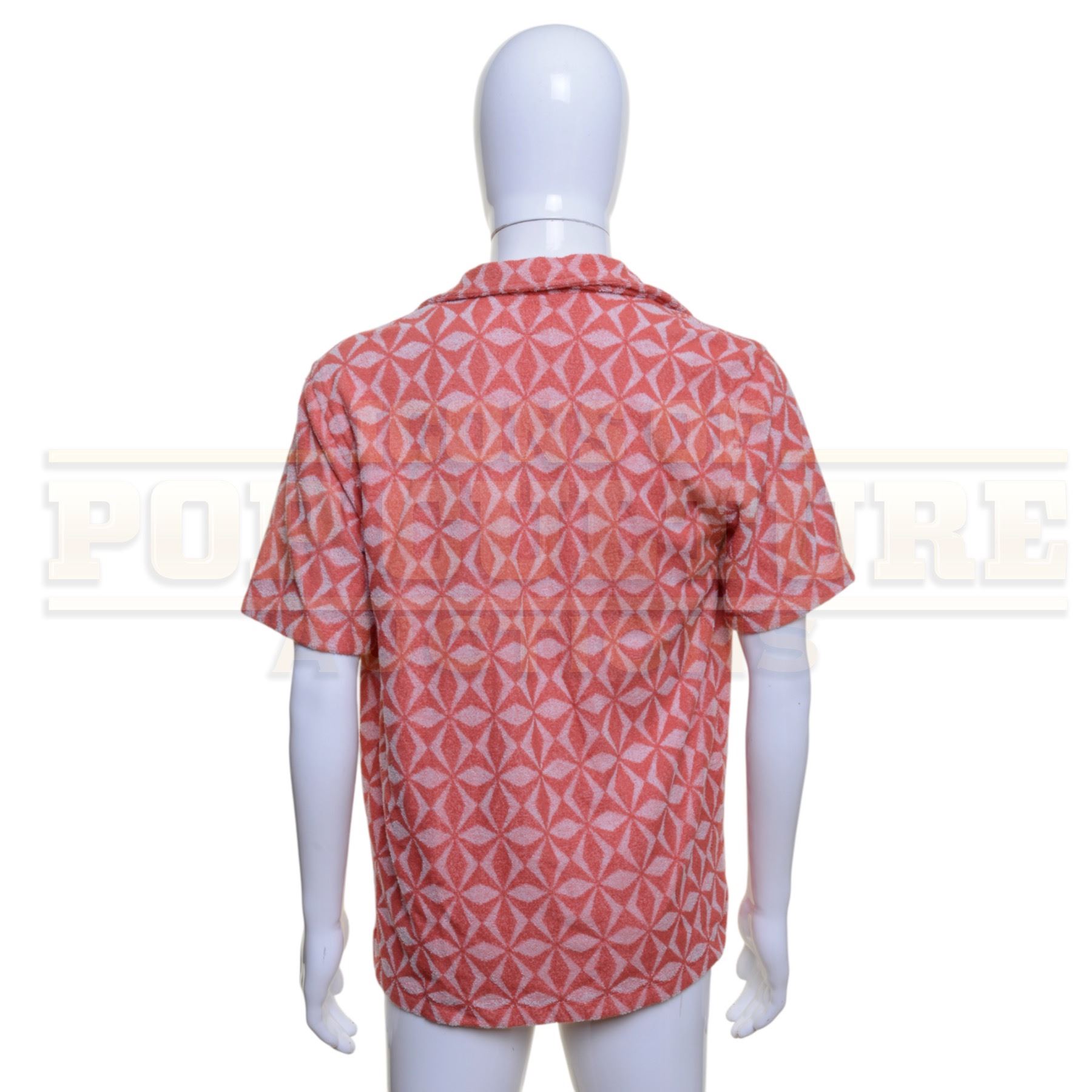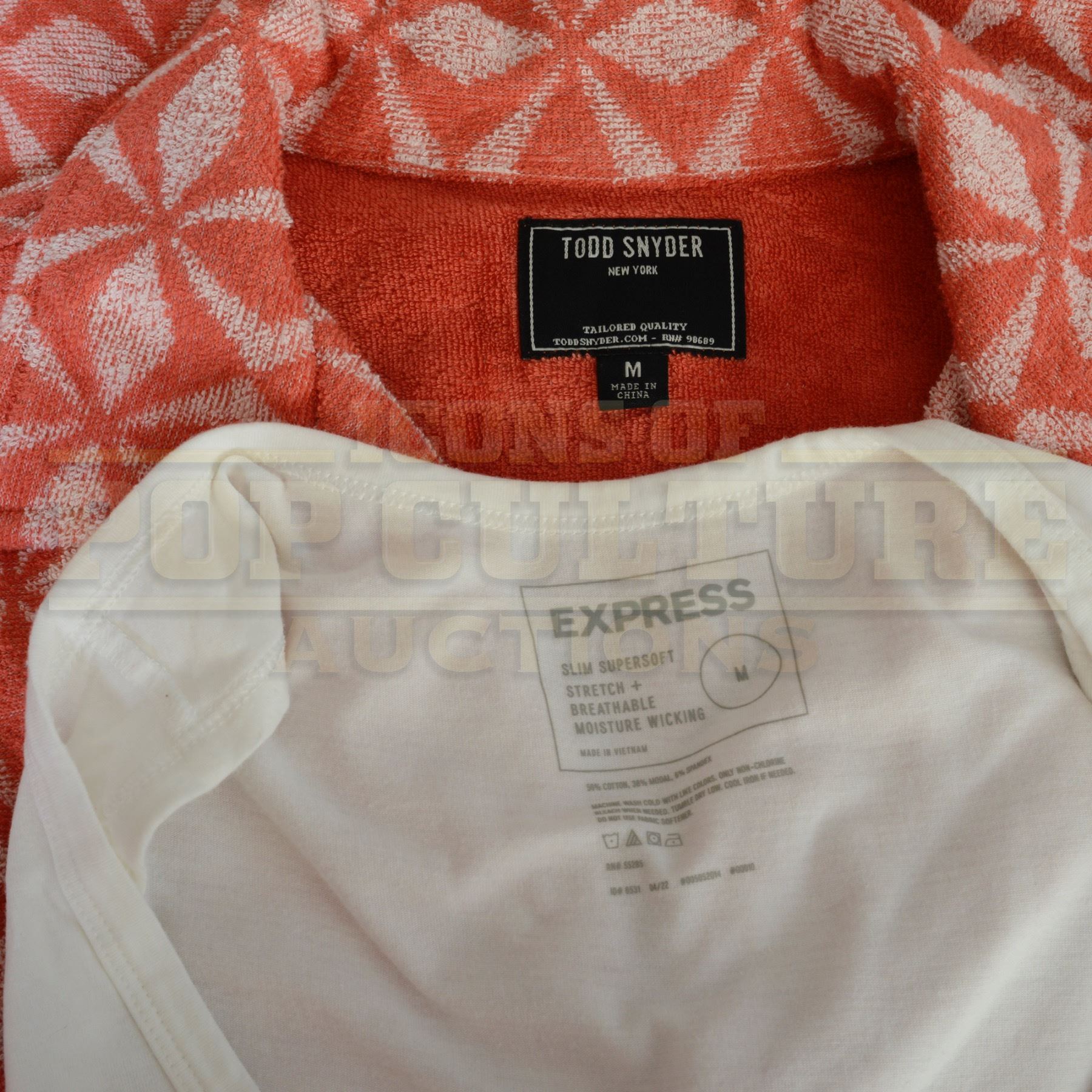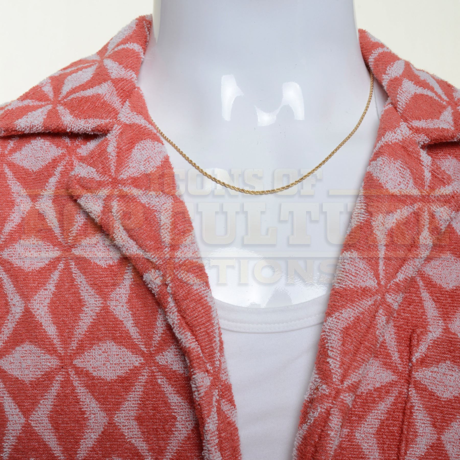 The costume includes a red-and-white geometric patterned short-sleeve shirt (brand: Todd Snyder New York), paired with a white slim-fit T-shirt (brand: Express), and a gold-tone chain necklace that adds a touch of personality and charm to the look. The shirt’s textured pattern and soft tailoring capture Ted’s confident yet laid-back vibe, fitting the film’s mix of holiday spirit and high-energy action.