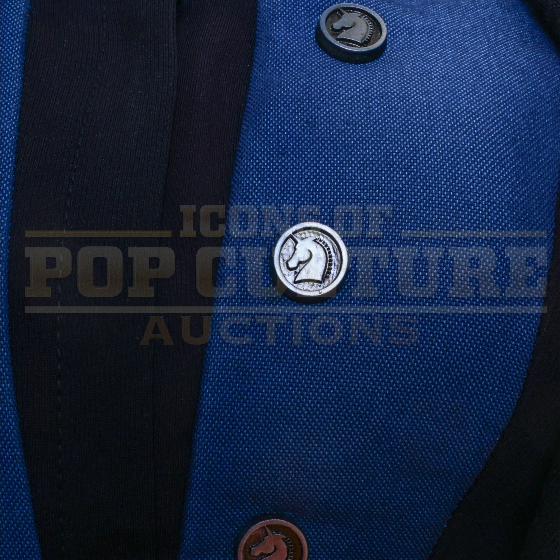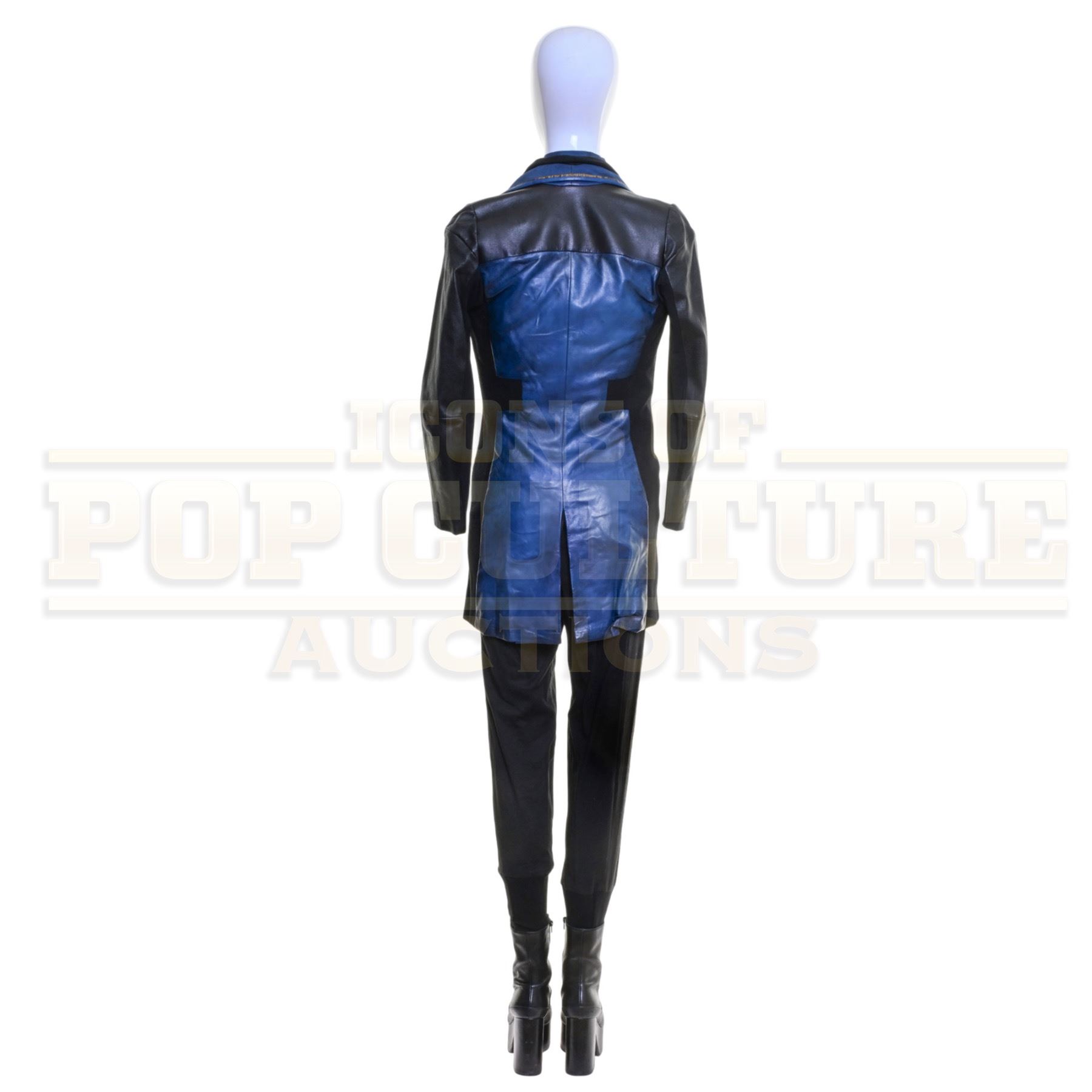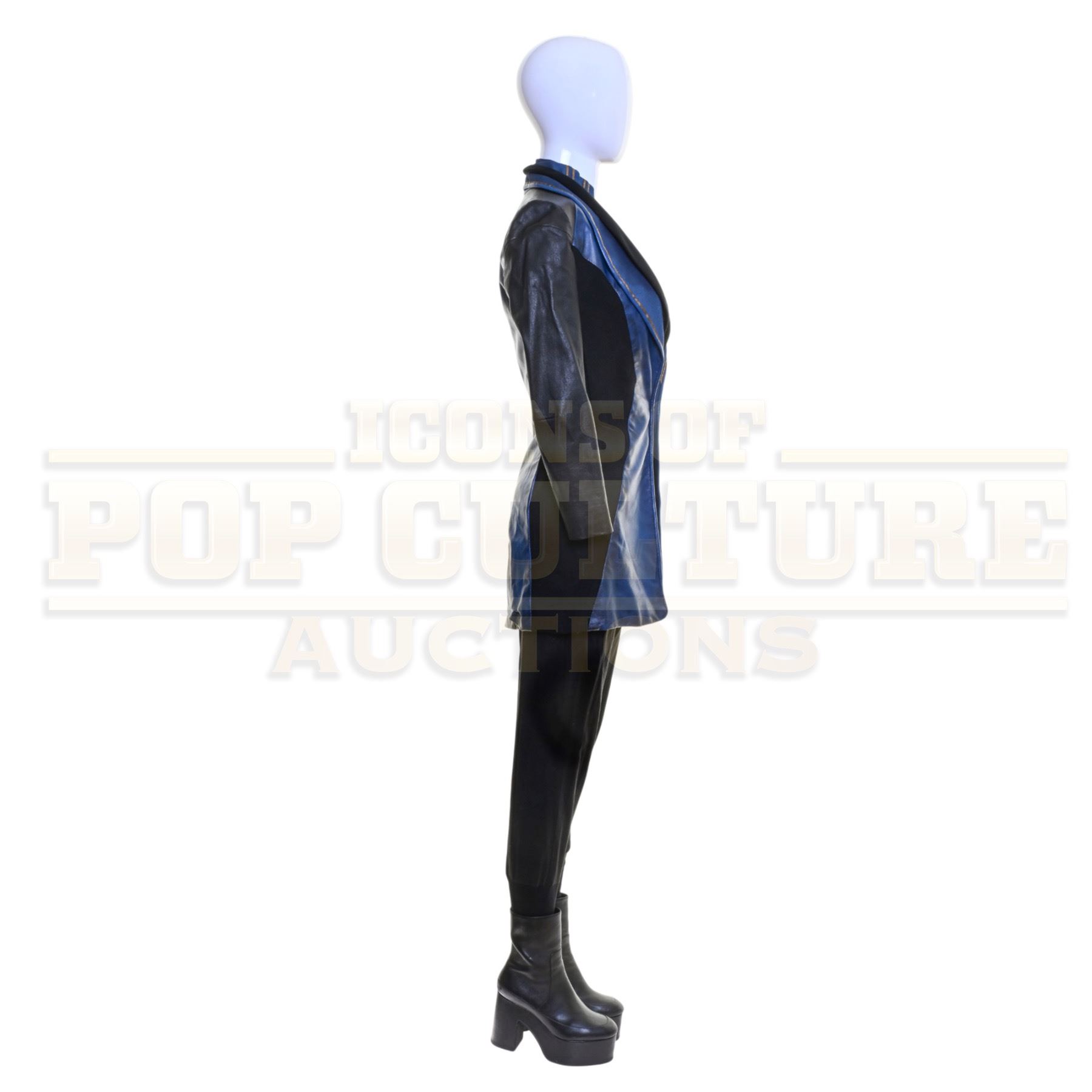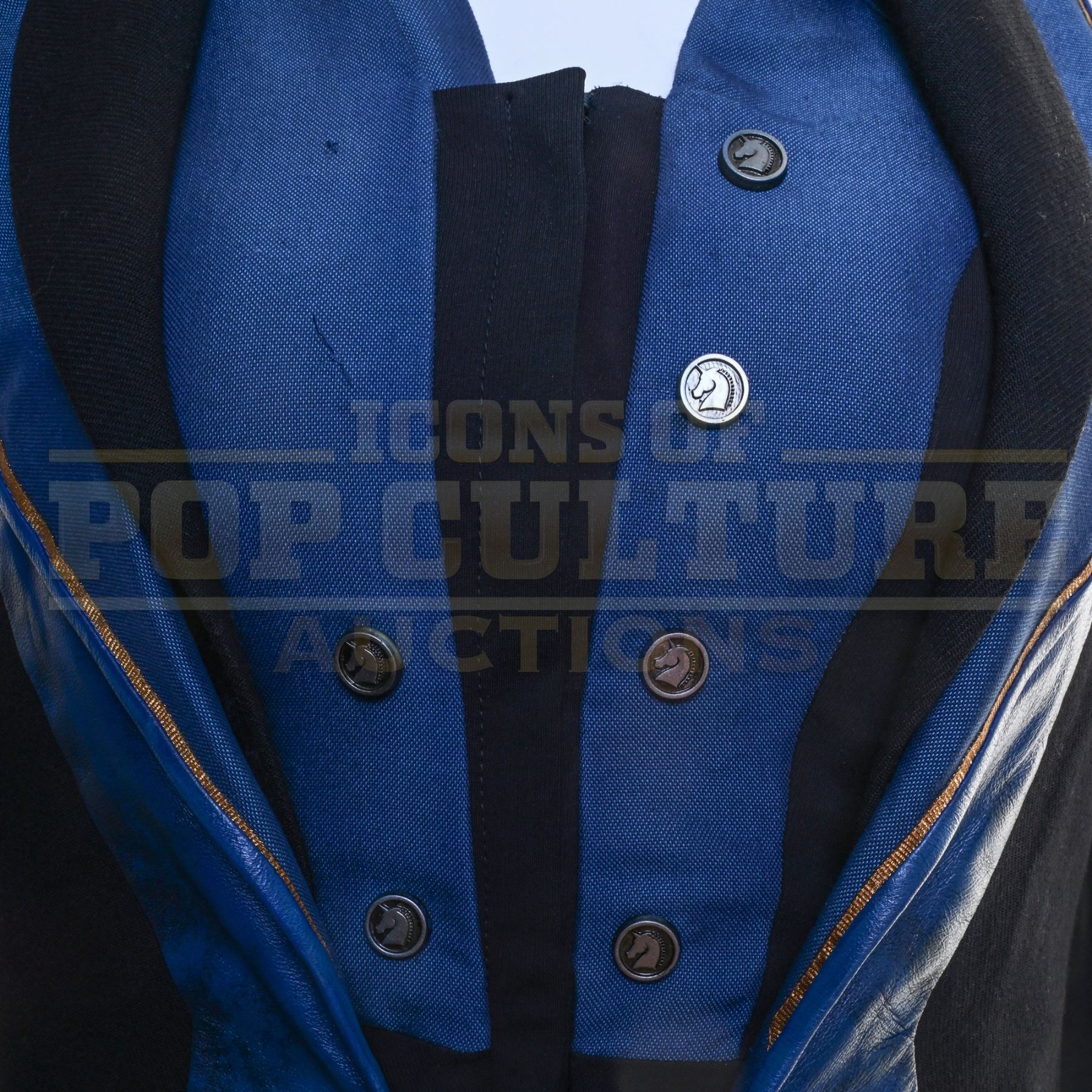 This costume was acquired and custom-tailored for Lucy Liu in her role as the formidable Zoe in the holiday action adventure Red One. Designed to reflect Zoe’s sleek authority and stylish tactical edge, the ensemble features a sharply cut long jacket with contrasting blue and black paneling, paired with a matching blue vest and shirt, each adorned with the film’s signature reindeer insignia buttons, a recurring emblem of the North Pole command structure.
