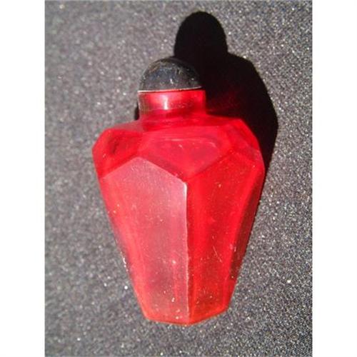 Red Peking glass snuff bottle with a geometric design. A black Peking glass stopper complements this exquisite pate du verre art glass snuff bottle. Height: 2.8" (7 cm.). Estimated retail value: $650.