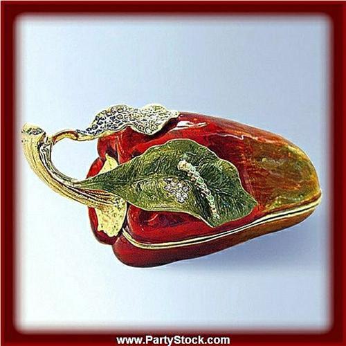 Red Pepper W/Worm Box is set with genuine, sparkling Swarovski crystals and detailed in 24K gold! Perfect for jewelry, trinkets or other keepsakes. Please see dimensions and more information below. Arrives in padded Presentation Box, with a Certificate of Authenticity.<BR><BR>Each of these items is meticulously crafted from fine pewter. Then, most are embellished or coated in solid 24 Karat Gold. Finally, the piece is hand enameled and lavishly inlaid with genuine Swarovski crystals by skilled artisans. Many of our collectibles are lined in velvet or fitted with ring inserts to make a most splendid jewelry presentation. A ll pieces are finished on the inside with a sparkling, swirled enamel. Our collection adds the definitive touch to any gift-giving occasion.A lso, this collection is issued in limited editions and will become a valuable keepsake to those who possess them, for years to come<BR><BR>Height: 2 inch <BR>Width: 4.25 Inch