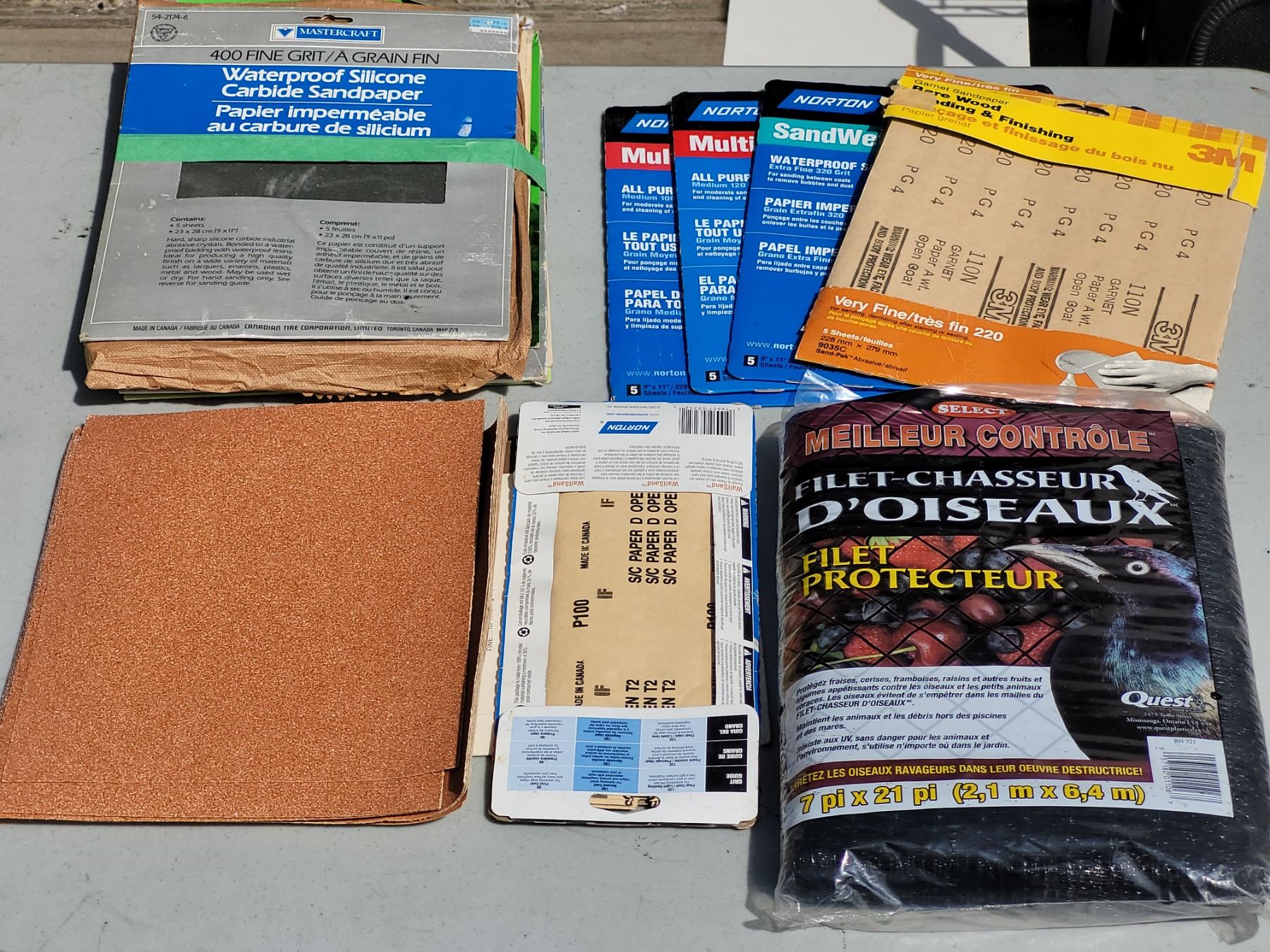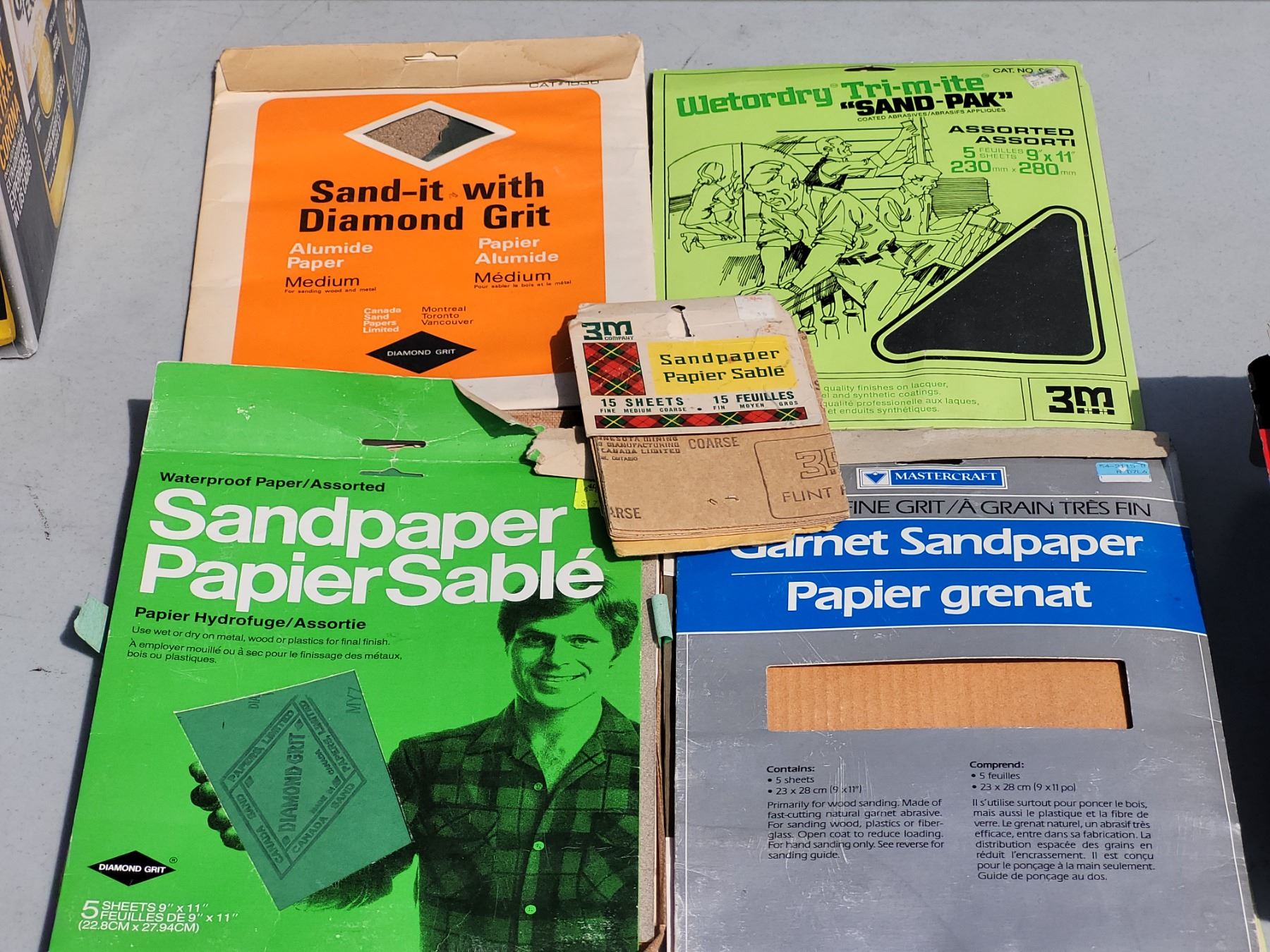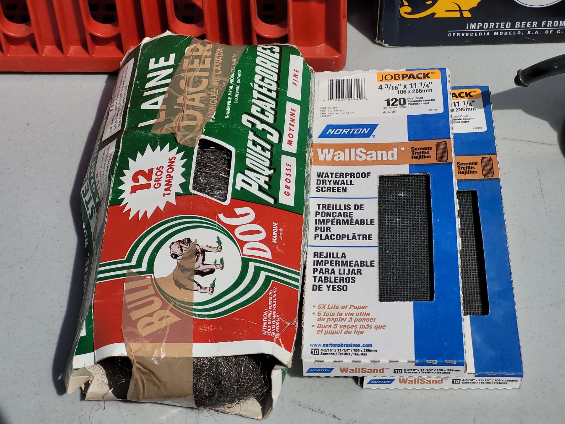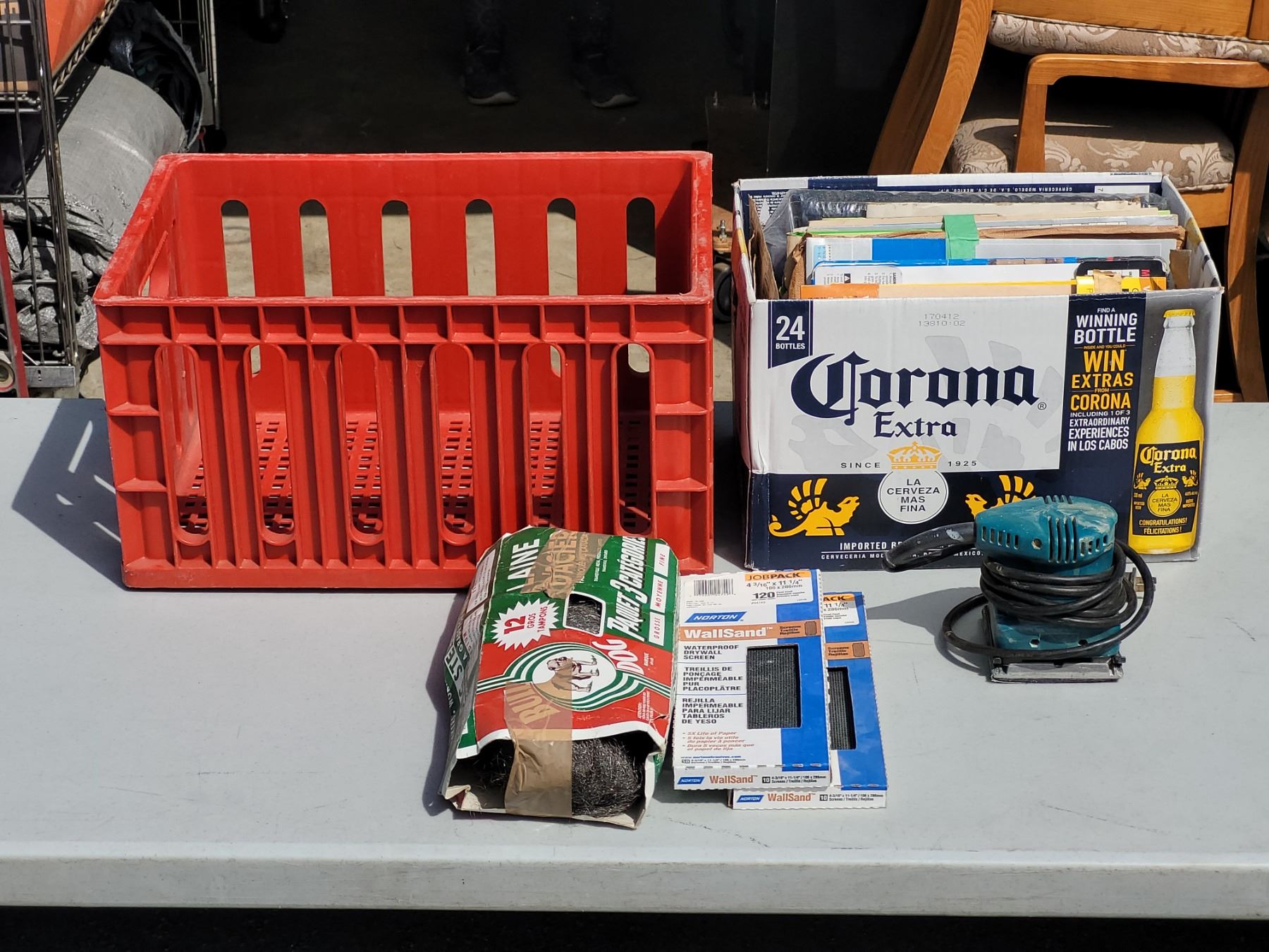 Red Pop Crate with Large Amount of Sanding Paper, Palm Sander +