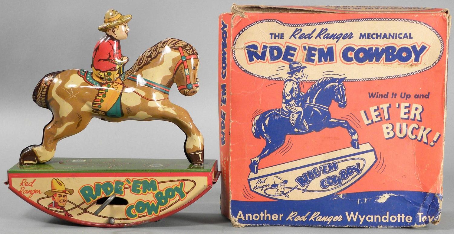 Red Ranger Ride'em Cowboy Tin Wind-up Toy in original box. Wyandotte Toy No. 515. Wyandotte Toy Company, Wyandotte, Michigan. USA. Toy in excellent condition, box tattered and complete but flaps are detached otherwise fair condition. Start Price $100