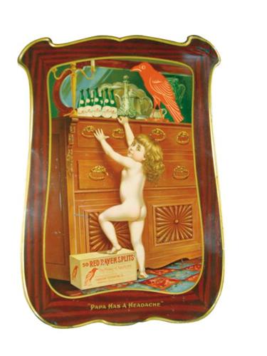 Red Raven Splits Embossed Die Cut Self Framed Tin Sign, entitled Papa Has A Headache. Extremely Rare. Some edge wear, minor dents at 1:00/5/6/7 and minor scratches otherwise Very Good condition. 19 X 27 inches.
