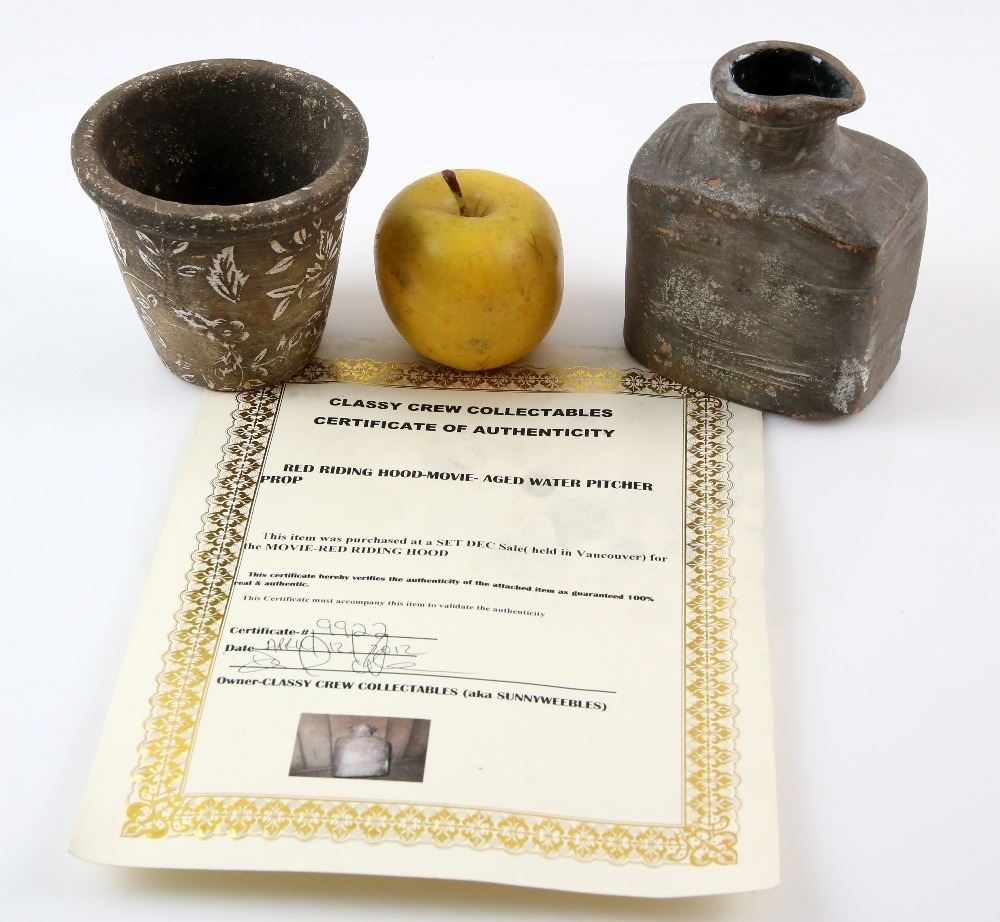 Red Riding Hood (2011) - Props from the movie including ceramic pot, ceramic water pitcher and apple from the movie starring Amanda Seyfried, the pot and pitcher with certificates of authenticity, the pitcher 14cm high..