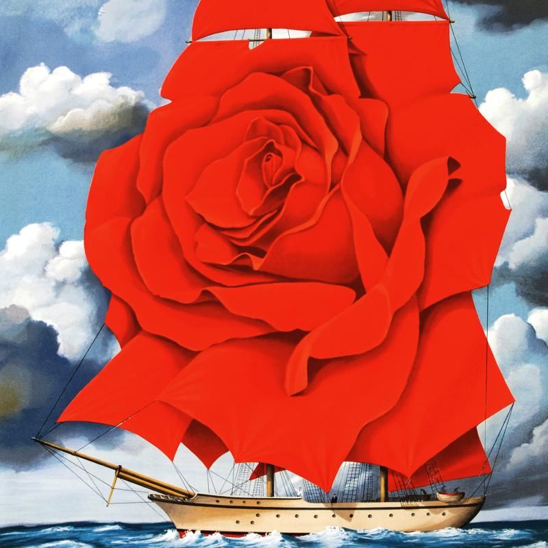"Red Rose Ship" is a limited edition hand pulled original lithograph on museum quality deckle-edge paper, numbered and hand signed by Rafal Olbinski. Includes Certificate of Authenticity! Measures approx. 26.5" x 38" (with border), 22.5" x 33.5" (image). This lithograph was created on a rare antique Marinoni Voirin French press that dates back to the 1800's. It provides highly pigmented inks that will resist fading and preserve the integrity of the print for more than a lifetime. This process is the most elaborate, costly and effective way to reproduce art while maintaining the brilliance and accuracy of the original creation.