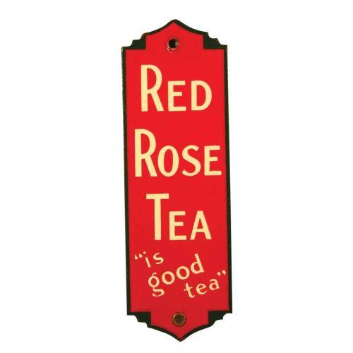 Red Rose Tea Die Cut Porcelain Door Push. Top grommet missing otherwise near mint condition. 3 X 9 inches.