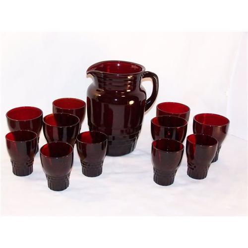 Large Ruby Whitehall Pitcher with 6 large tumblers and 5 small ones - I added the 5 small because its nice to have the large set - large tumblers are 4.0 high by 3.25 wide small tumblers are 3.50 high by 2.50 wide only slight wear- deep rich color no chips,cracks,repairs on any piece!!!!!!!!!!<P>Antique & Collectible Glass! Find Your Treasure at www.GlassCatastrophe.Net </P>