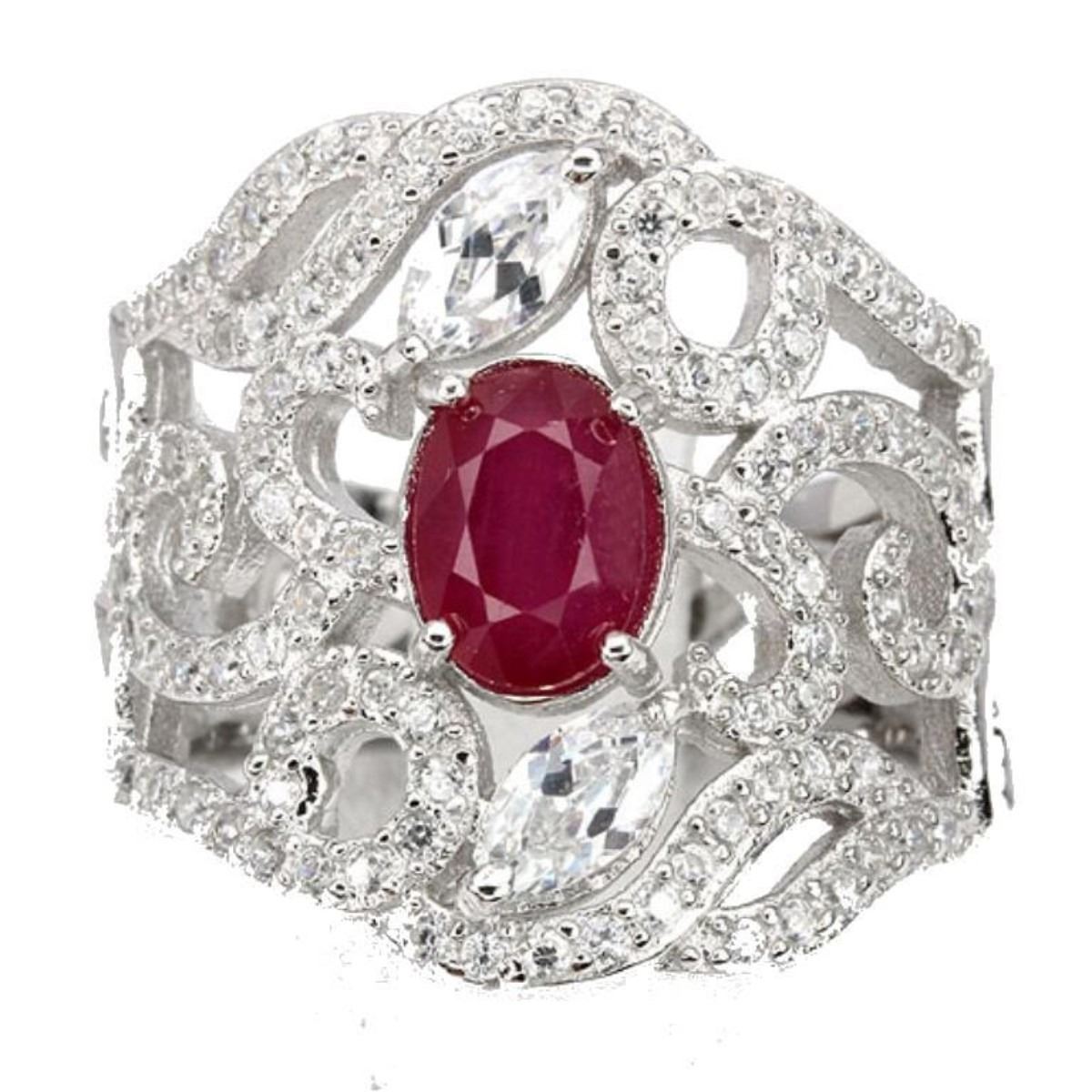 1.6ct oval faceted red ruby ( 5 X 7mm ) surrounded by white CZ's set into a sterling silver with 14kt white gold plate. Size 6.