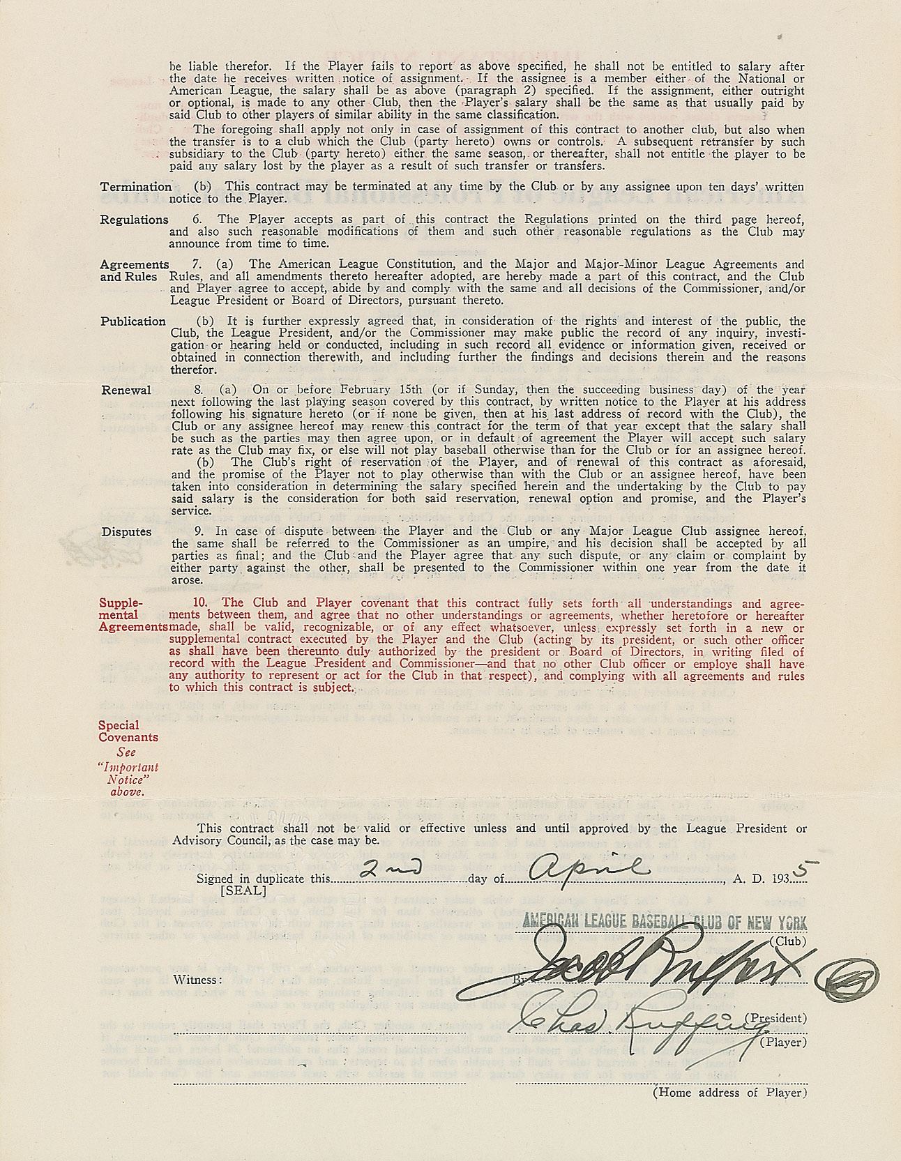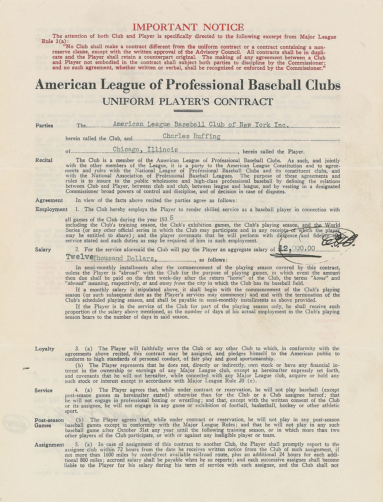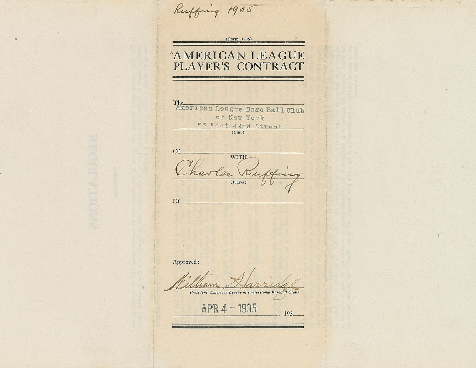 Contract, signed “Chas. Ruffing,” four pages on two adjoining sheets, 8.5 x 11, April 2, 1935. American League uniform player's contract in which Red Ruffing agrees to render "skilled service as a baseball player in connection with all games of the Club during the year 1935" for the New York Yankees, for a salary of $12,000. Signed at the conclusion in fountain pen by Ruffing, and countersigned by Yankees Owner Jacob Ruppert. The reverse is signed by American League President William Harridge. In fine condition.