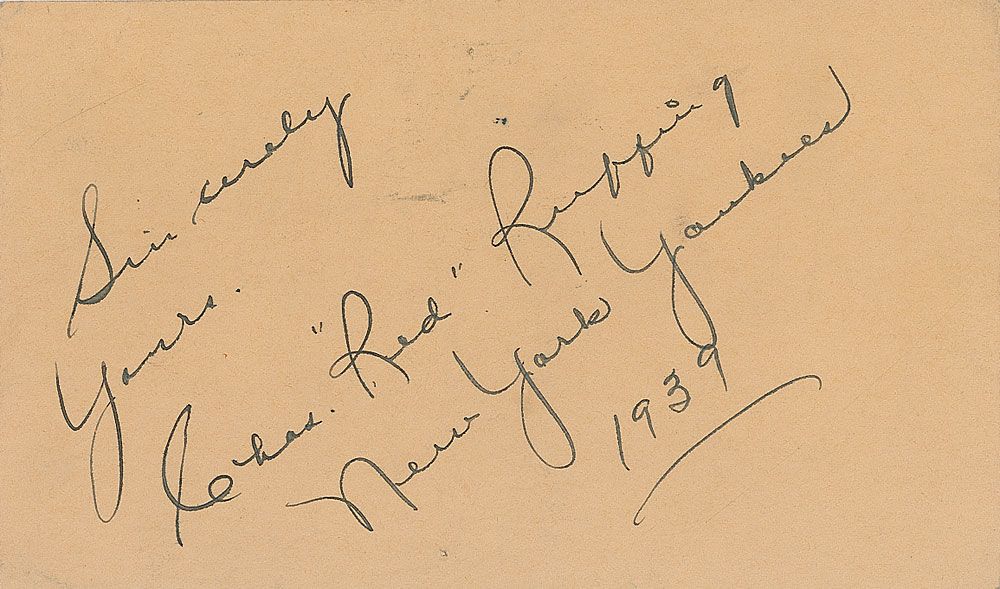 Crisp vintage fountain pen signature, “Sincerely yours, Chas. ‘Red’ Ruffing, New York Yankees, 1939,” on an off-white 5.5 x 3.25 government postcard. In fine condition.