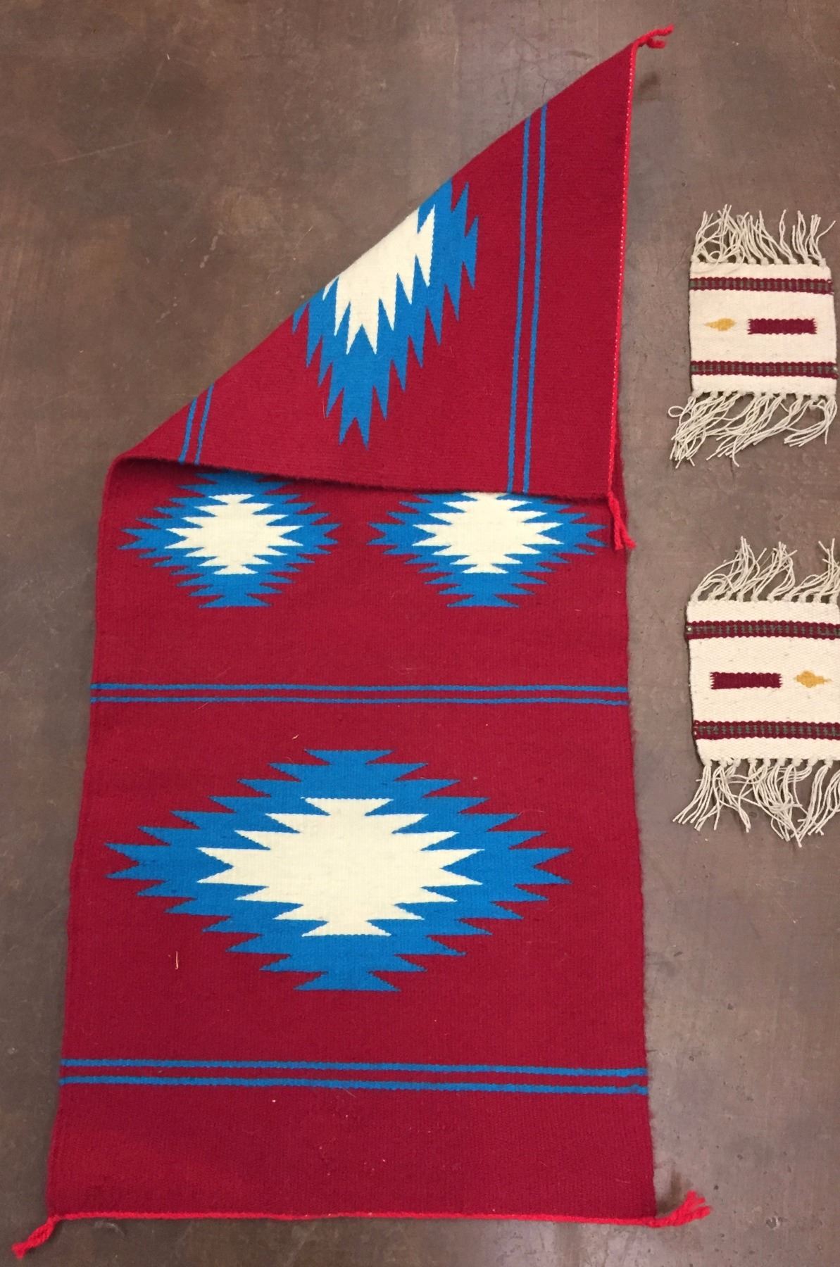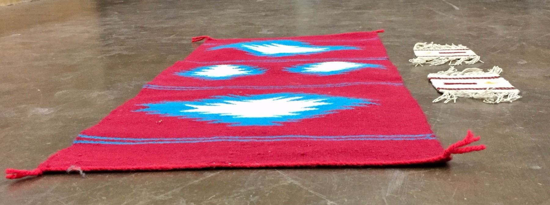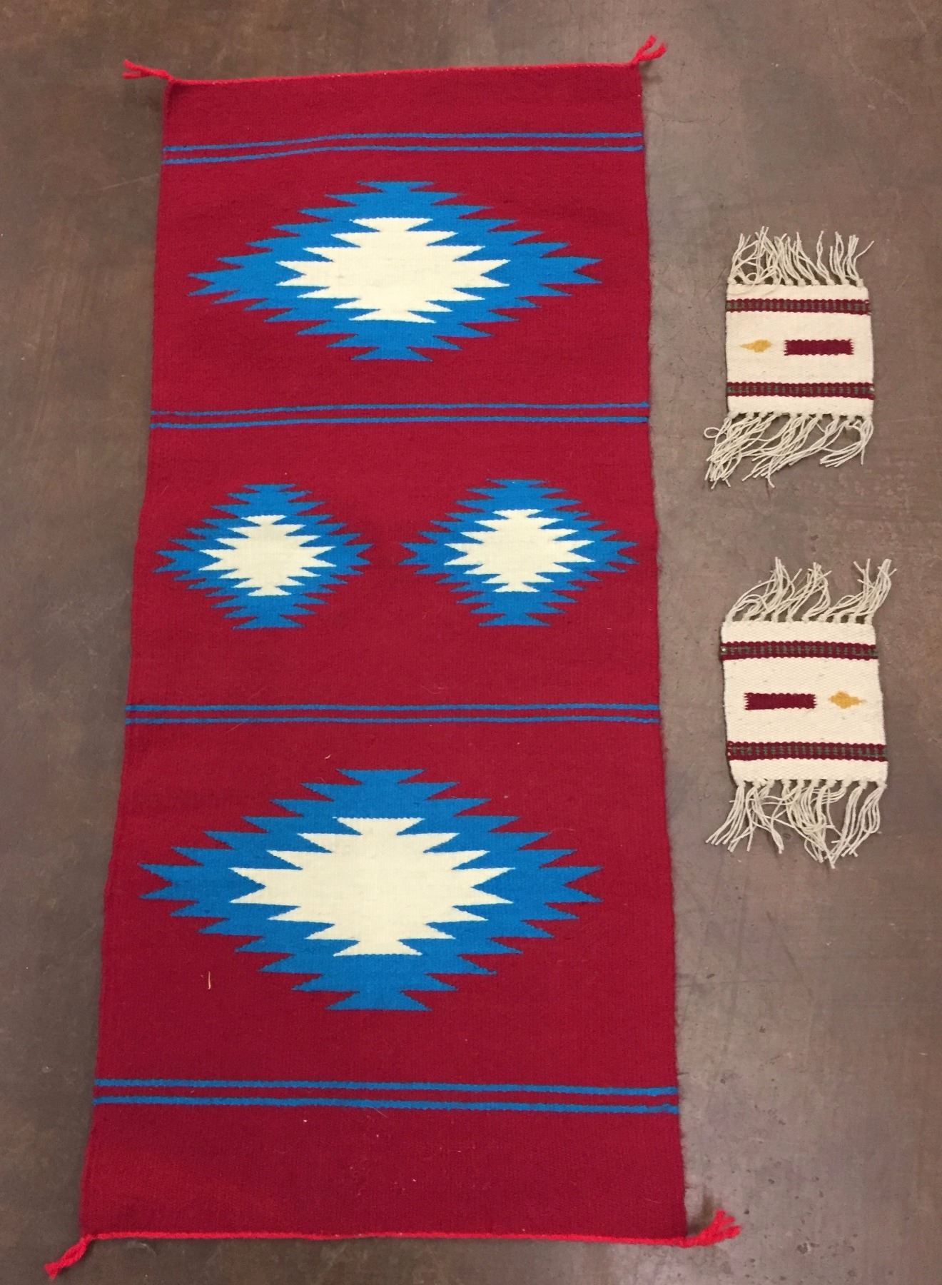 Description: Red runner and 2 handwoven coasters. Maker: Unknown weavers. Approx. Age: Circa 1980s. Size: 1) Measures 15 1/2" x 36" 2) Measures 4 1/2" x 5" 3) Measures 4 1/2" x 36". Condition: Good for their age, normal wear expected. Please look closely at the pictures - they are an important part of our description. Shipping: There will be a $5 handling / packaging fee for shipping this lot. The actual cost of postage will be added on top of that.