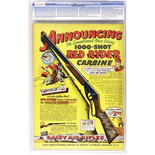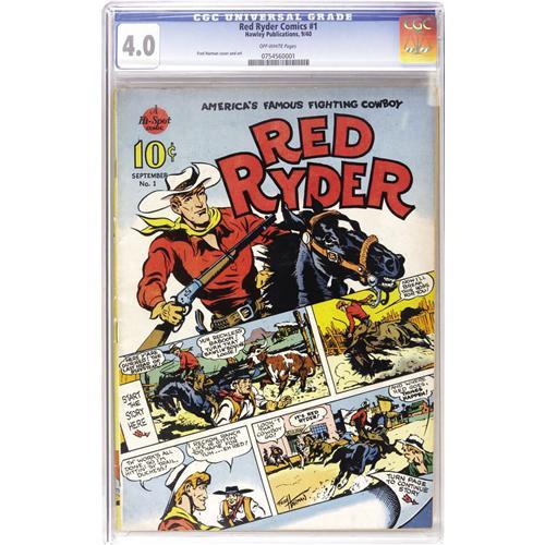 <B>Red Ryder Comics #1 (Dell, 1940) CGC VG 4.0 Off-white pages.</B></I> After several failed business ventures, Fred Harman hit gold in 1938 with the "Red Ryder & Little Beaver" comic strip. Red Ryder became an overnight sensation and logically ended up in the comic book format with this issue. The title managed a 17-year run of its own, beginning with this eye-catching cover from Fred Harman, who created 110 of the 151 covers, as well as the interior artwork for the first 99 issues. Overstreet 2006 VG 4.0 value = $600. CGC census 7/06: 1 in 4.0, 7 higher. <BR><BR><B>Important notice:</B> Heritage usually auctions material at the rate of 200-250 lots per hour. On some occasions eBay Live bid software or the Internet may not be able to keep up with the pace of the auction. We recommend placing a realistic absentee bid now as insurance to avoid disappointment. Occasionally the auctioneer may eliminate or reject an eBay Live bid, and the auctioneer may also reopen a lot after the close of the eBay live bidding (usually because we missed an audience bid), and may reject your bid even if it shows you as the winning bidder. By bidding via eBay Live, you agree that Heritage may award the lot to another bidder at its sole discretion under the circumstances described above or any other reasonable circumstances. Since eBay bids are not shown to us until we open the lot on the floor, we treat those bids just like floor bids. In most cases the floor responds before the eBay bid is presented to us, due to Internet lag time, so for consistency we have made it a policy that floor bids are always considered first over tie eBay live bids. Also please note that all Heritage lots purchased through eBay Live carry a 22.5% Buyer's Premium. Please make sure you read the Terms and Conditions before you bid. This lot is being auctioned in conjunction with a live floor auction by Heritage Auction Galleries. All final auction and invoice information will be supplied by Heritage Auction Galleries, and all other information should be considered preliminary. Lot:41001 <BR><BR><B>Winning Notification and Billing:</B> After the FINAL session in this auction is complete, Heritage will send e-mail and snail mail invoices. This process normally takes several days. All final auction and invoice information will be supplied by Heritage Auction Galleries, and all other information should be considered preliminary. <BR><BR>This auction will be conducted on a live auction floor and over the Internet through eBay Live. If you choose to place an absentee bid, please take a moment to <font color='#0000ff'><u><a href='http://pages.ebay.com/liveauctions/help/before/laabsentee.html'>learn how eBay Live absentee bidding works</a></u></font><font color='#000000'>