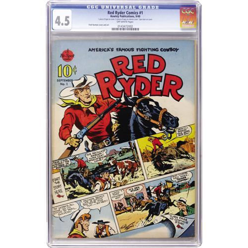<B>Red Ryder Comics #1 (Dell, 1940) CGC VG+ 4.5 Off-white.</B></I> The first issue of the series reprinted strips by Fred Harmon, who contributed the cover. The first meeting between Red and Little Beaver is included. CGC notes, "1 piece of tape on cover. 2 pieces of tape on interior cover. Tape stain on cover." Overstreet 2006 VG 4.0 value = $600. CGC census 3/07: 4 in 4.5, 4 higher.<BR><BR><b>Shipping:</b> Comics - Slabbed (certified) (<a target="_blank" href="http://www.heritageauctions.com/common/shipping.php">view shipping information</a>)