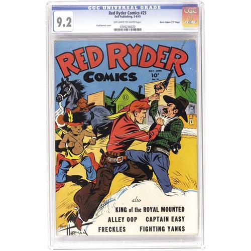 <B>Red Ryder Comics #25 Davis Crippen ("D" Copy) pedigree (Dell, 1945) CGC NM- 9.2 Off-white to white pages.</B></I> We've seen plenty of high-grade Dells lately, but we'd say nobody's seen a nicer copy of this issue. The titular hero is joined by strip favorites Alley Oop and Captain Easy. Overstreet 2006 NM- 9.2 value = $265. CGC census 6/06: 1 in 9.2, none higher. <I>From the Crippen Collection.</B></I> <BR><BR><B>Important notice:</B> Heritage usually auctions material at the rate of 200-250 lots per hour. On some occasions eBay Live bid software or the Internet may not be able to keep up with the pace of the auction. We recommend placing a realistic absentee bid now as insurance to avoid disappointment. Occasionally the auctioneer may eliminate or reject an eBay Live bid, and the auctioneer may also reopen a lot after the close of the eBay live bidding (usually because we missed an audience bid), and may reject your bid even if it shows you as the winning bidder. By bidding via eBay Live, you agree that Heritage may award the lot to another bidder at its sole discretion under the circumstances described above or any other reasonable circumstances. Since eBay bids are not shown to us until we open the lot on the floor, we treat those bids just like floor bids. In most cases the floor responds before the eBay bid is presented to us, due to Internet lag time, so for consistency we have made it a policy that floor bids are always considered first over tie eBay live bids. Also please note that all Heritage lots purchased through eBay Live carry a 22.5% Buyer's Premium. Please make sure you read the Terms and Conditions before you bid. This lot is being auctioned in conjunction with a live floor auction by Heritage Auction Galleries. All final auction and invoice information will be supplied by Heritage Auction Galleries, and all other information should be considered preliminary. Lot:41001 <BR><BR><B>Winning Notification and Billing:</B> After the FINAL session in this auction is complete, Heritage will send e-mail and snail mail invoices. This process normally takes several days. All final auction and invoice information will be supplied by Heritage Auction Galleries, and all other information should be considered preliminary. <BR><BR>This auction will be conducted on a live auction floor and over the Internet through eBay Live. If you choose to place an absentee bid, please take a moment to <font color='#0000ff'><u><a href='http://pages.ebay.com/liveauctions/help/before/laabsentee.html'>learn how eBay Live absentee bidding works</a></u></font><font color='#000000'>