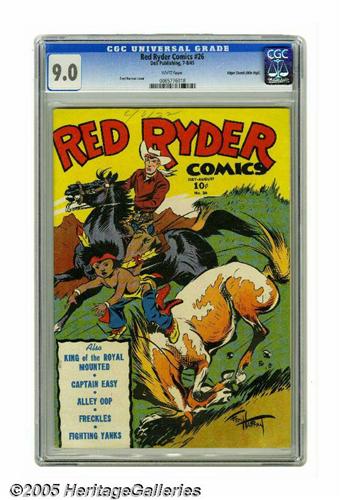 <B>Red Ryder Comics #26 Mile High pedigree (Dell, 1945) CGC VF/NM 9.0 White pages.</B></I> Little Beaver gets airborne courtesy of a bucking bronco on this Fred Harman cover. And while this Edgar Church Mile High example may not meet the ultra high standards of most of the books from that collection, CGC currently shows no other copy with a higher grade. In fact, there are only two copies of this issue listed! Overstreet 2005 VF/NM 9.0 value = $186; NM- 9.2 value = $250. CGC census 7/05: 2 in 9.0, none higher.
