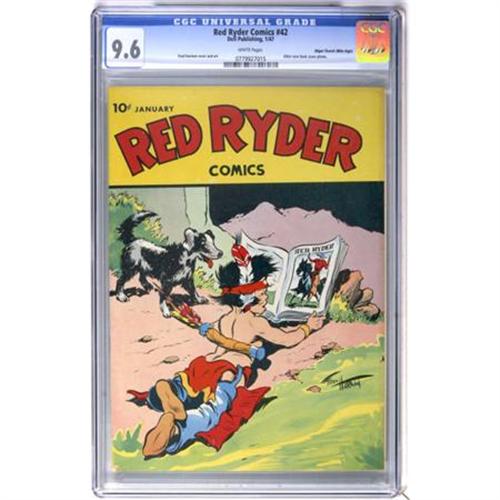 <B>Red Ryder Comics #42 Mile High pedigree (Dell, 1947) CGC NM+ 9.6 White pages.</B></I> Allan Lane back cover photo. Fred Harman cover and art. Overstreet 2007 NM- 9.2 value = $155. CGC census 6/07: 1 in 9.6, none higher.<BR><BR><b>Shipping:</b> Comics - Slabbed (certified) (<a target="_blank" href="http://www.heritageauctions.com/common/shipping.php">view shipping information</a>)